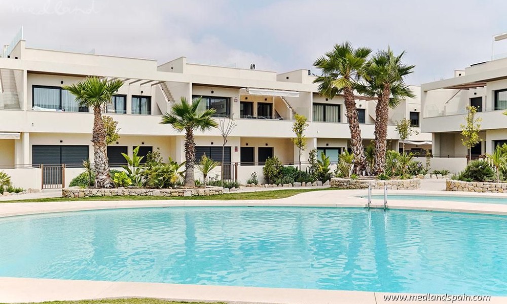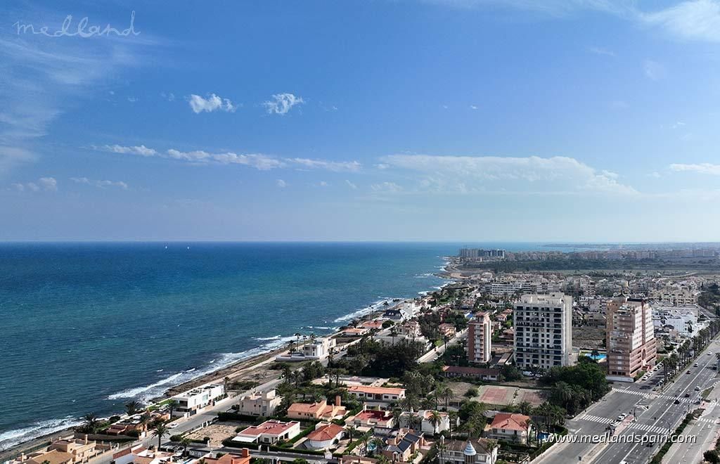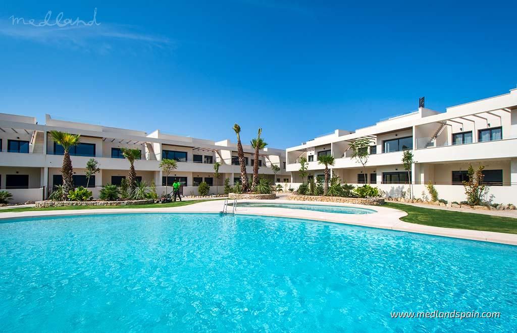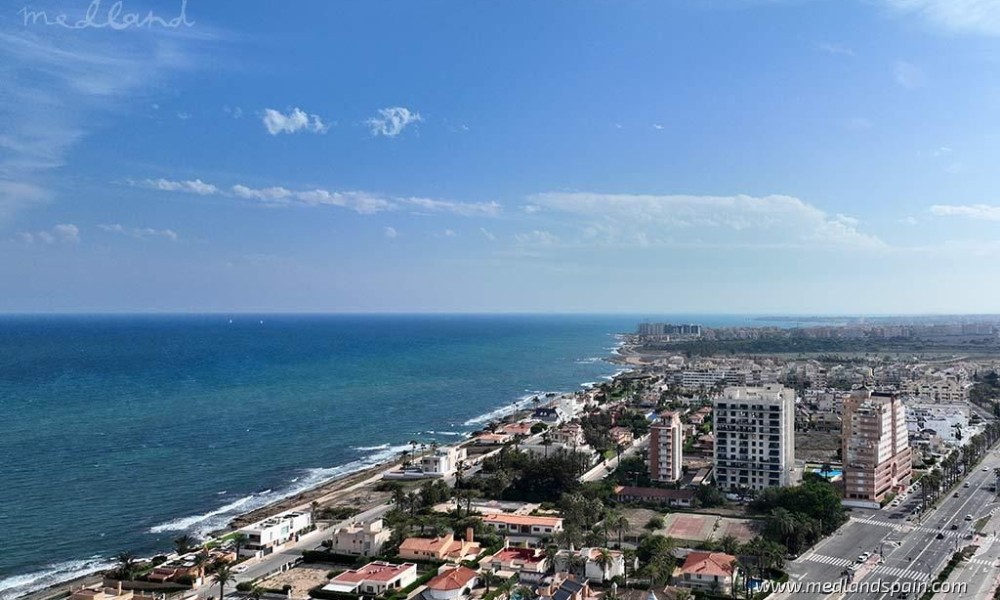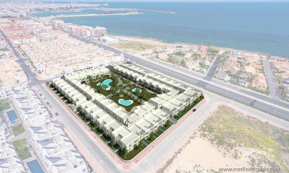 New apartment complex only 200m from the beach in La Veleta, a quiet residential area between the municipalities of Torrevieja and Orihuela Costa. Within walking distance of the complex is a wide variety of daily amenities, like supermarkets, post office, banks, shops, bars and restaurants. There are also two impressive outdoor shopping centres 10 minutes’ drive from the complex. Thanks to the mild Mediterranean climate, it is possible to enjoy many outdoor activities, like golf, tennis/padel, and water sports at the many Blue Flag beaches.Apartment complex, comprises apartment blocks in two levels, offering apartments with 2 or 3 bedrooms and 2 bathrooms, in a choice of models: ground floor with a large garden; or top floor with private solarium. Both models present an open-plan lounge, dining and kitchen area, opening onto a terrace.