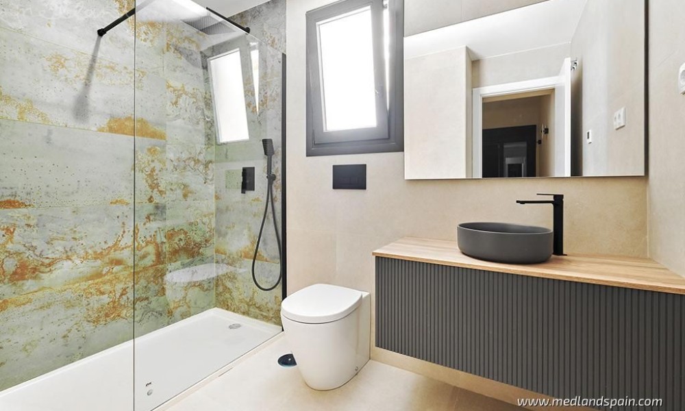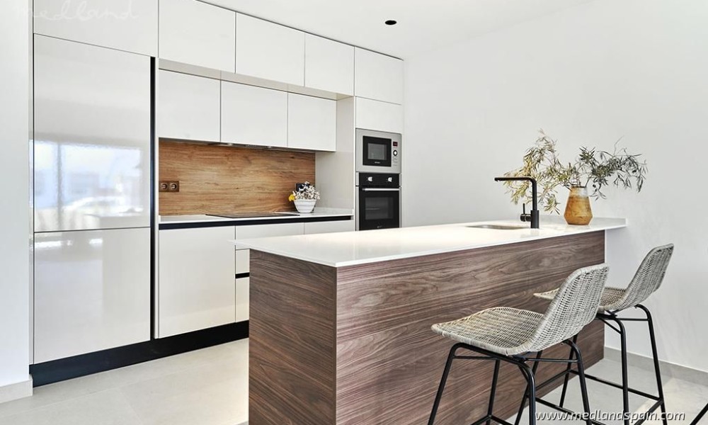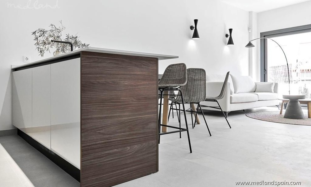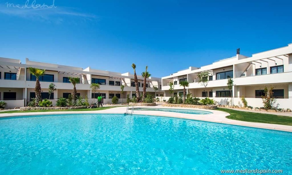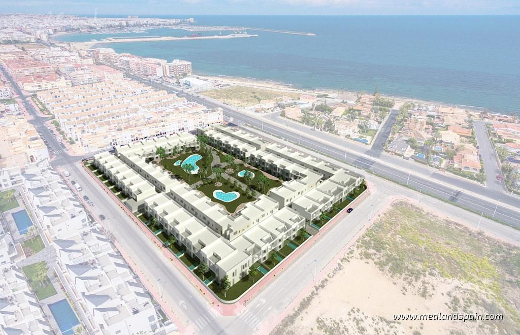 New apartment complex only 200m from the beach in La Veleta, a quiet residential area between the municipalities of Torrevieja and Orihuela Costa. Within walking distance of the complex is a wide variety of daily amenities, like supermarkets, post office, banks, shops, bars and restaurants. There are also two impressive outdoor shopping centres 10 minutes’ drive from the complex. Thanks to the mild Mediterranean climate, it is possible to enjoy many outdoor activities, like golf, tennis/padel, and water sports at the many Blue Flag beaches.Apartment complex, comprises apartment blocks in two levels, offering apartments with 2 or 3 bedrooms and 2 bathrooms, in a choice of models: ground floor with a large garden; or top floor with private solarium. Both models present an open-plan lounge, dining and kitchen area, opening onto a terrace.