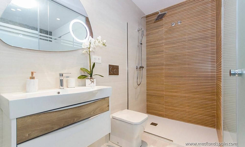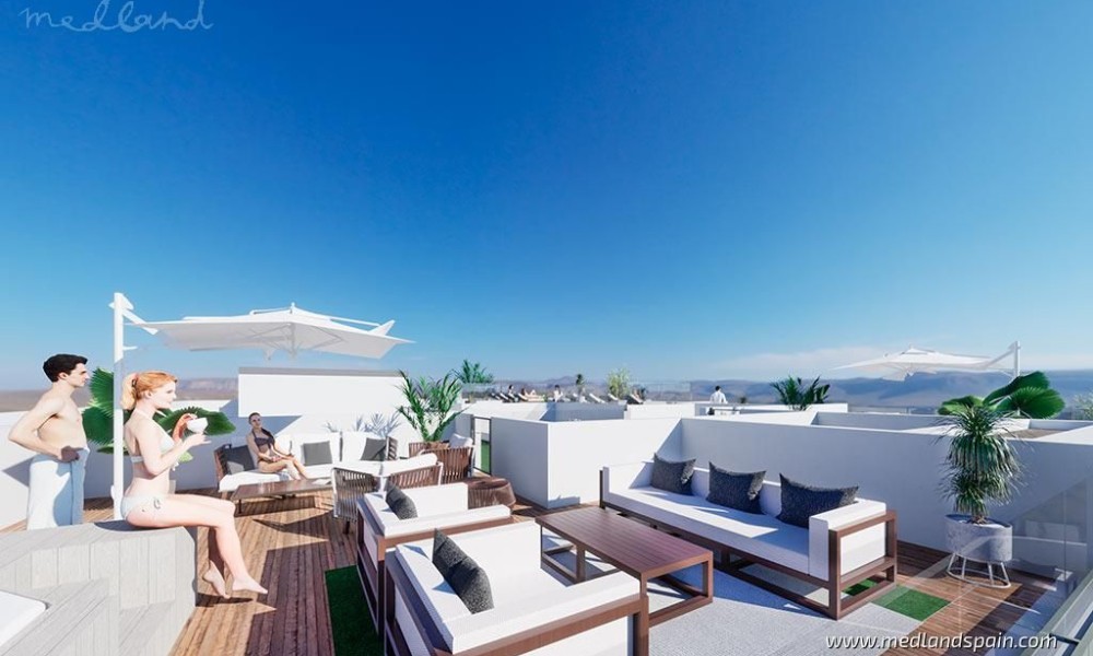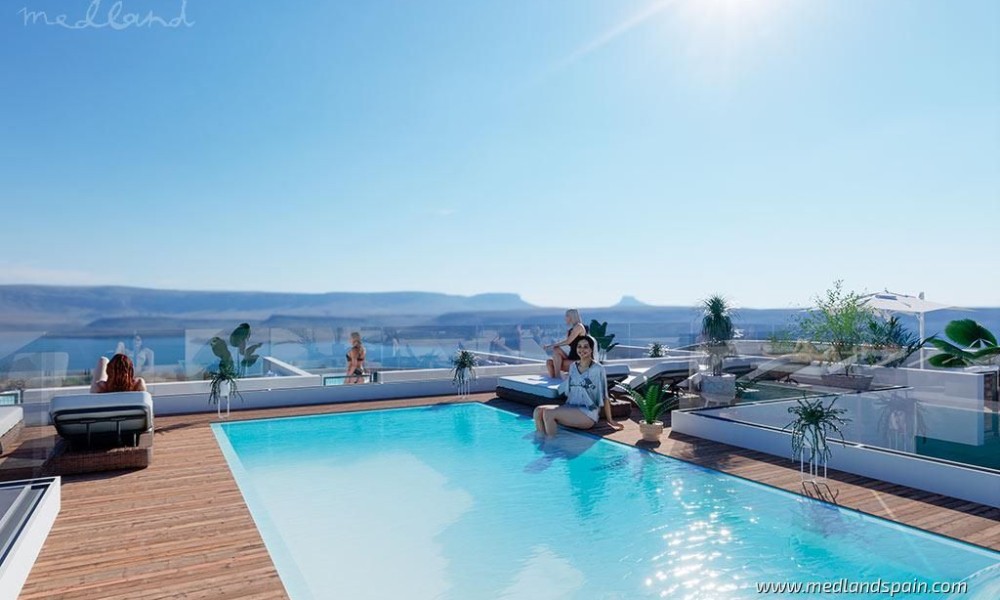 The project comprises modern apartments with 2 and 3 bedrooms and 2 bathrooms, with an open plan lounge, dining and kitchen area, which open onto a sunny terrace. The apartments include pre-installation for ducted A/C, fitted wardrobes, complete bathrooms, indoor and outdoor lighting, electric blinds, and a video intercom. For an additional price, it is possible to buy a parking space in the community underground car park.The community area, for all residents to enjoy, is on the roof of the building, with a pool, a sauna, a bathroom, and an outdoor shower. The penthouse apartments also have a private solarium space on the roof of the building.
