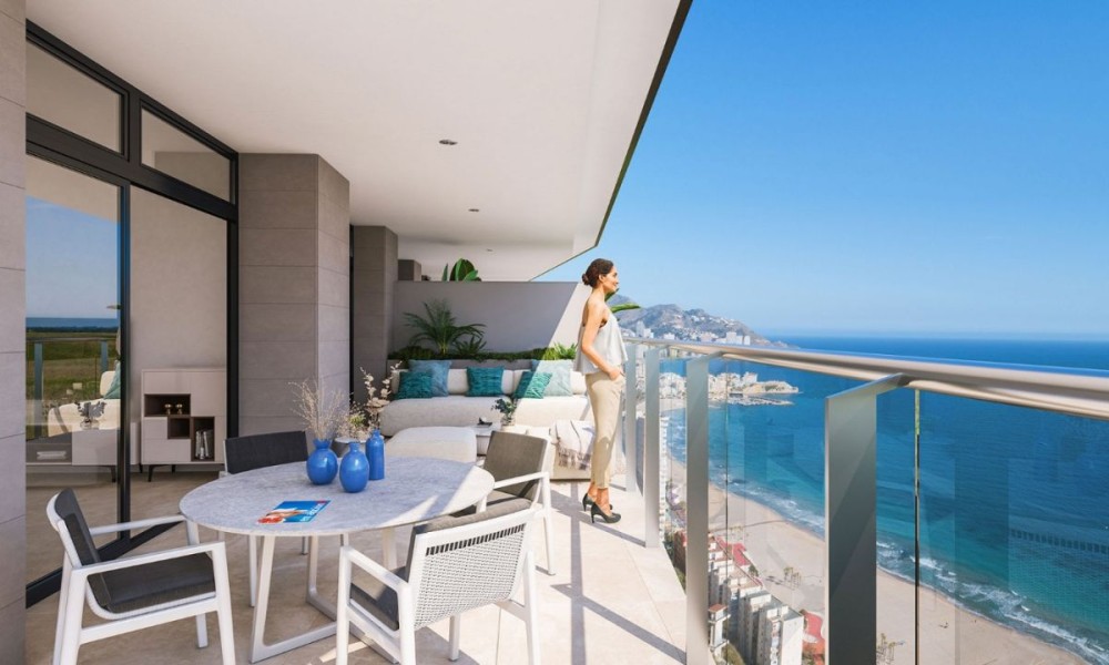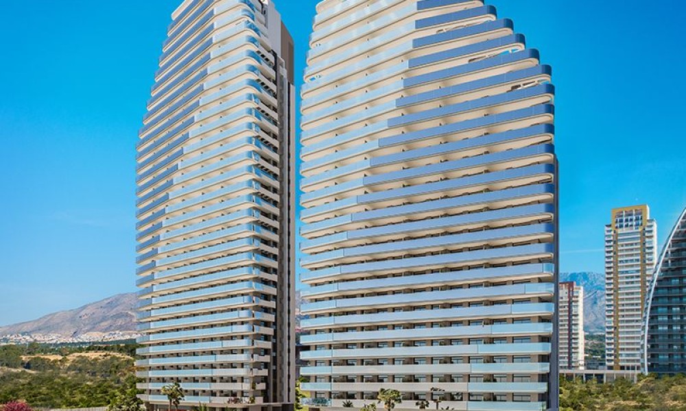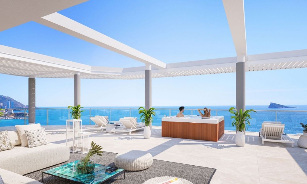 This new Penthouse apartment is located on the 30th floor with over 170m2 of terraces. The development has a unique design with a touch of sophistication that modernises the skyline of the Poniente beach of Benidorm. The properties are built on over 20,000m2 that includes communal and recreational areas totalling more than 10,000m2 and accommodating extensive, well-tended gardens, 3 swimming pools, 3 Jacuzzis, a chill-out lounge area with 2 bars, one wet and one dry, and sunbathing areas by the pools totalling over 2000m2 with natural grass among other features.