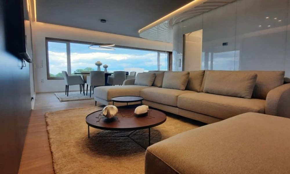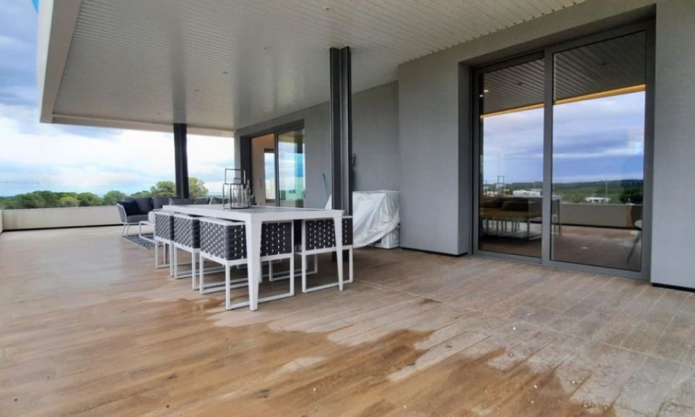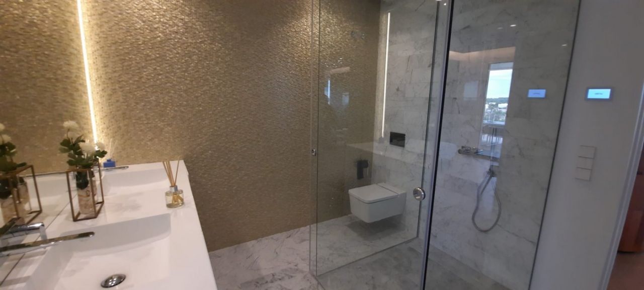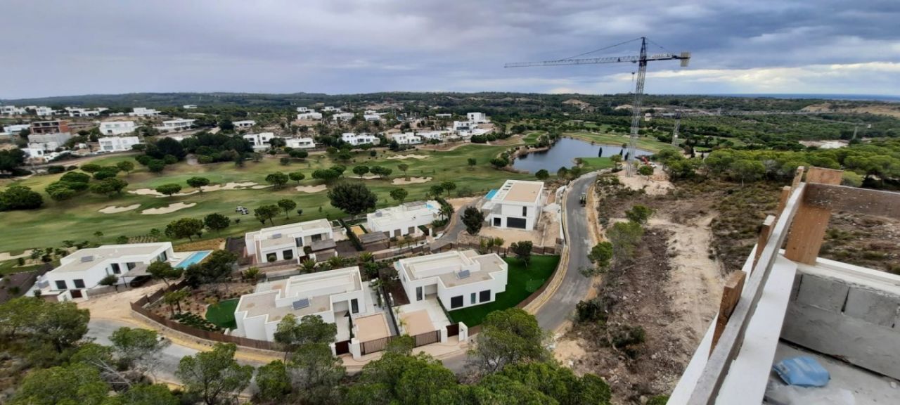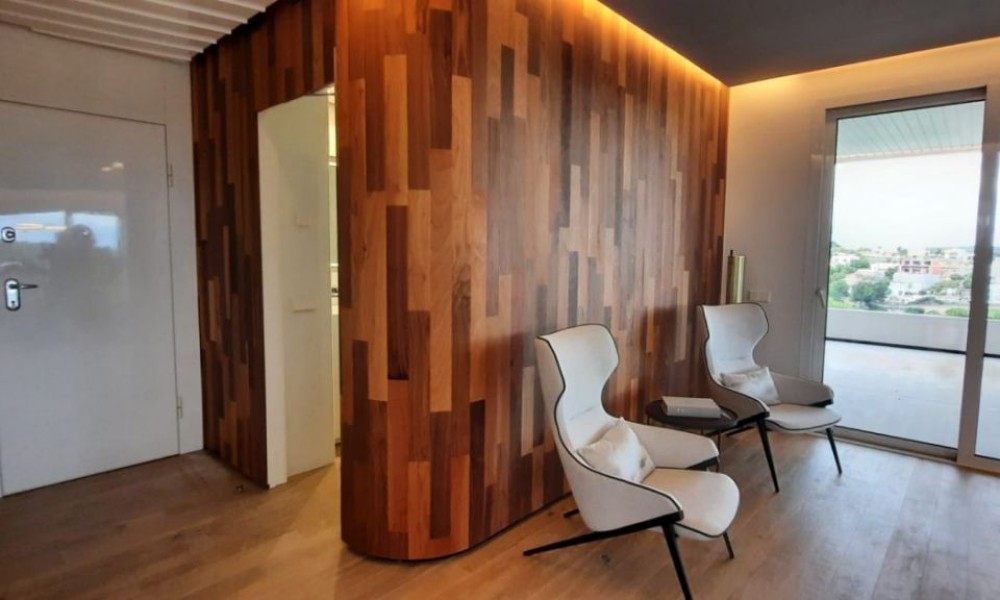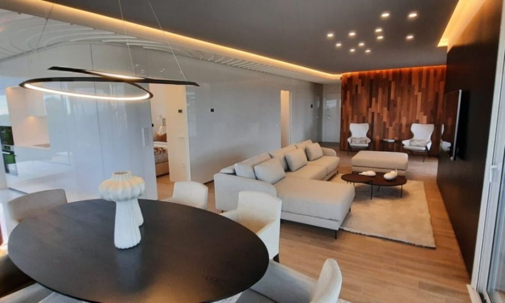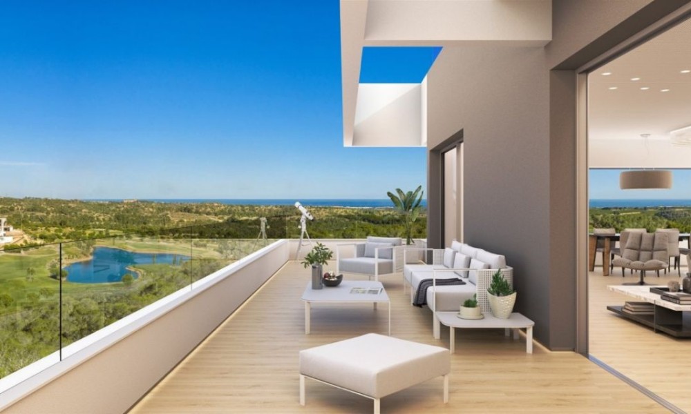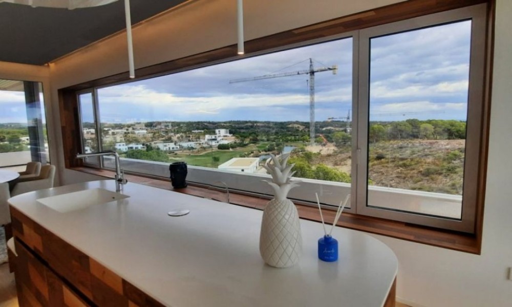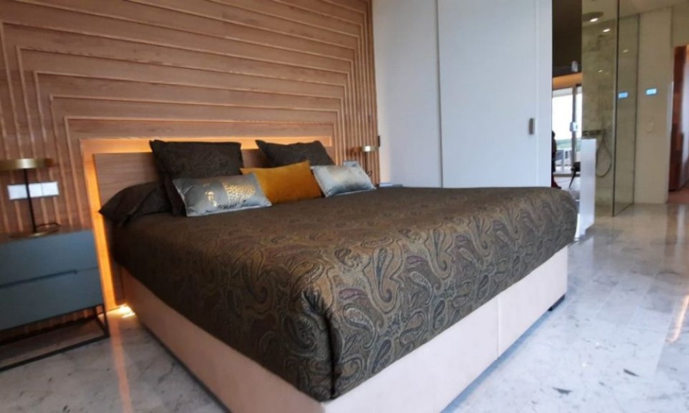 3 bed 2 bath penthouse, unique in Spain, designed by a world famous architect using a new idea of luxury based on the “new warm contemporary design” and focused on the outline of spaces with pleasant shapes, earthy color scheme, and a local atmosphere connected to the outdoor filling with harmony all the rooms.~ ~ The apartment comprise and open dinig – living area that flows naturally into the American kitchen with island. 2 double bedrooms with fitted wardrobes, and a spacious master bedroom with dressing room and en-suite shower room. A family shower room makes the apartment complete. ~ ~ Large schuco doors are used which provides lots of natural light and give access to the terrace of 52M², perfect to enjoy the mediterranean climate. The 100M² solarium gives breath taking sea views.~ ~ Extras included: Interior Design by Clavel Arquitectos, High-quality materials (marble, glass finishes, wood in master suite…), Motorized exterior blinds, Schüco door system, Central Air Conditioning, Underfloor heating in bathroom, Osmosis filter in kitchen, Domotics, Outdoor Infinity Swimming Pool ‘beach effect’, Indoor pool, Gym, Garage and Basement, amazing views over the golf course.