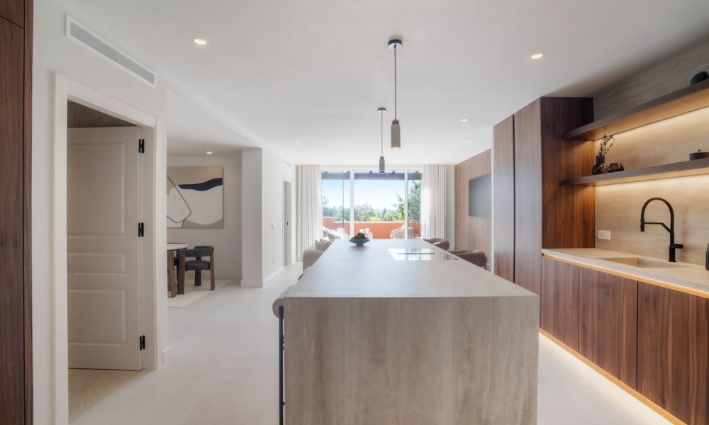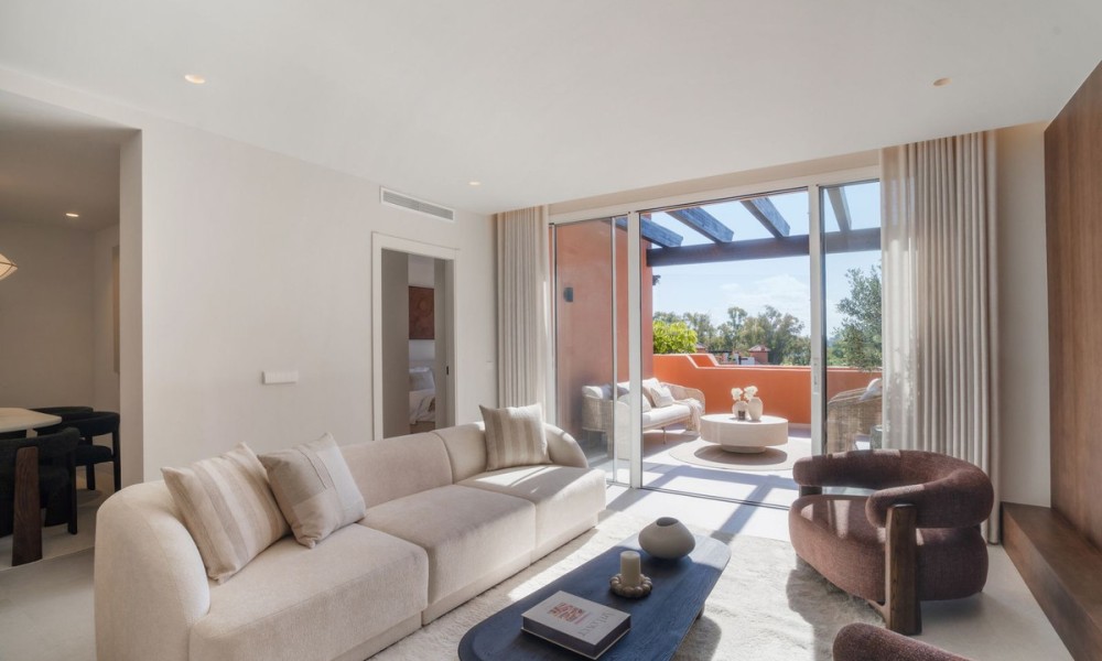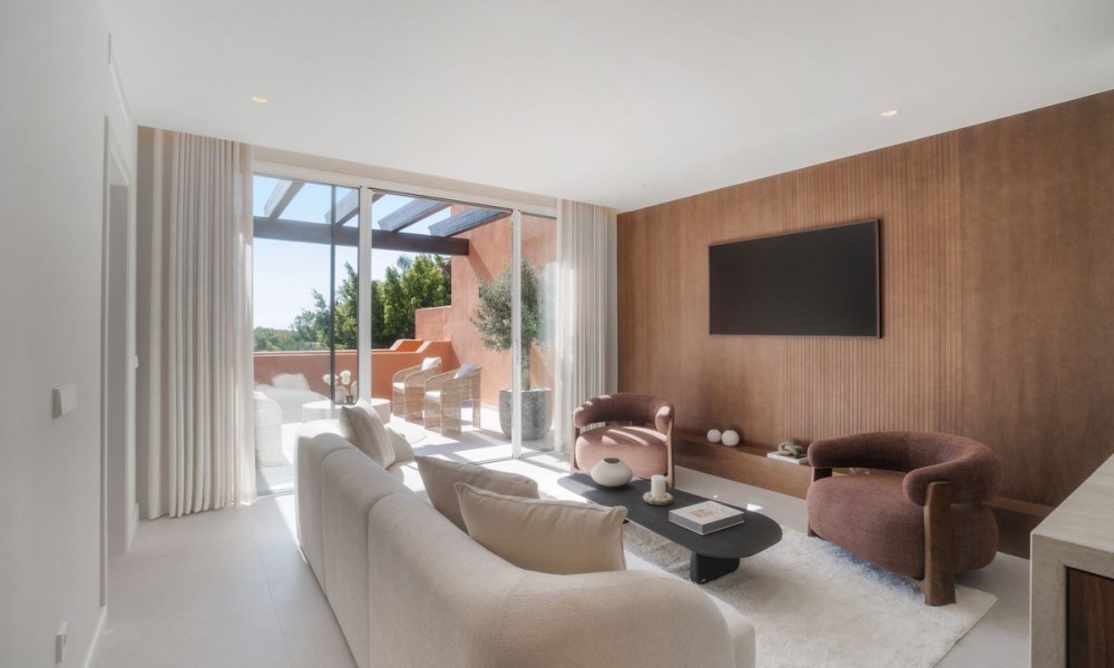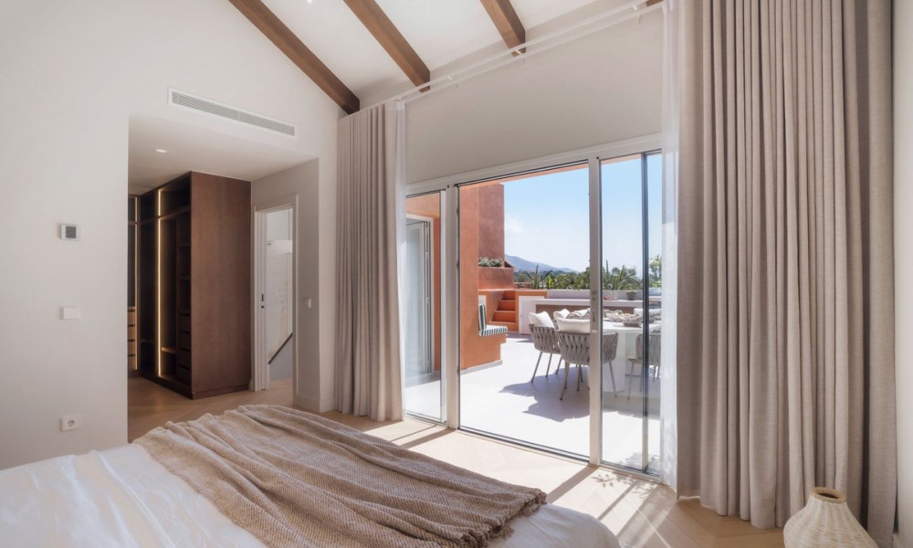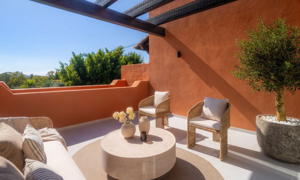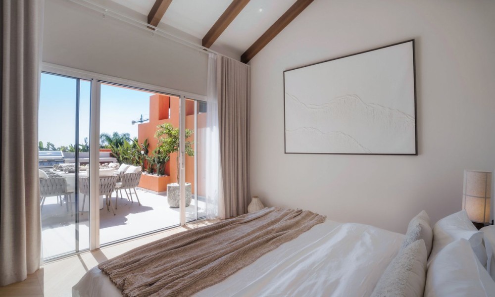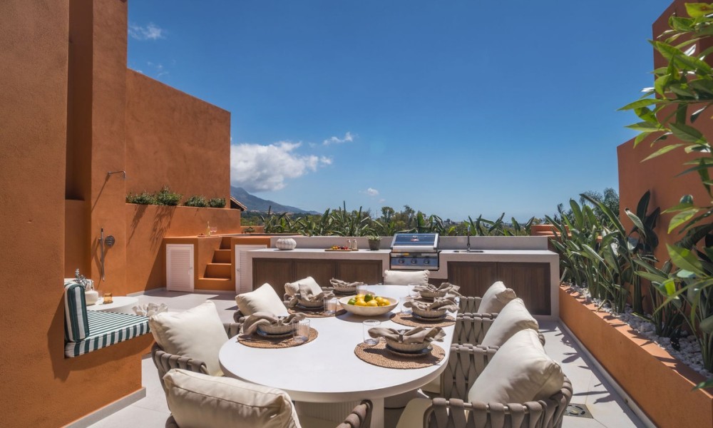 This elegant duplex penthouse in Nueva Andalucía has been fully renovated to the highest standards. With a modern design that emphasises light, space, and functionality, the home blends clean architectural lines with premium finishes and high-quality details such as Miele appliances and custom cabinetry.The first floor opens into a spacious living and dining area, designed as an open-plan space that flows seamlessly onto a large terrace. A contemporary kitchen with top-of-the-line fittings enhances the home’s functionality while maintaining a sleek, stylish look.The upper floor is dedicated to the master suite, which includes a luxurious walk-in closet, a large private bathroom, and direct access to the expansive rooftop terrace. This sanctuary combines privacy with exceptional comfort.In total, the property offers four bedrooms and three bathrooms. The guest bedrooms are generous in size and thoughtfully positioned to provide privacy and comfort for visiting family and friends, making the home equally suited for permanent living or entertaining.The highlight of the penthouse is its rooftop terrace, designed as a true lifestyle destination. It includes a private plunge pool, an outdoor kitchen with barbecue, a large dining area, and a lounge space perfectly positioned to enjoy sunsets over the Mediterranean.Within the gated community, residents have access to a communal swimming pool and beautifully landscaped gardens. In addition, Nueva Andalucía is surrounded by world-class golf courses, health clubs, and wellness centres, offering a lifestyle that rivals any luxury resort.