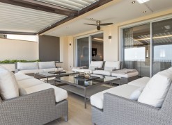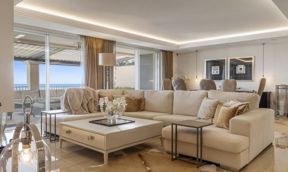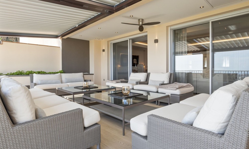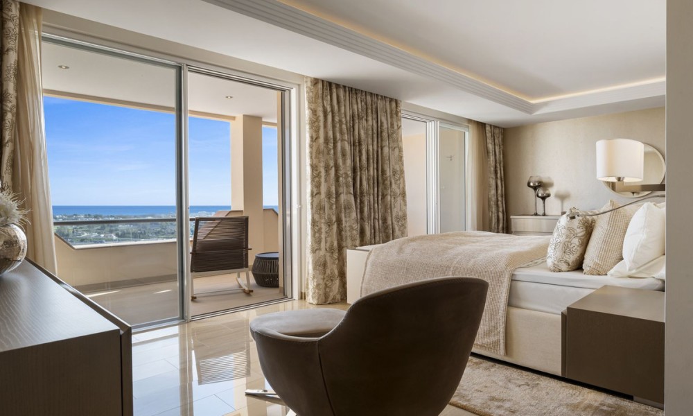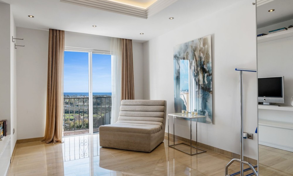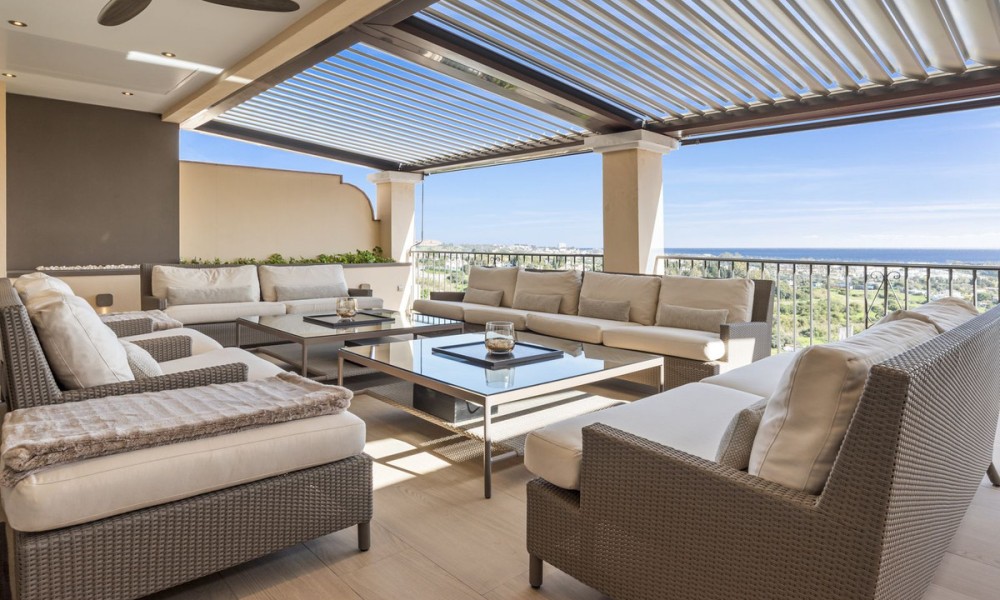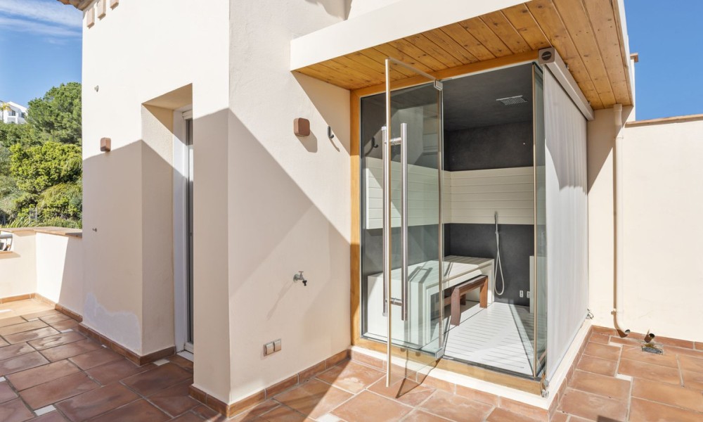 An additional en-suite guest bedroom on this floor ensures ample space for visitors.Outdoor spaces include multiple terraces and a large covered main area overlooking the Mediterranean. The expansive solarium serves as a wellness hub, featuring a gym, sauna, steam room, and a private jacuzzi. This level includes a stylish chill-out area with panoramic views of the sea and surrounding mountains. Residents also have access to communal pool facilities.Situated within a gated community, the property is a short drive from the coast and sandy beaches. Its location provides proximity to several prestigious golf courses and local amenities, balancing a secluded atmosphere with easy access to nearby marinas and town centers.