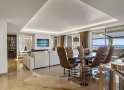 This south-facing duplex penthouse offers a sophisticated living environment defined by elegance and light. The architecture prioritizes modern convenience, featuring a domotica system, underfloor heating, and integrated climate control. A private internal lift provides seamless access between floors, complemented by underground parking for two vehicles and a dedicated storage room.The main level features a bright, open-plan living and dining area anchored by a fireplace and a kitchen equipped with premium Miele appliances. This floor includes two guest bedrooms—one en-suite and another served by a separate bathroom—alongside a guest toilet and a dedicated laundry area. On the upper level, the master suite serves as a private retreat with dual bathrooms and an extensive dressing area.
