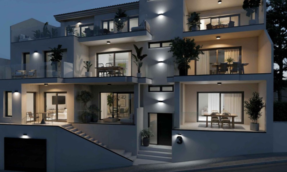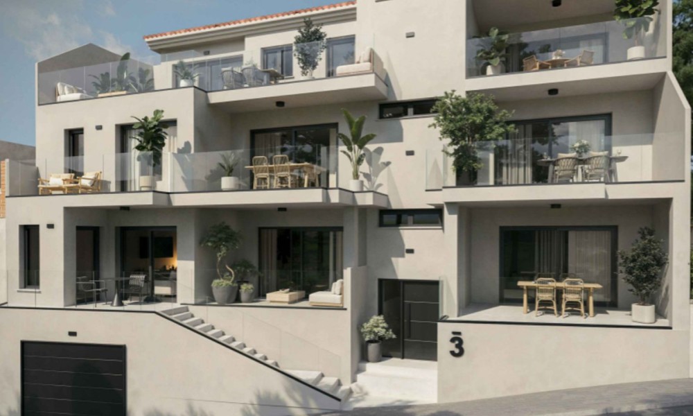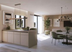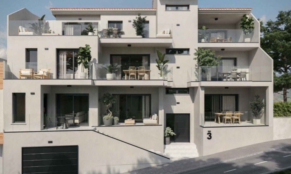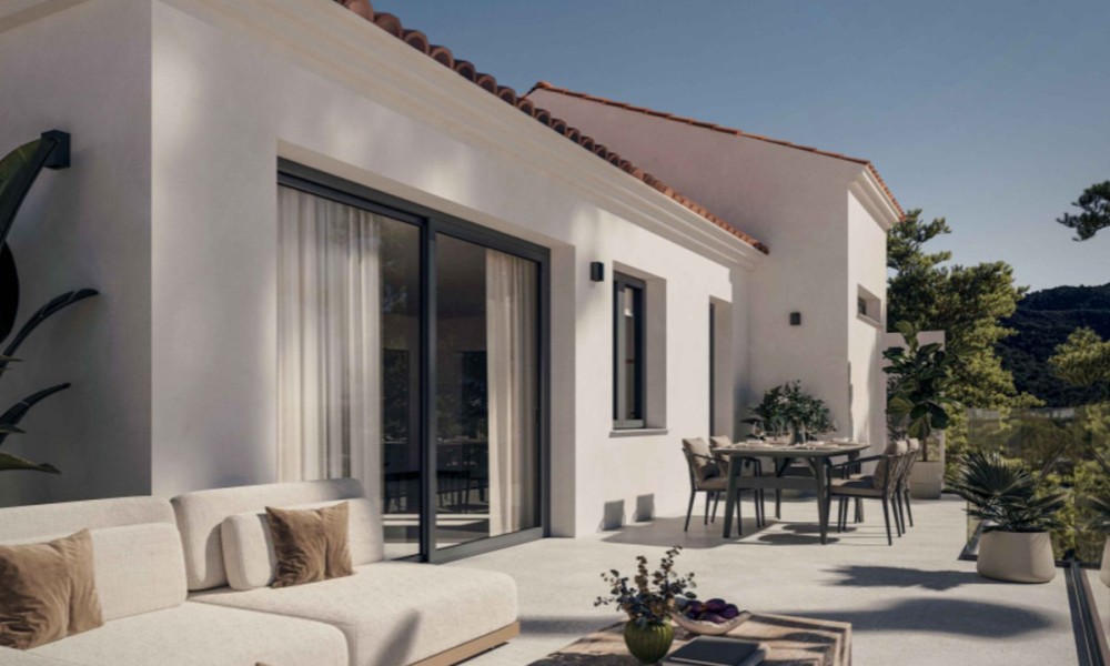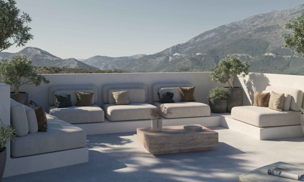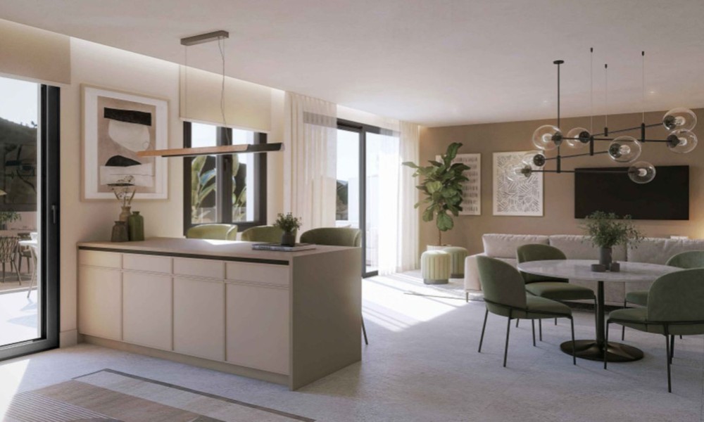 Located in Benahavís, this residential development is situated between the mountains and the sea on the Costa del Sol. The location provides access to local golf courses and natural hiking trails, while remaining a short drive from coastal marinas and beaches. The area is established as a private residential zone characterized by a high standard of living and proximity to regional services.The building features a contemporary architectural design with a staggered façade and clean lines. It is constructed using neutral-toned cladding and glass balustrades to integrate with the surrounding environment. To ensure energy efficiency, the homes are equipped with air-source heat pumps for heating, cooling, and hot water production. The structural orientation is designed to maximize the entry of natural light and reduce overall energy consumption.The interior layout consists of an open-plan living and dining area that connects directly to the kitchen. Floor-to-ceiling windows are used to provide light and a direct view of the exterior.