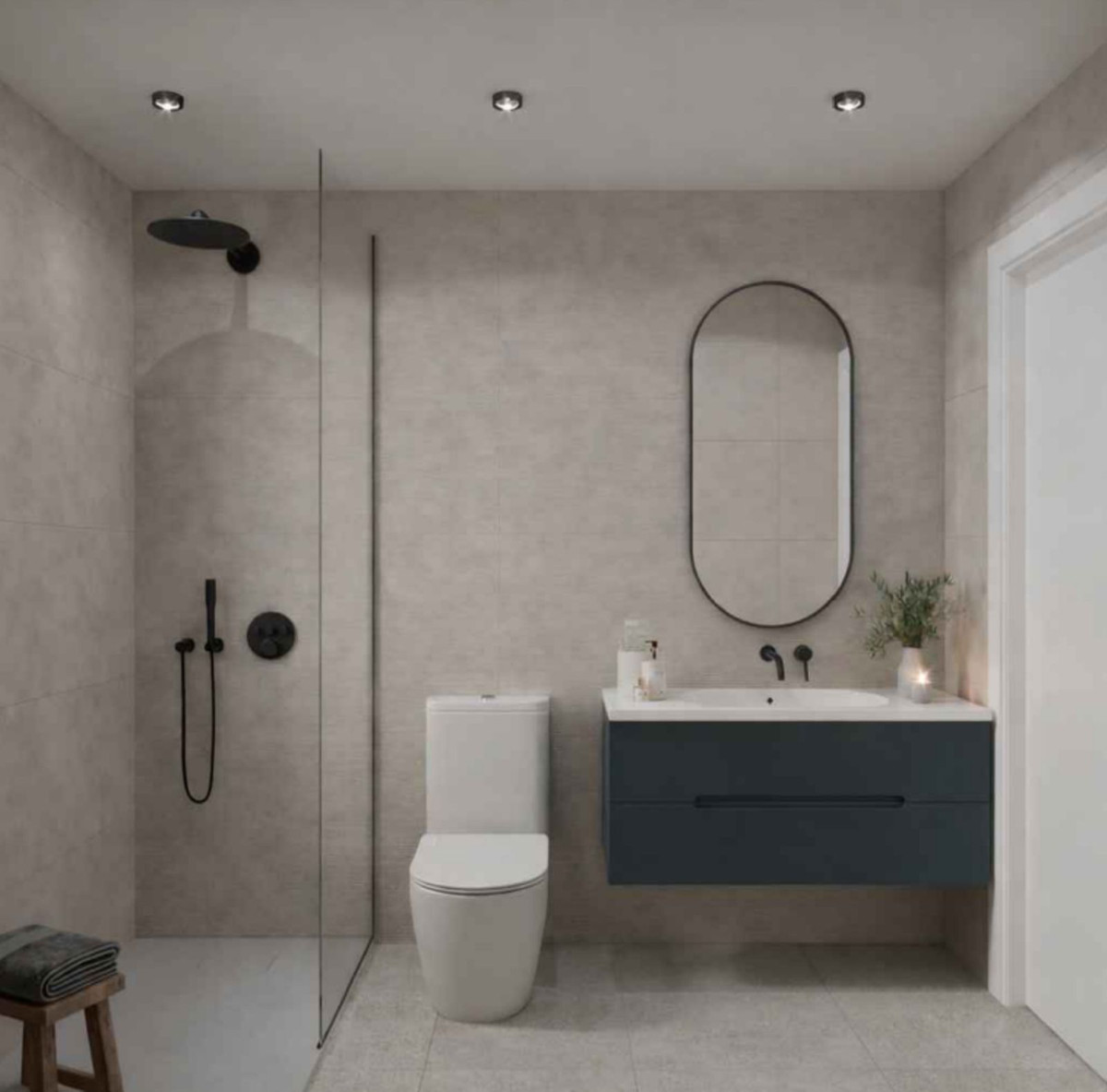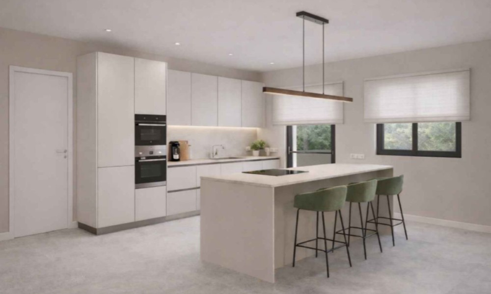 The design utilizes light-coloured finishes and perimeter lighting to create a functional and consistent aesthetic throughout the main floor. This layout is intended to accommodate both daily residential use and social entertaining.The bathrooms are finished with neutral-toned wall and floor tiles and include modern fixtures. Features include spacious shower trays with glass screens, integrated washbasins, and storage furniture. The kitchens are designed as a functional extension of the living space, allowing for ease of movement and visual separation between different zones of the home.Each property includes a private terrace suitable for outdoor dining and relaxation, offering views of the Mediterranean and the mountains. Residents also have access to a communal saltwater swimming pool and a shared terrace area equipped with seating and sunbathing spaces. The development is completed with seven dedicated parking spaces and seven storage rooms, providing necessary infrastructure for permanent residents or investors.