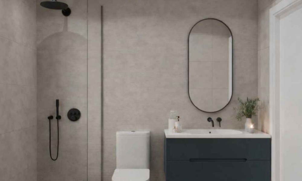 The design utilizes light-coloured finishes and perimeter lighting to create a functional and consistent aesthetic throughout the main floor. This layout is intended to accommodate both daily residential use and social entertaining.The bathrooms are finished with neutral-toned wall and floor tiles and include modern fixtures. Features include spacious shower trays with glass screens, integrated washbasins, and storage furniture. The kitchens are designed as a functional extension of the living space, allowing for ease of movement and visual separation between different zones of the home.Each property includes a private terrace suitable for outdoor dining and relaxation, offering views of the Mediterranean and the mountains. Residents also have access to a communal saltwater swimming pool and a shared terrace area equipped with seating and sunbathing spaces. The development is completed with seven dedicated parking spaces and seven storage rooms, providing necessary infrastructure for permanent residents or investors.