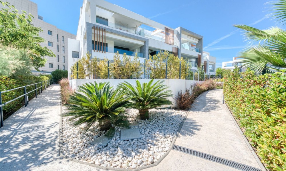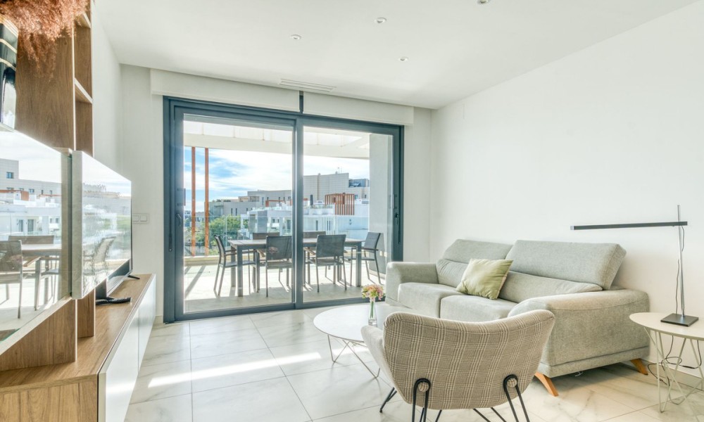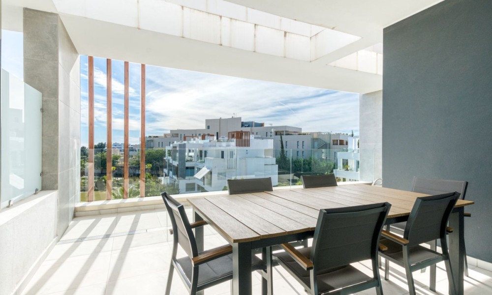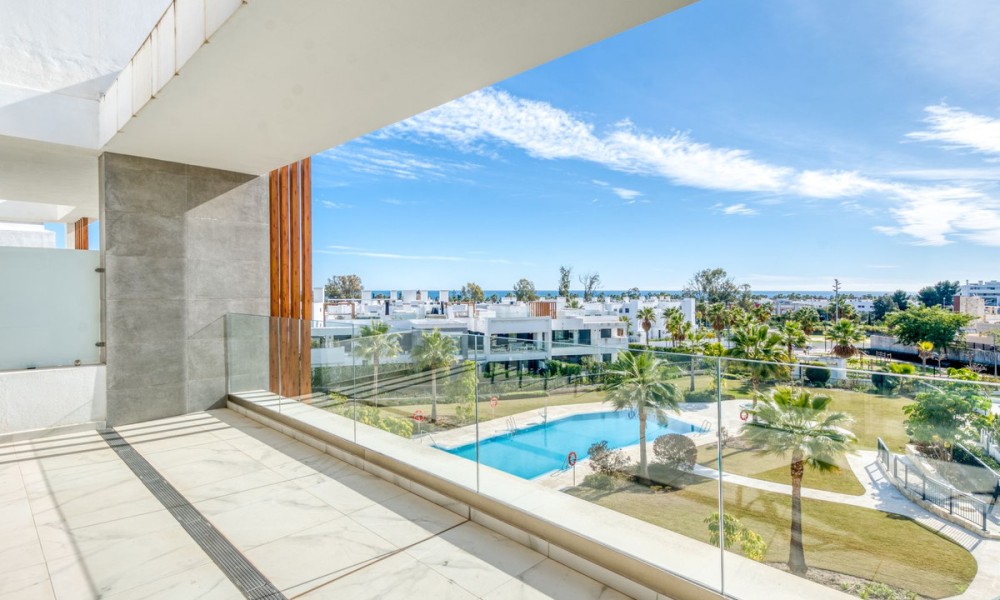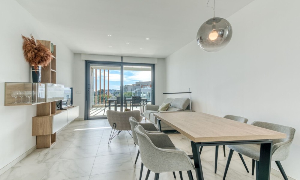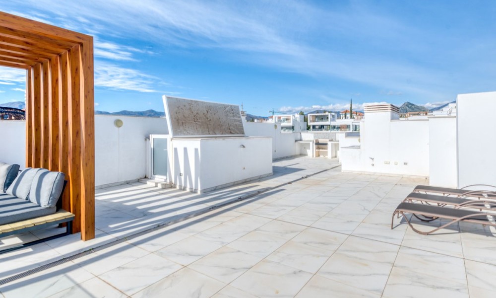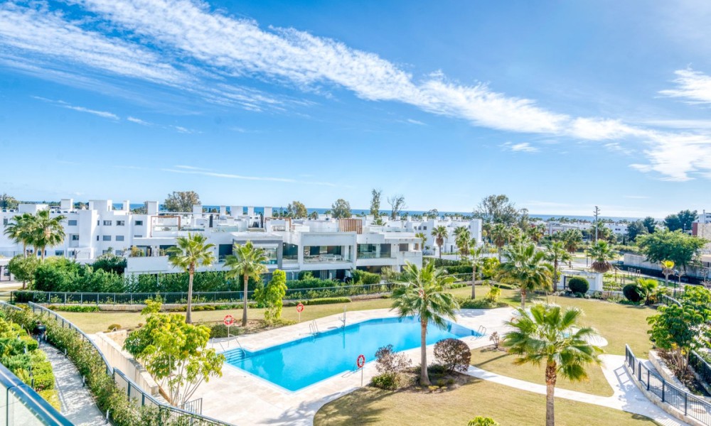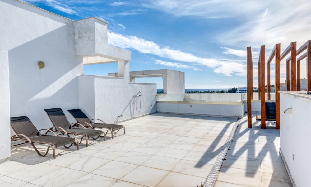 Simply stunning two-bedroom apartment with Sea and Mountain views | New Golden Mile, Estepona | Transferable Holiday Rental LicenceBeautifully maintained and set in an exclusive gated community along Estepona’s sought-after New Golden Mile, this penthouse apartment is just 500m from local amenities and a short walk to the beach. Positioned in one of the best spots within the community, the property enjoys fantastic views across the manicured tropical gardens, swimming pool, mountains, and the sea beyond. It’s a calm, elegant space designed for effortless coastal living. Inside, the apartment offers a bright open-plan layout with a sleek American-style kitchen, premium appliances, and underfloor heating in the bathrooms. The spacious living area flows onto a large private terrace perfect for dining outdoors or soaking up the Mediterranean sun. Both bedrooms are generous and filled with natural light, and the master suite opens directly onto the terrace, featuring an en-suite bathroom, while the second bedroom is ideal for guests or family, with a full second bathroom adjacent.