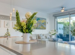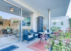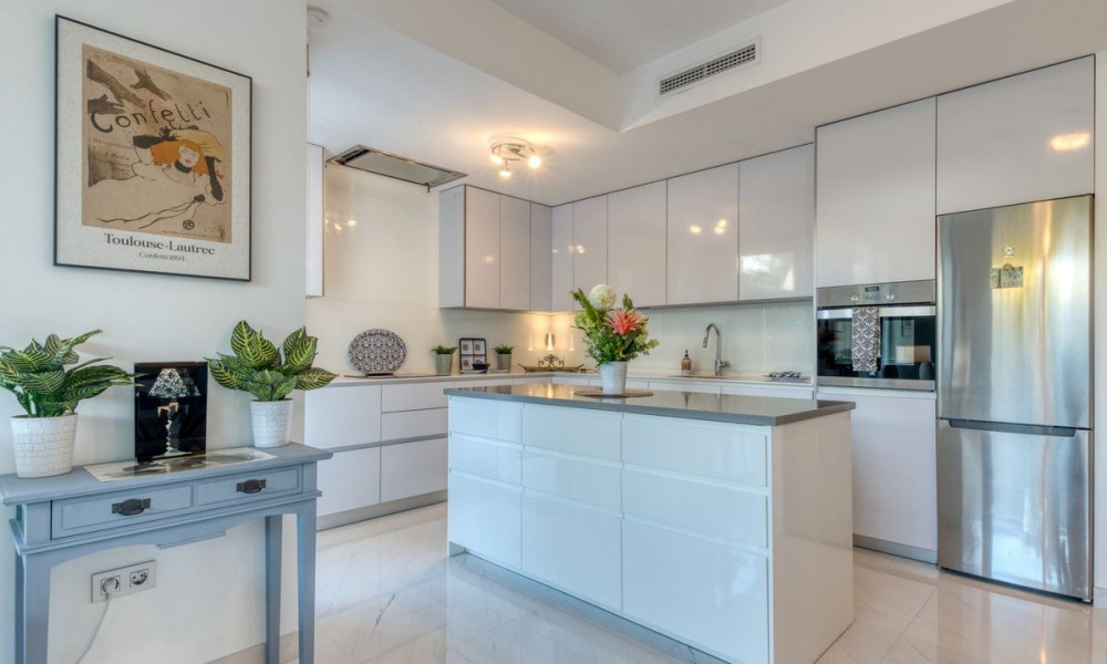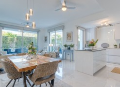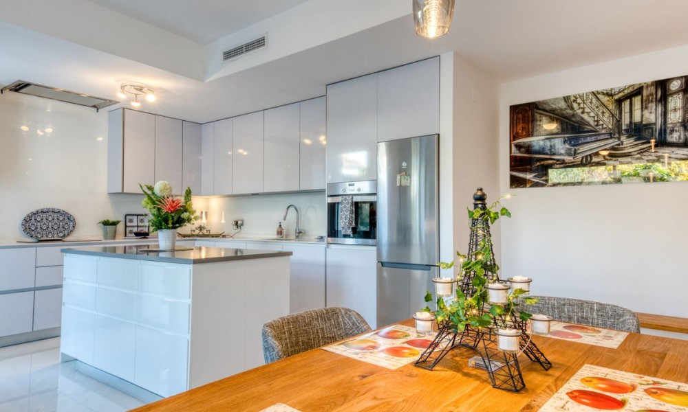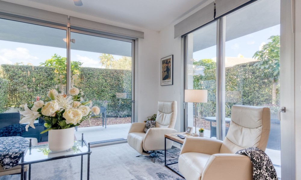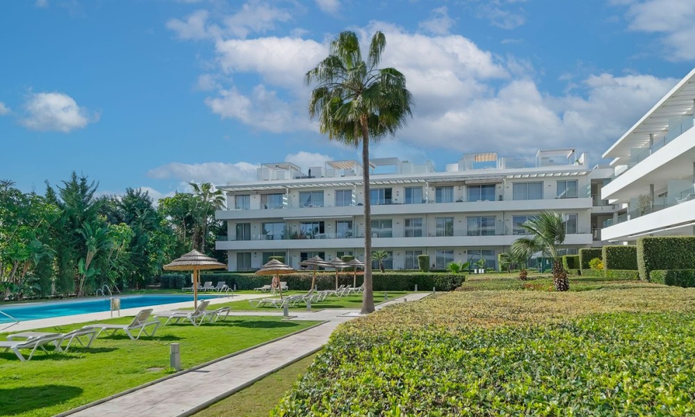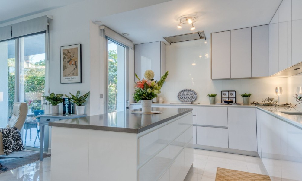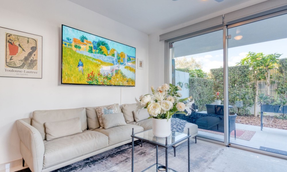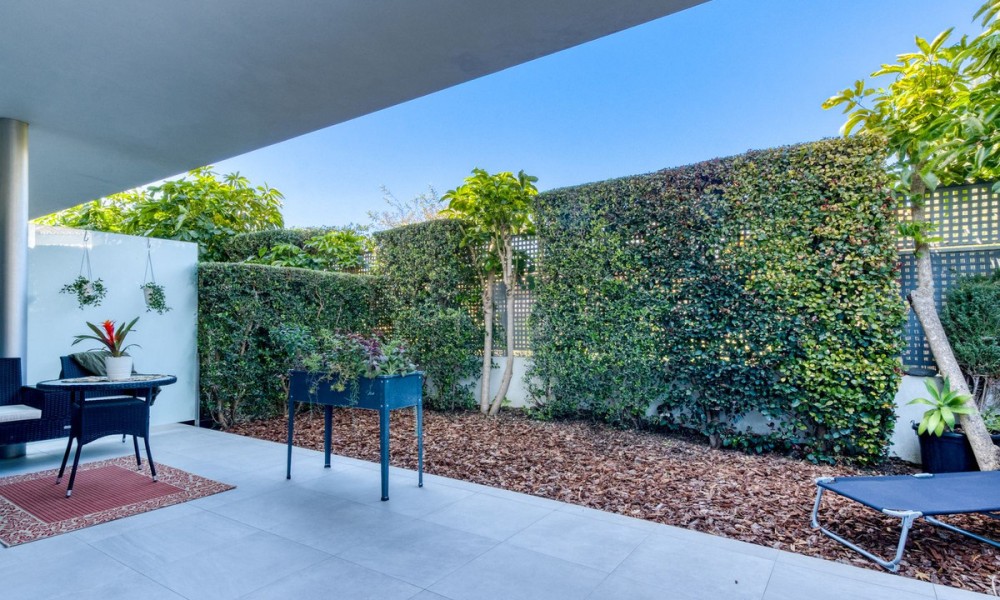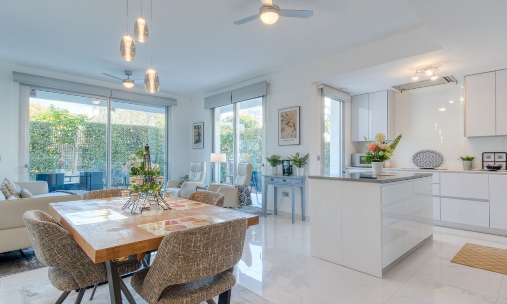 Contemporary Garden Apartment with Private Outdoor Space | New Golden Mile, CanceladaSet within a sought-after gated community in Cancelada, this three bedroom ground floor apartment offers modern design, privacy and a strong indoor-outdoor lifestyle on the New Golden Mile between Marbella and Estepona. The property enjoys a well-positioned setting within the development, combining a peaceful environment with close proximity to the beach, local amenities, cafés and restaurants.The interior is arranged around a bright open-plan living and dining area that connects directly to the terrace and private garden. The kitchen is finished to a high standard, featuring a central island and integrated appliances, creating a practical and social space.