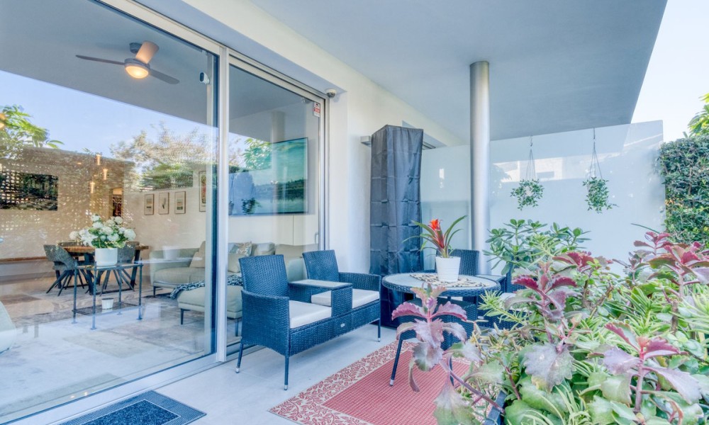 The layout includes three bedrooms and two bathrooms, including a principal suite with en suite bathroom. The overall design focuses on comfort and functionality, making the property suitable for both full-time living and holiday use. The outdoor areas provide a key feature of the home, with a covered terrace leading onto a private landscaped garden, offering a level of privacy rarely found in apartment living. Additional features include underground parking and a storage room, within a secure gated community with landscaped gardens and a communal swimming pool.A well-located property offering modern living, private outdoor space and strong lifestyle appeal on the New Golden Mile.