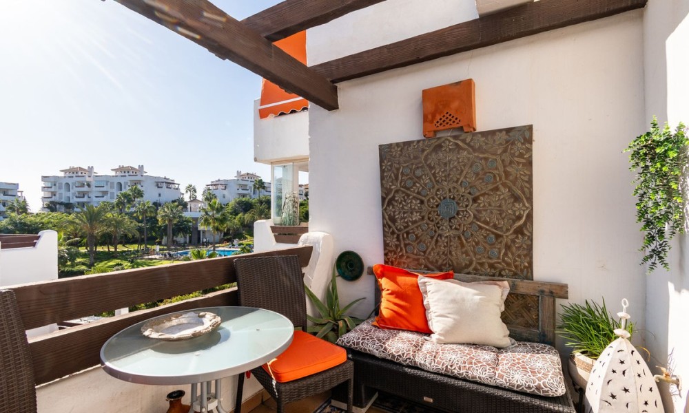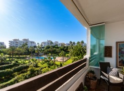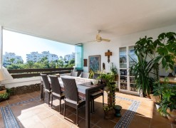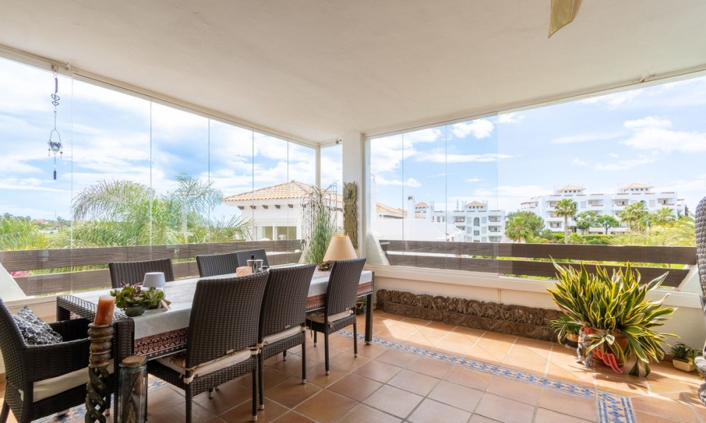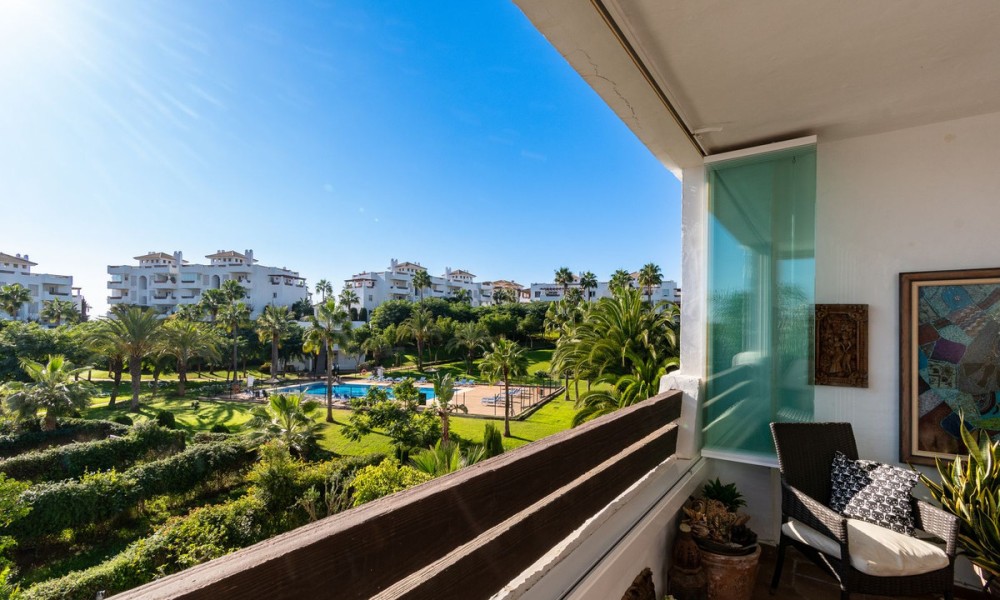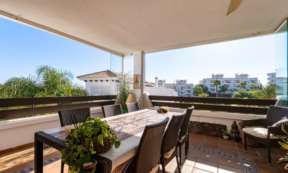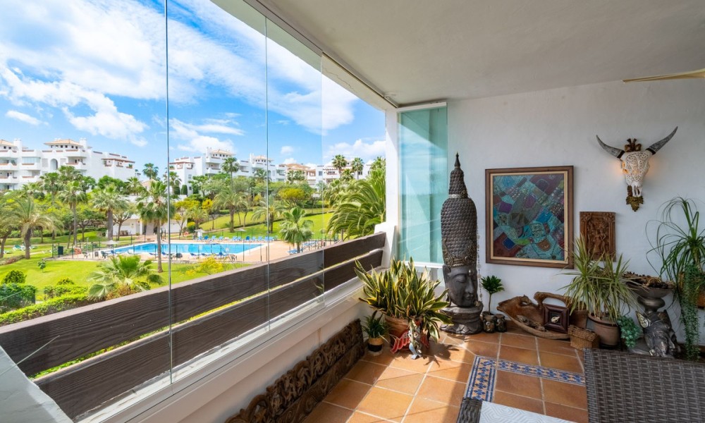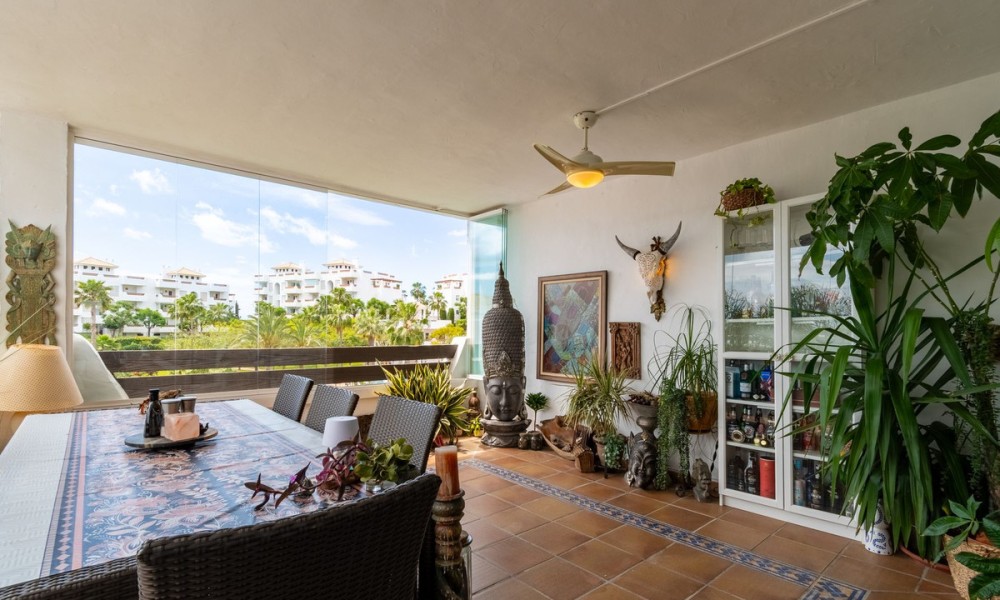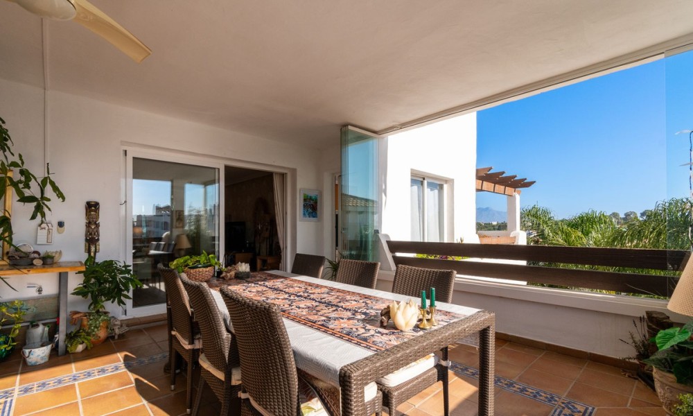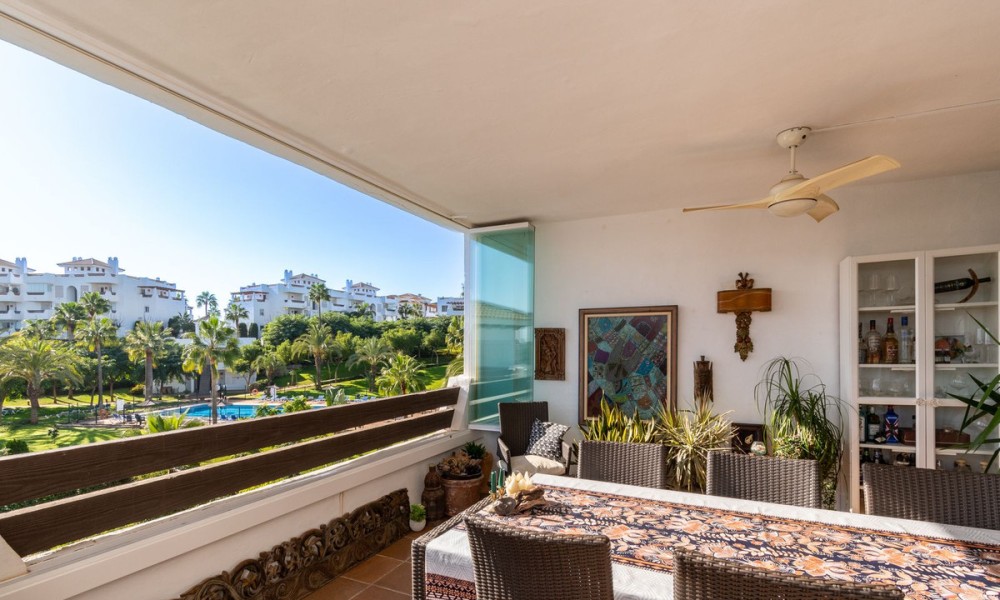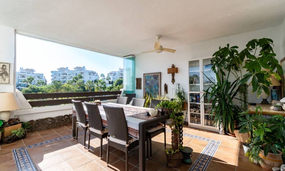 Stylish Apartment with Multiple Terraces | Selwo, EsteponaSet within a secure gated community between Puerto Banús and Estepona, this three bedroom apartment offers a balanced lifestyle combining comfort, outdoor space and convenience. The interior features a bright open-plan living and dining area that connects seamlessly to three private terraces, creating a natural flow between indoor and outdoor living. The recently updated kitchen is fully fitted and complemented by a separate utility room. The property includes three well-proportioned bedrooms, finished to a high standard with marble flooring, fitted wardrobes and air conditioning throughout.