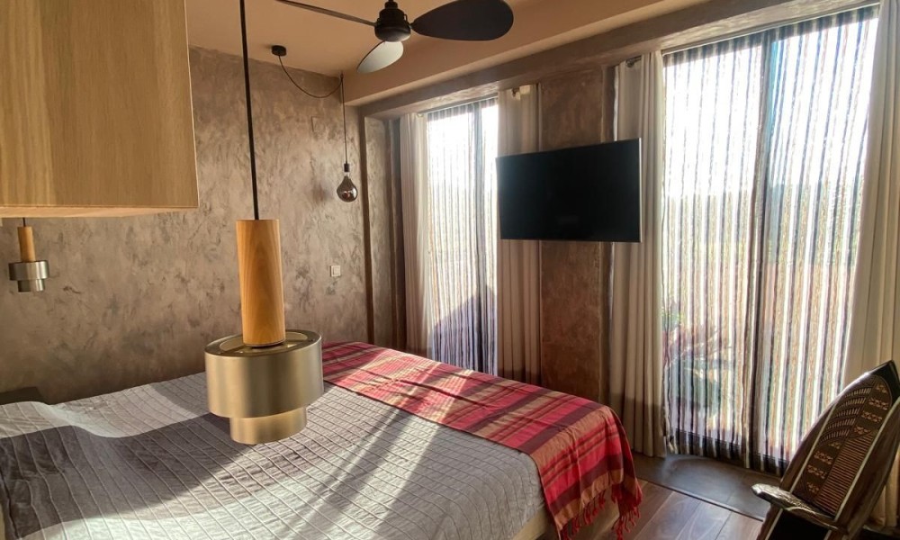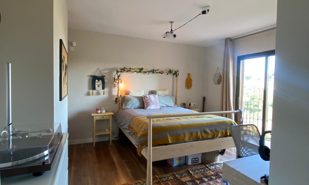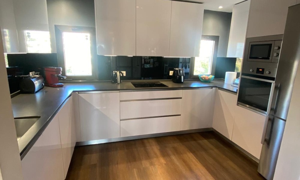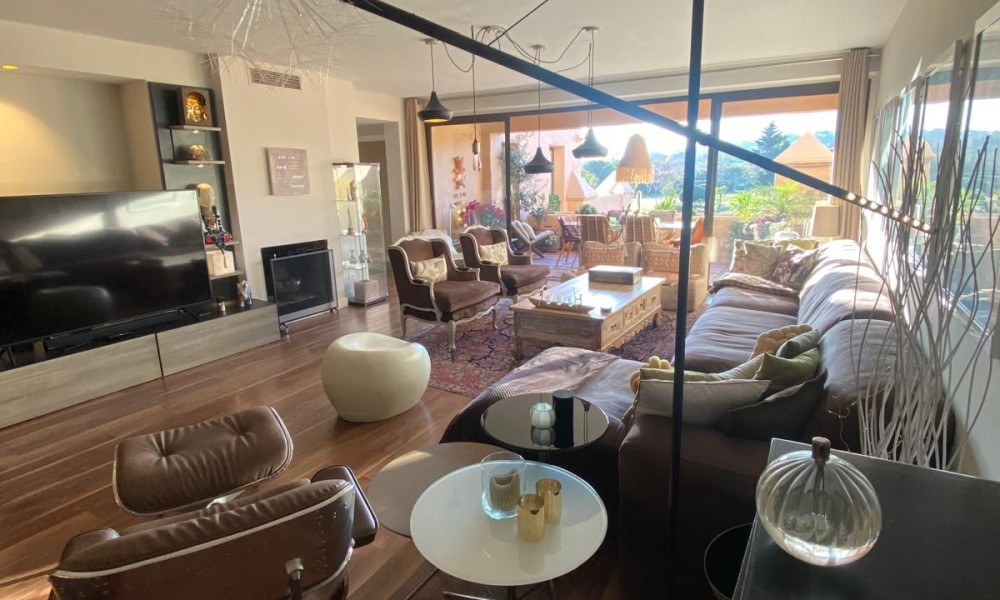 This duplex penthouse in Estepona is a contemporary residence where privacy and natural light are central to the design. The architecture facilitates a transition between indoor and outdoor areas, allowing the Mediterranean environment to be utilized throughout the year. Recently renovated, the interiors feature updated finishes that balance modern aesthetics with functional living requirements.The main floor contains the primary living and dining area, which includes a fireplace and provides direct access to a terrace. A fully renovated designer kitchen is integrated into this living space to support social interaction. The upper floor consists of a loft-style area with a second kitchen, lounge, and dining section. This level is equipped with a retractable structure that allows the space to be adjusted according to environmental conditions or specific needs.The sleeping quarters include three bedrooms. The master suite is designed with a walk-in wardrobe and an en-suite bathroom.