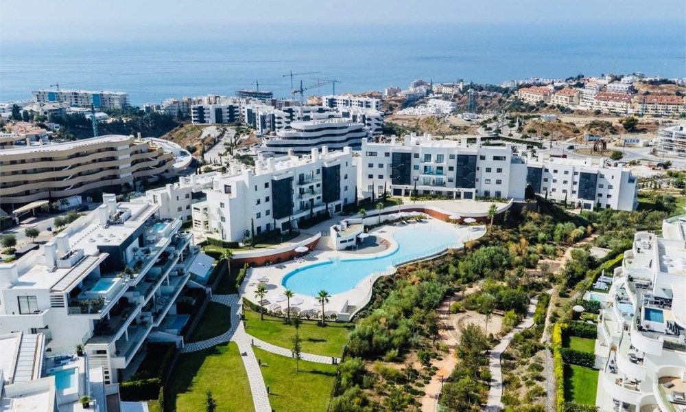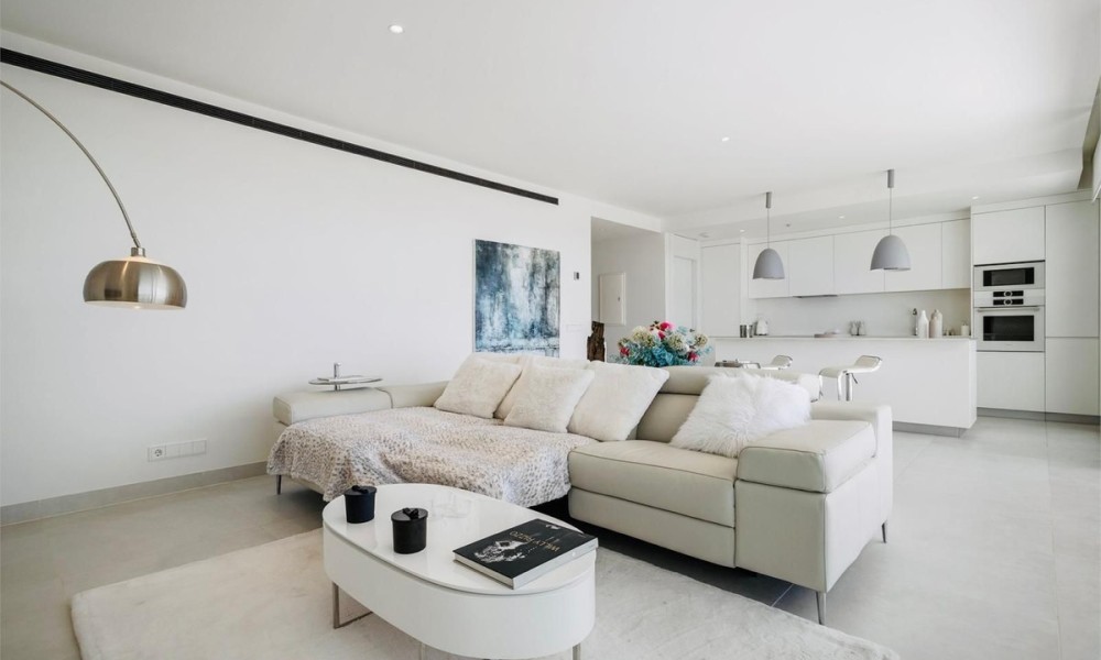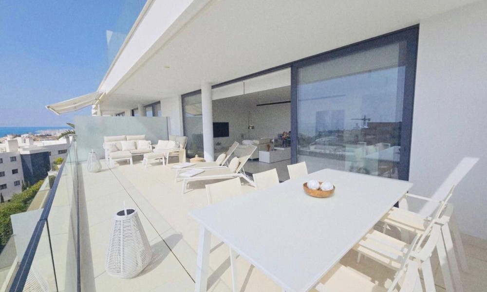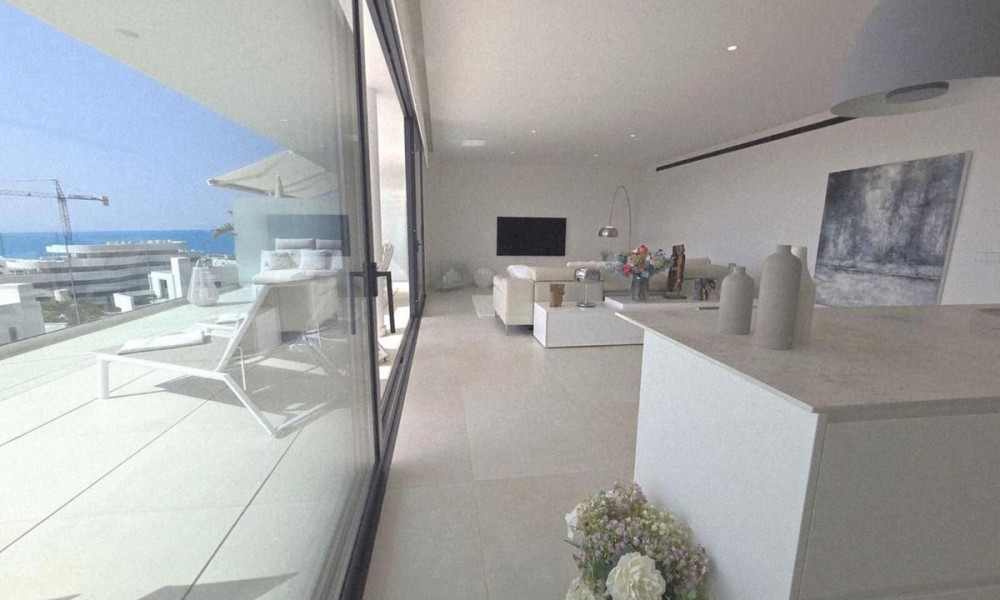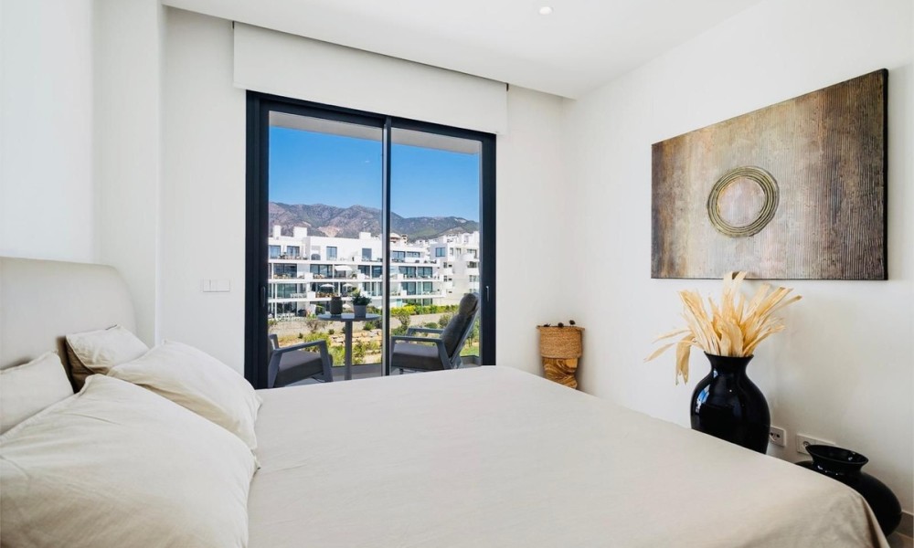 This contemporary apartment features two bedrooms and two bathrooms, including an en suite with underfloor heating. The interior transitions to a large terrace designed for year-round outdoor use. The property includes two private parking spaces equipped with electric vehicle chargers and a dedicated storage room.The communal infrastructure provides two infinity pools and dedicated co-working spaces. Residents have access to a sports club containing a gym, personal trainers, a heated 25-meter pool, and courts for padel, tennis, and beach volleyball. Additional fitness options include group classes, Pilates, and organized activities for children.