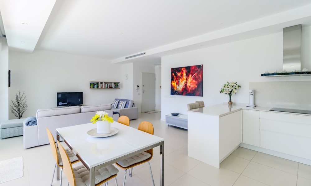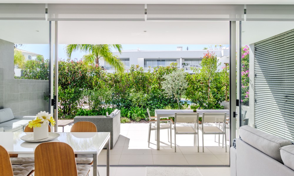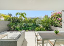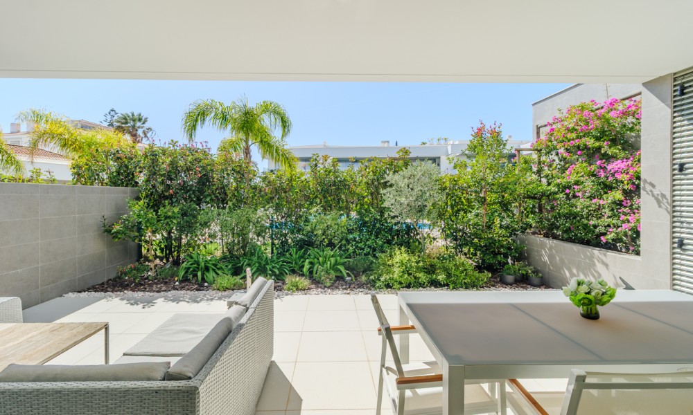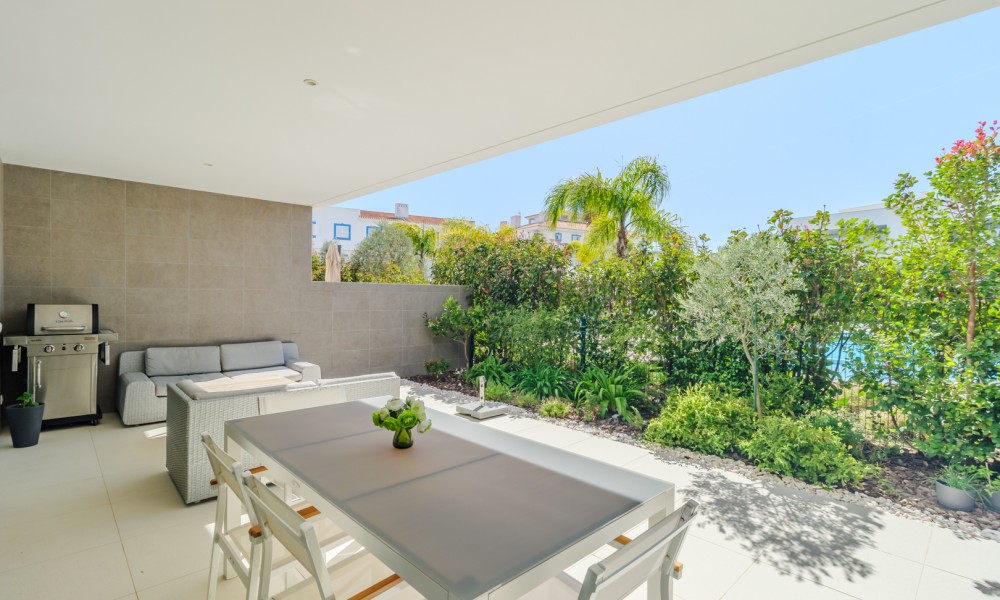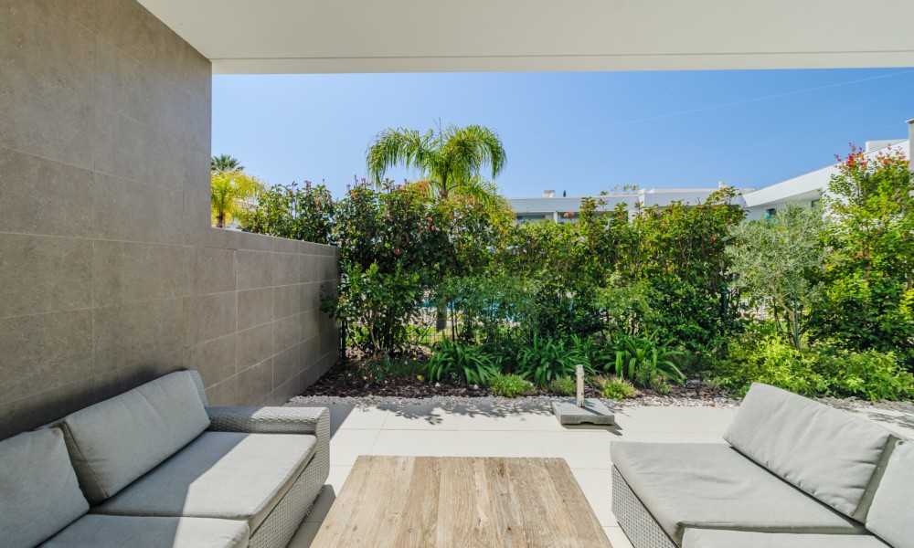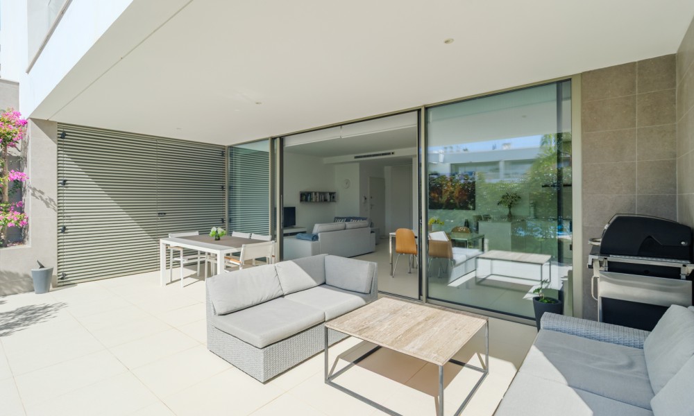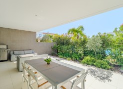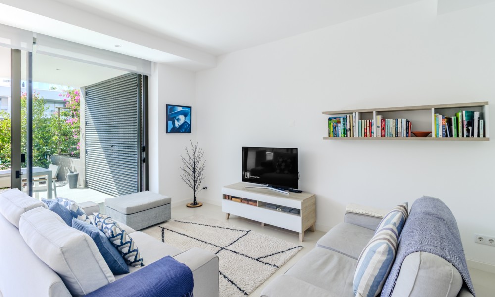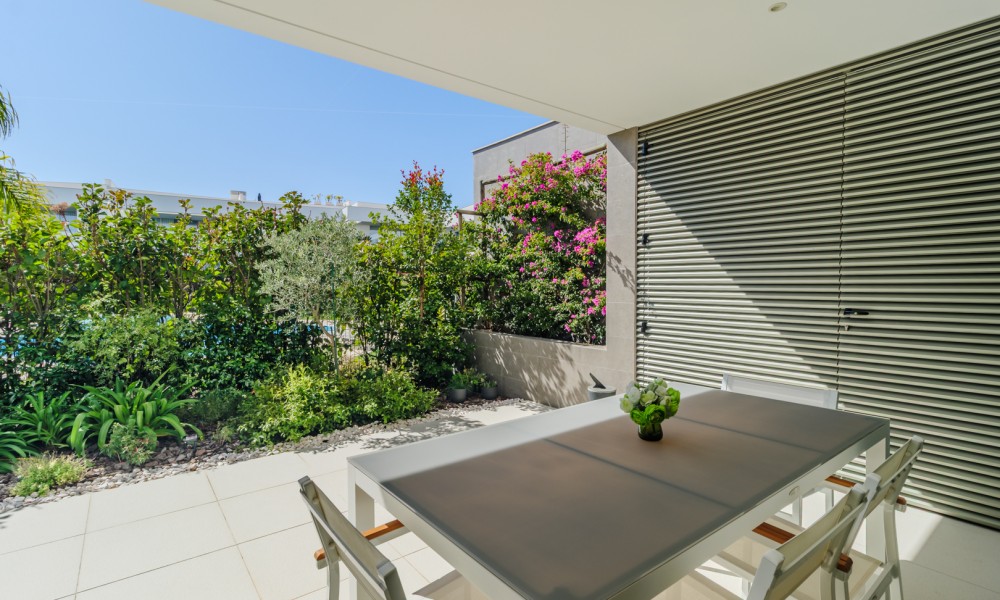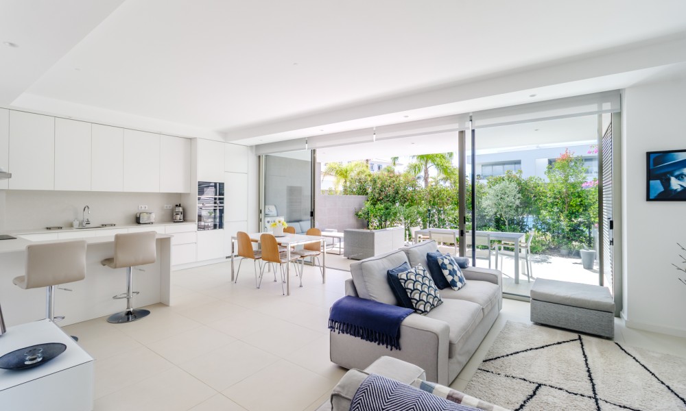 Fabulous 2 bedroom, 3 bathroom ground-floor apartment, offering sleek contemporary design and seamless indoor-outdoor living.The open-plan layout features a modern kitchen fully equipped with integrated appliances, flowing effortlessly into a spacious living area and large terraces—perfect for relaxation and entertaining. Both bedrooms include built-in wardrobes, while the bathrooms showcase a stylish, contemporary finish.Designed for comfort and efficiency, this apartment boasts fully installed air conditioning, underfloor heating, solar panels for hot water, high-speed fiber internet, and double-glazed windows with electric roller blinds in the living area.