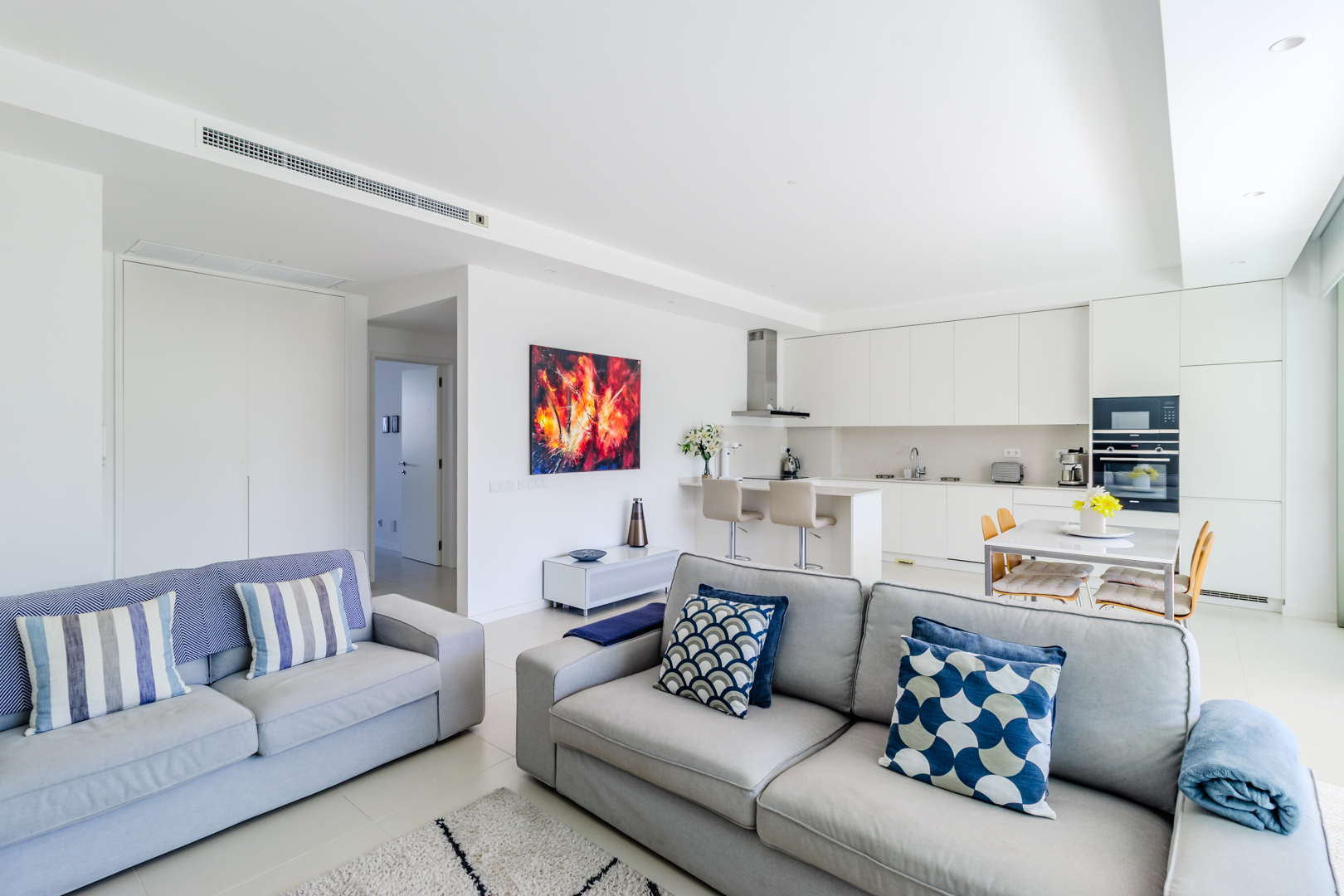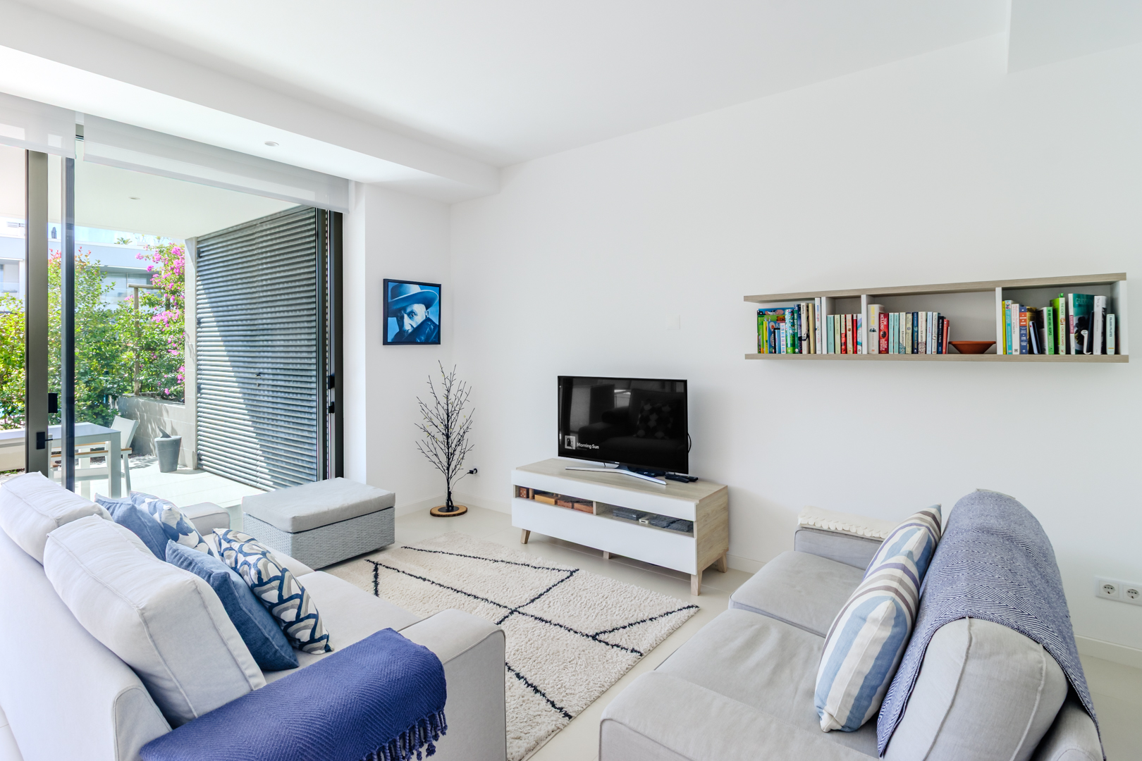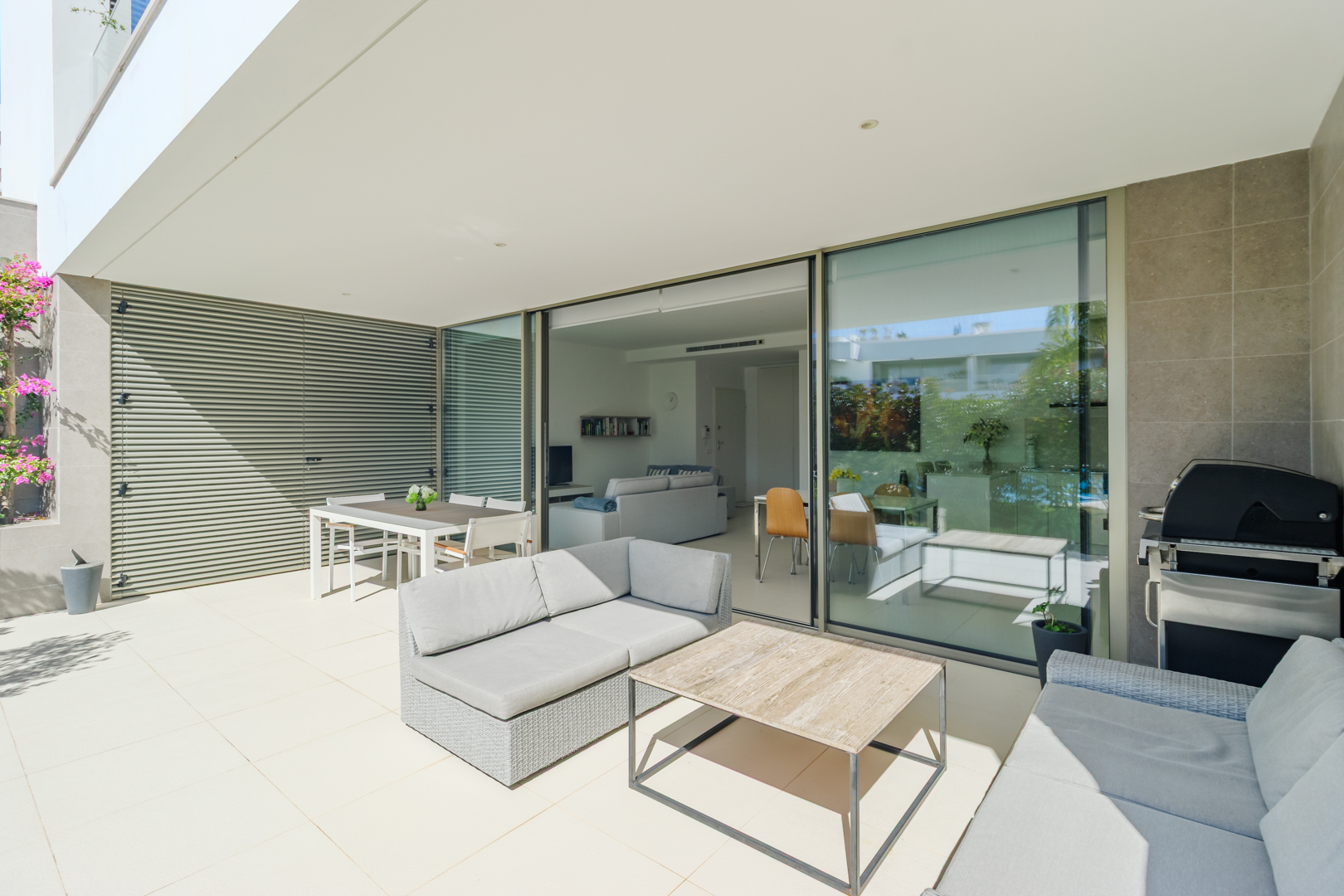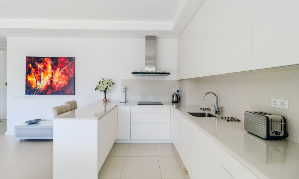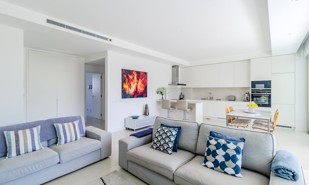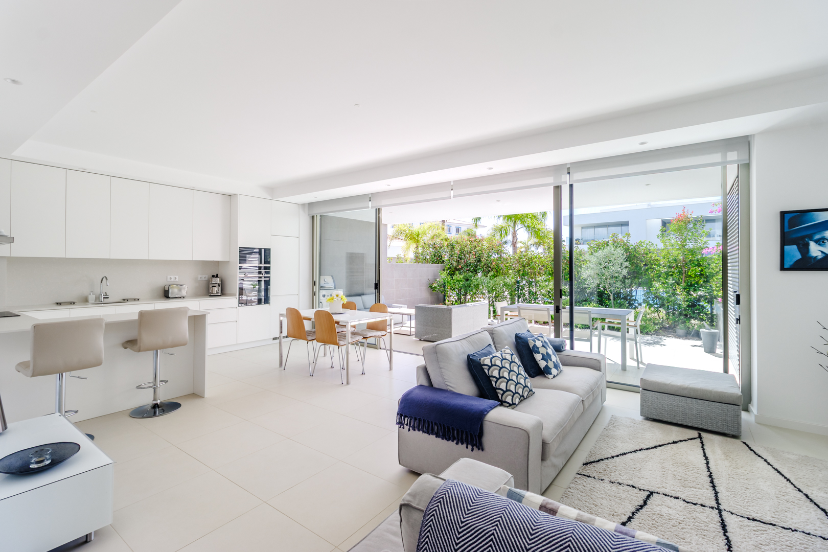 Fabulous 2 bedroom, 3 bathroom ground-floor apartment, offering sleek contemporary design and seamless indoor-outdoor living.The open-plan layout features a modern kitchen fully equipped with integrated appliances, flowing effortlessly into a spacious living area and large terraces—perfect for relaxation and entertaining. Both bedrooms include built-in wardrobes, while the bathrooms showcase a stylish, contemporary finish.Designed for comfort and efficiency, this apartment boasts fully installed air conditioning, underfloor heating, solar panels for hot water, high-speed fiber internet, and double-glazed windows with electric roller blinds in the living area.