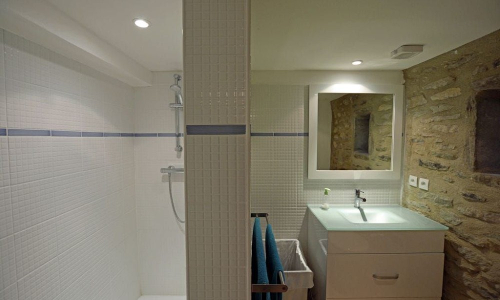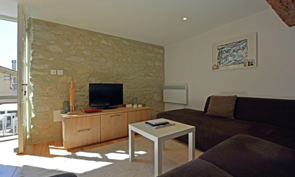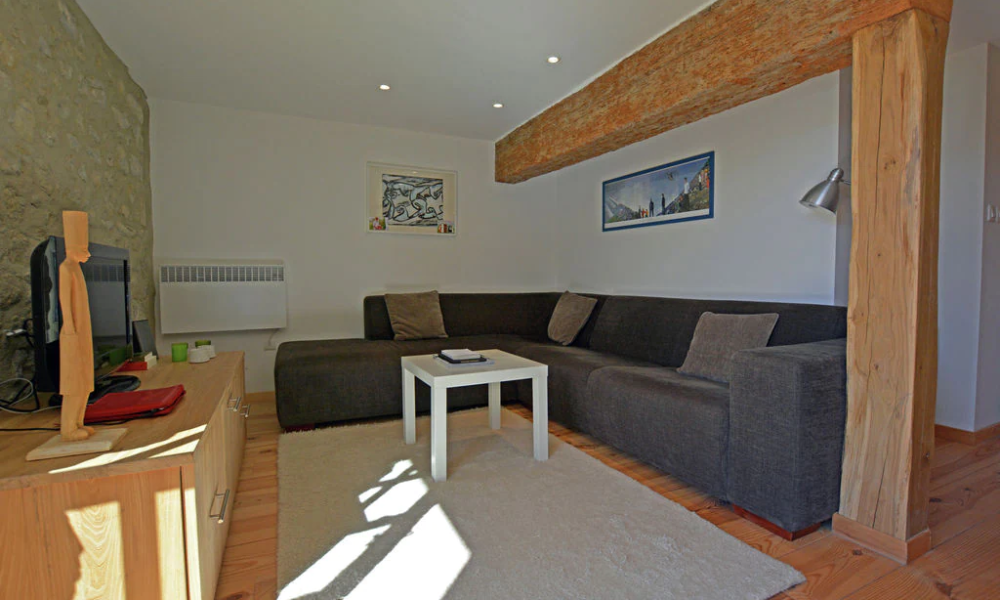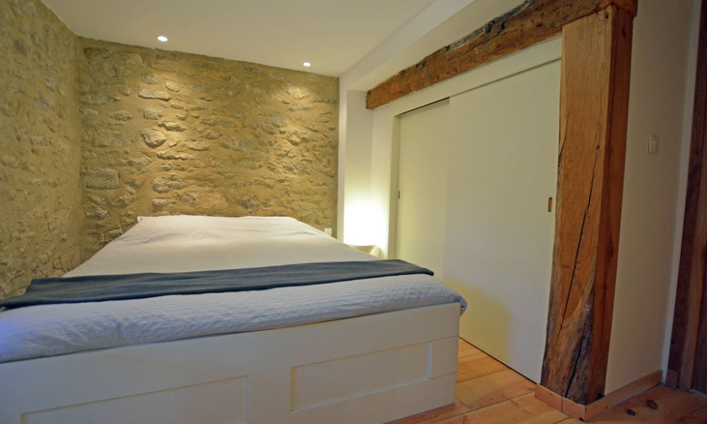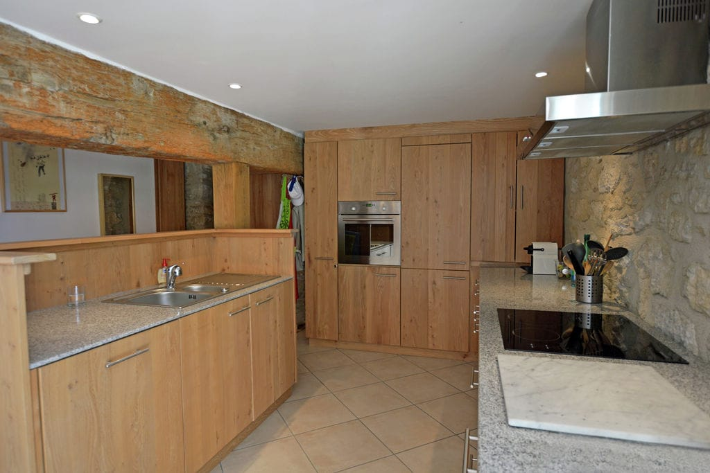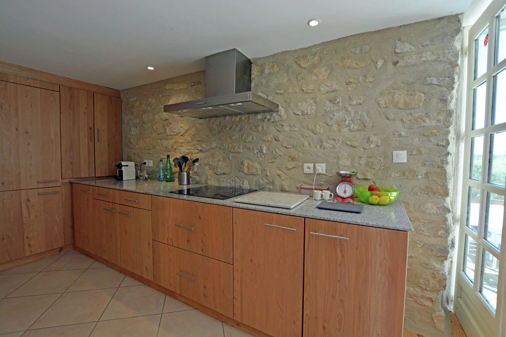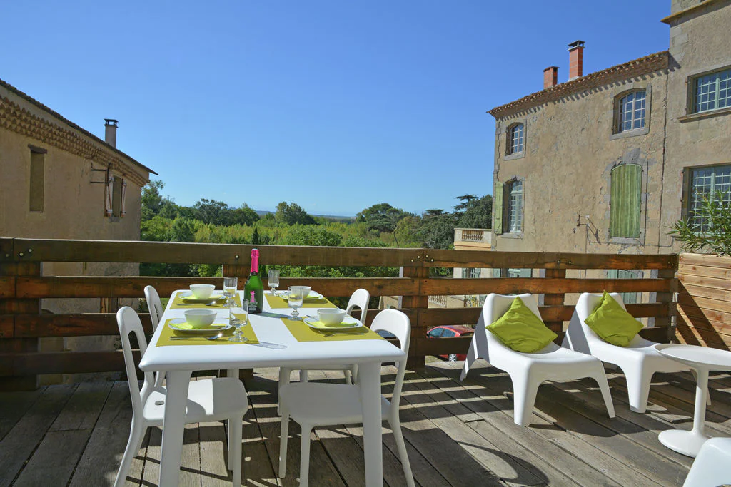Apartment in castle with large terrace and swimming pool The apartment is located in an old castle Le Puget near the Canal Du Midi in Alzonne near Carcassonne in the Languedoc region. The thick stone walls and centuries-old wooden beams give it a unique character. The apartment was created in 2011 in the old barns of the castle and combines history with modern comfort. The kitchen, dining and sitting area are open, which increases the feeling of space and open onto the south-facing terrace (3.5 x 8m) with spectacular views of the Pyrenees. The kitchen of solid elm wood with marble worktop is fully equipped with built-in hob, extractor hood, oven, fridge-freezer and dishwasher. There are two bedrooms, each with attached bathroom with walk-in shower.