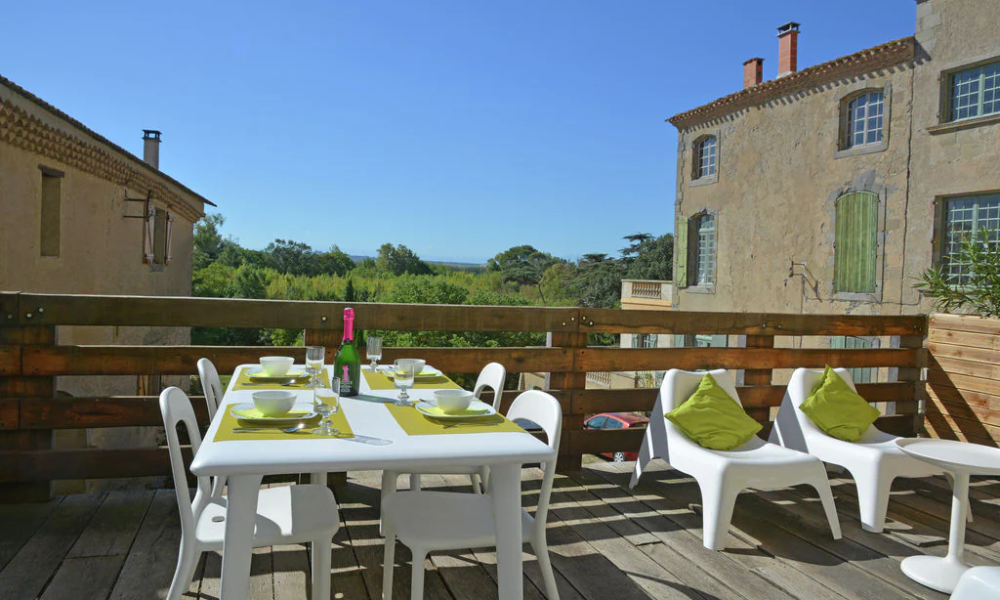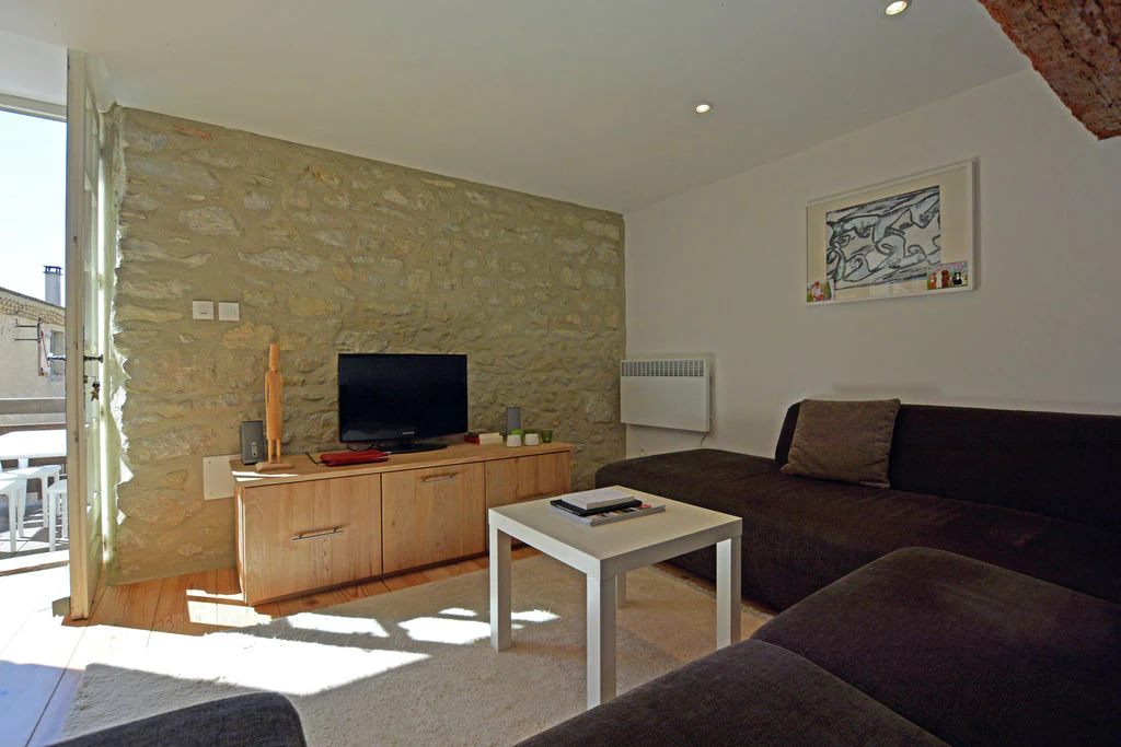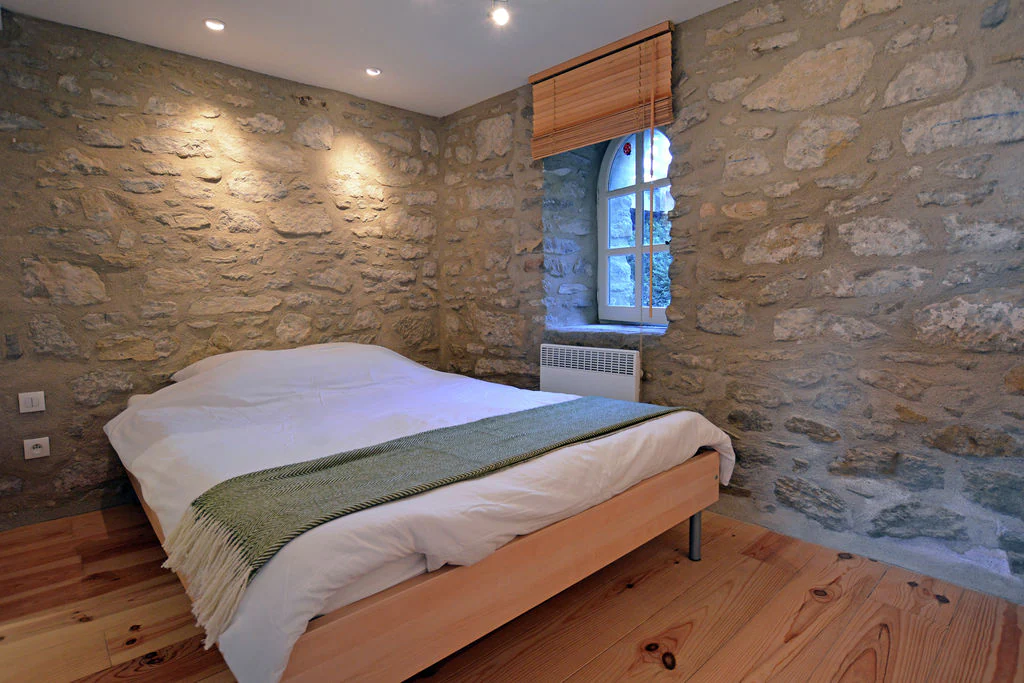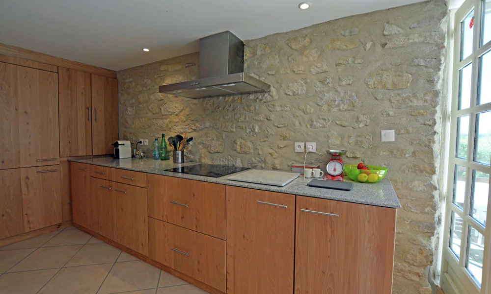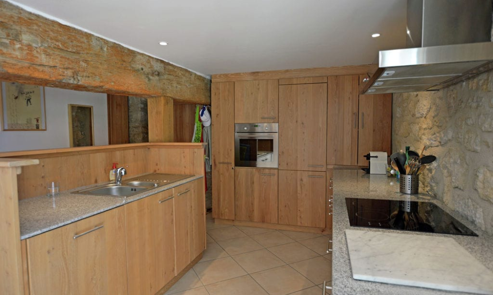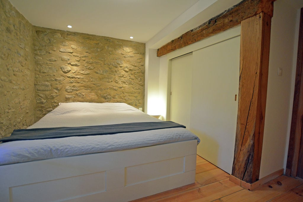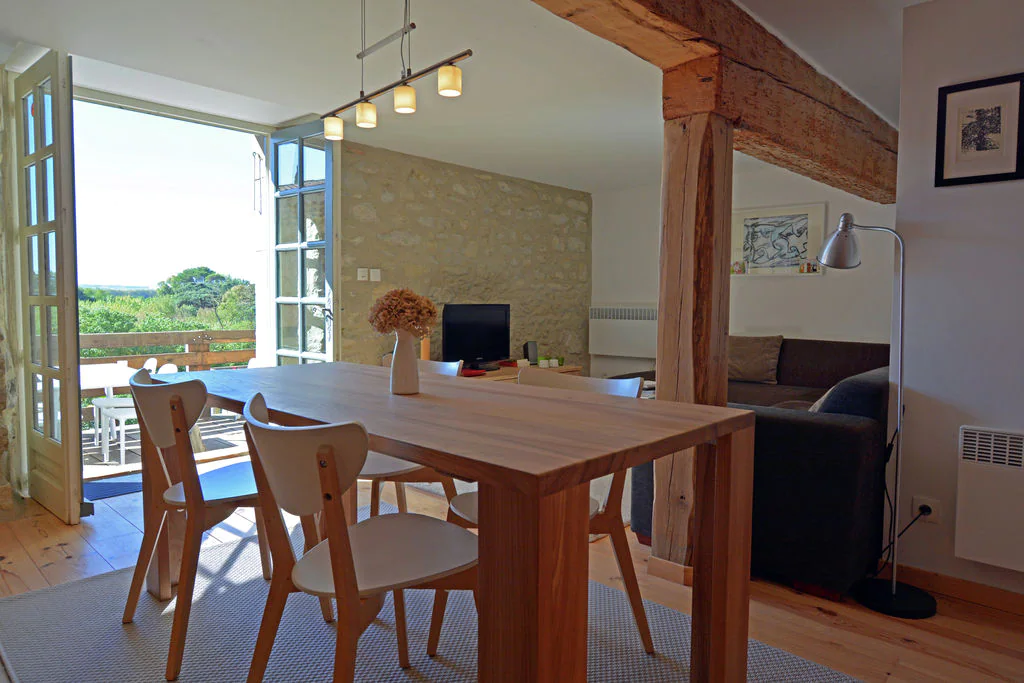Apartment in castle with large terrace and swimming pool The apartment is located in an old castle Le Puget near the Canal Du Midi in Alzonne near Carcassonne in the Languedoc region. The thick stone walls and centuries-old wooden beams give it a unique character. The apartment was created in 2011 in the old barns of the castle and combines history with modern comfort. The kitchen, dining and sitting area are open, which increases the feeling of space and open onto the south-facing terrace (3.5 x 8m) with spectacular views of the Pyrenees. The kitchen of solid elm wood with marble worktop is fully equipped with built-in hob, extractor hood, oven, fridge-freezer and dishwasher. There are two bedrooms, each with attached bathroom with walk-in shower.