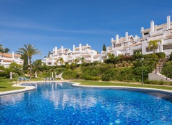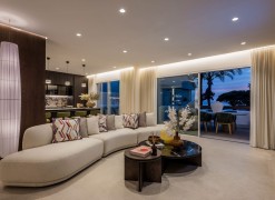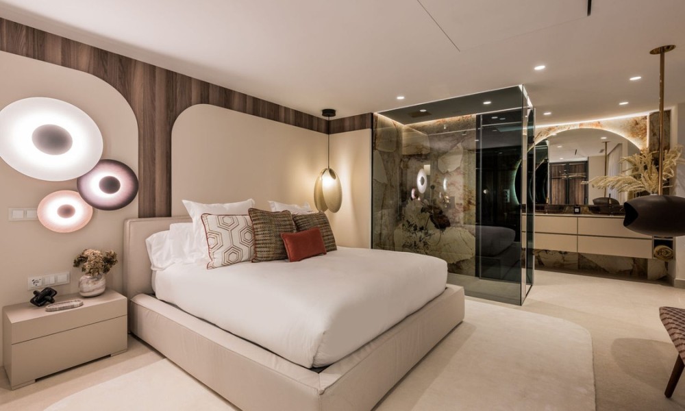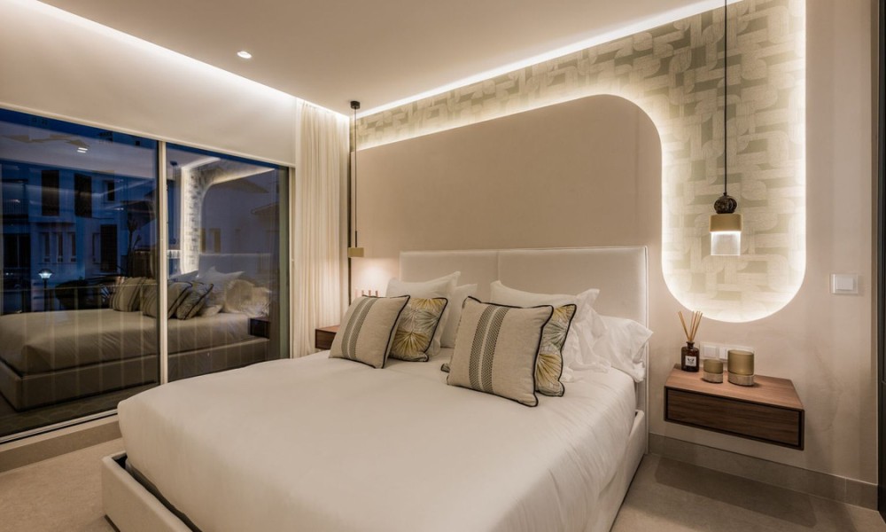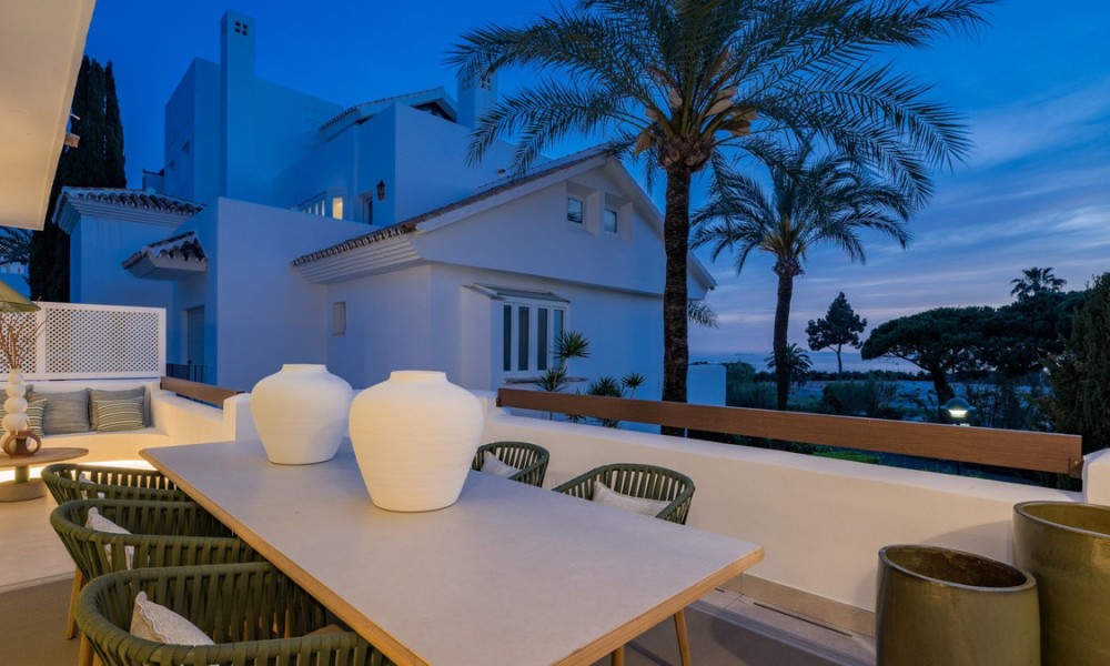 Located on Marbella’s eastern coast, this residence is situated within a secure, gated community that provides direct access to the beach. The property is a five-minute drive from the city center, allowing for easy access to local amenities and nearby golf courses. The apartment is positioned in a quiet area of the complex and faces southwest, which ensures consistent natural light throughout the afternoon.The interior has been renovated and features an open layout that connects the living areas to a terrace overlooking the communal subtropical gardens and the sea. The main living room is equipped with an integrated Bang & Olufsen sound system and an electric fireplace. For climate control, the property includes underfloor heating across all rooms. The kitchen is designed for functionality, containing a double dishwasher, a wine cabinet, and a Thermomix, alongside a dedicated bar area for hosting guests.