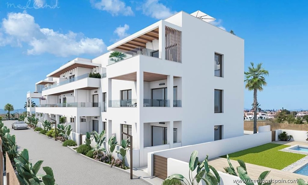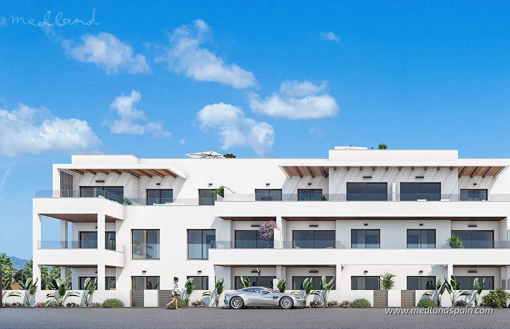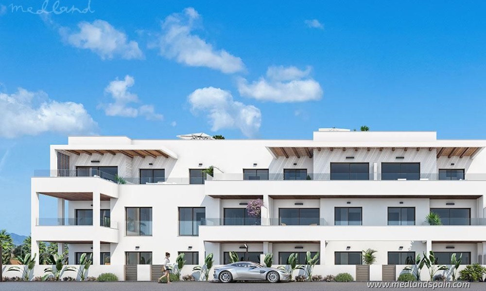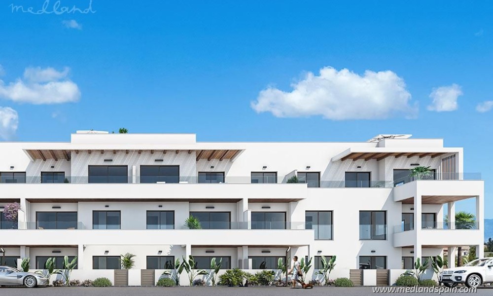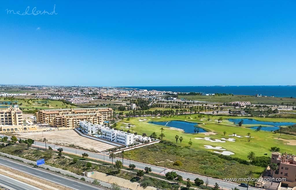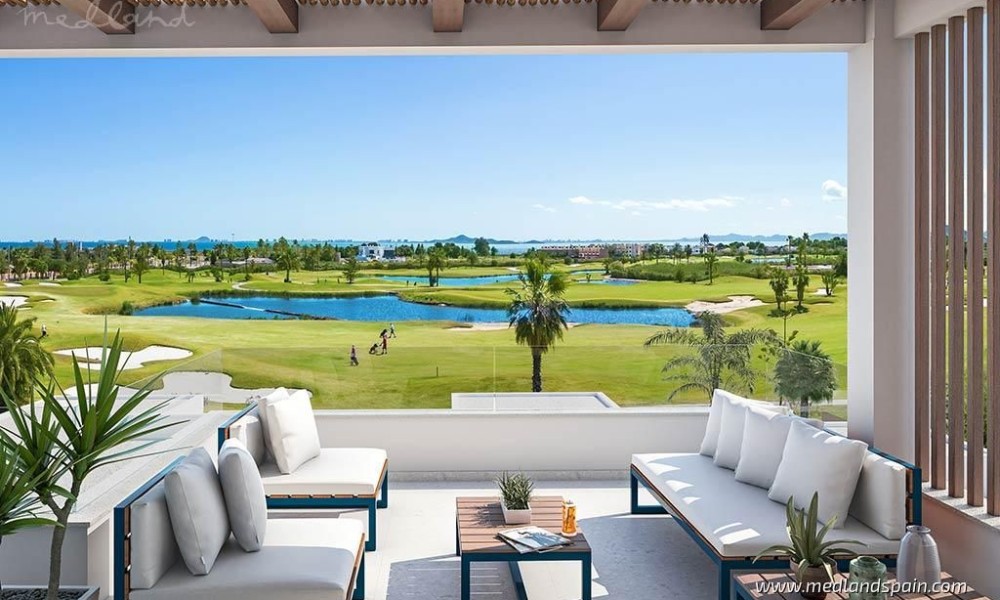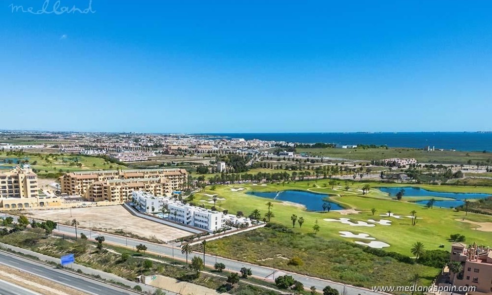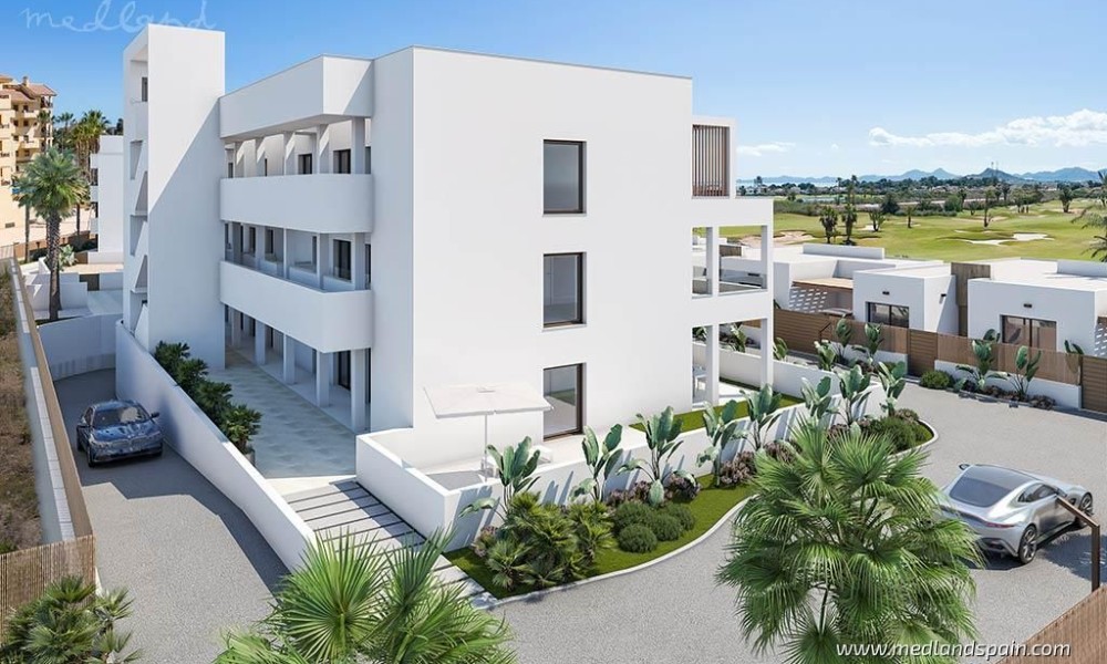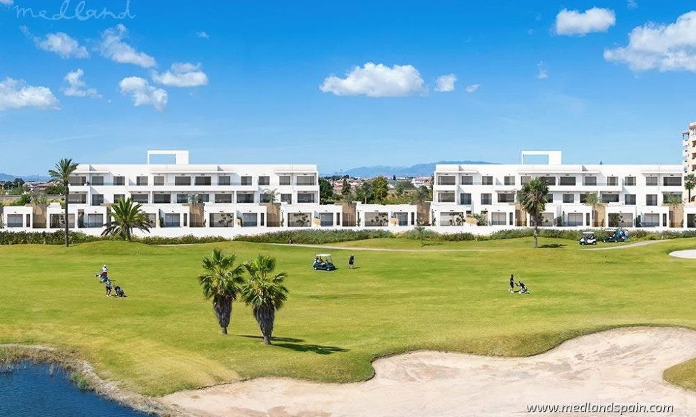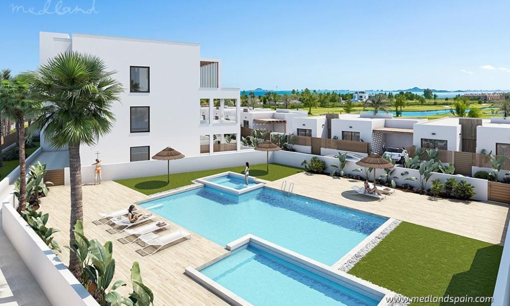New residential complex of apartments and detached villas in the La Serena Golf resort, in Los Alcazares on the Murcian coast. The resort includes an 18-hole golf course, as well as the Club House, with a pro-shop, a restaurant, and a terrace bar with views of the golf course and the Mar Menor. The town of Los Alcazares has a wide selection of amenities, like supermarkets, bars and restaurants, banks and pharmacies, schools, and a medical centre. The area also offers a variety of outdoor activities like golf, cycling, and mountain biking, as well as sailing or scuba diving at the beautiful Mar Menor beaches. The excellent road network makes it possible to reach the Murcia Airport in 30 minutes, while the Alicante airport can be reached in a little over an hour.The complex presents apartments with 2 bedrooms and 2 bathrooms, with a private garden or a spacious terrace; and penthouses with 3 bedrooms, 2 bathrooms, and a private solarium. All models present a spacious, open plan living area, combining the lounge, dining area and kitchen. The large windows in the lounge open onto a terrace, where the more than 320 days of sunshine a year can be enjoyed.