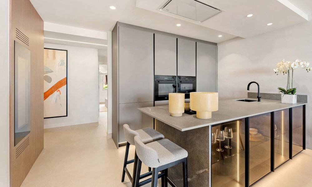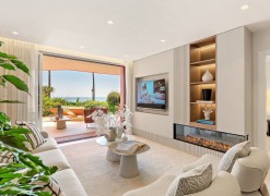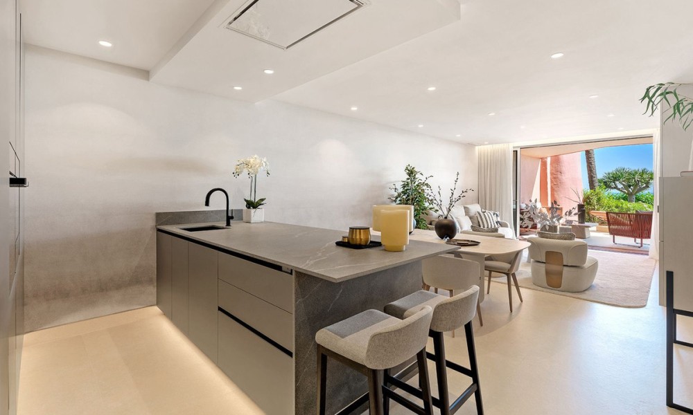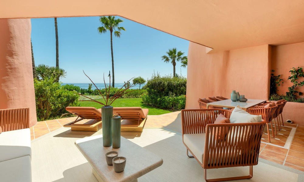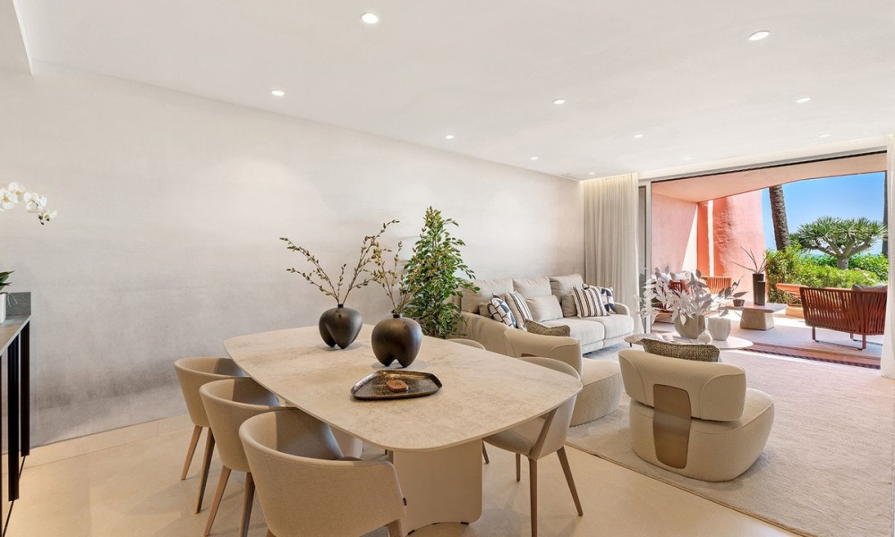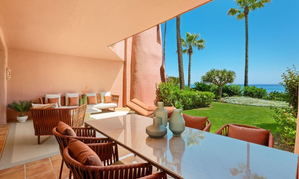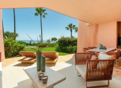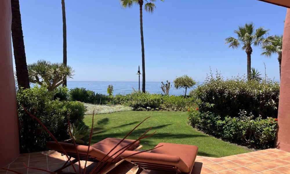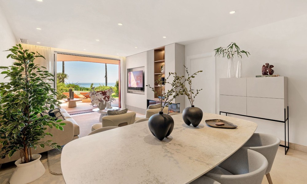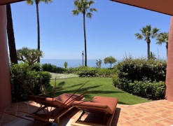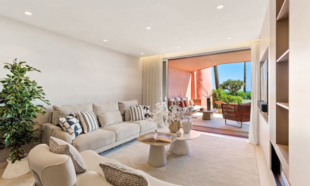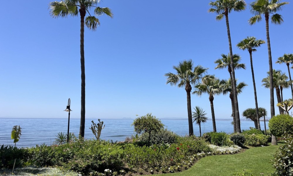 The residence is located on the beachfront in Estepona. This ground-floor property has been recently renovated and includes double glazing, air conditioning, a fireplace, and underfloor heating throughout.The interior consists of an open-plan living area and a fully equipped kitchen. The sleeping quarters include three bedrooms and two bathrooms. Due to the southwest orientation, the living spaces receive natural light throughout the day.