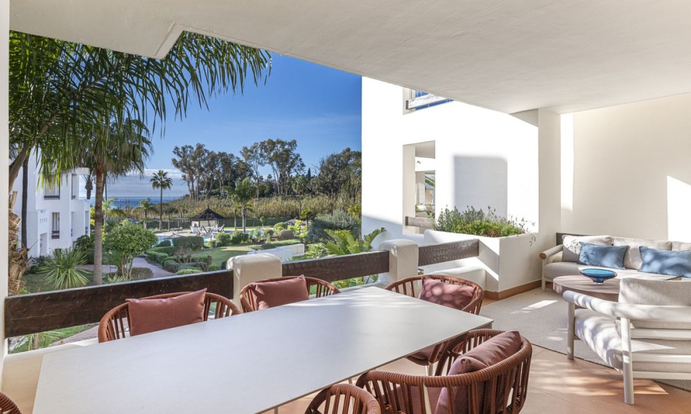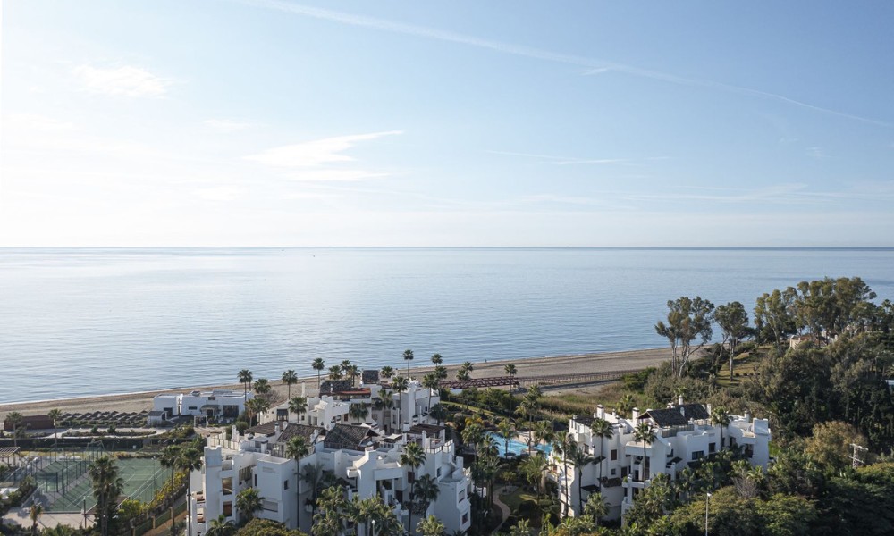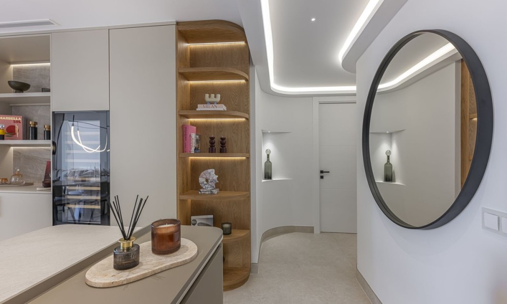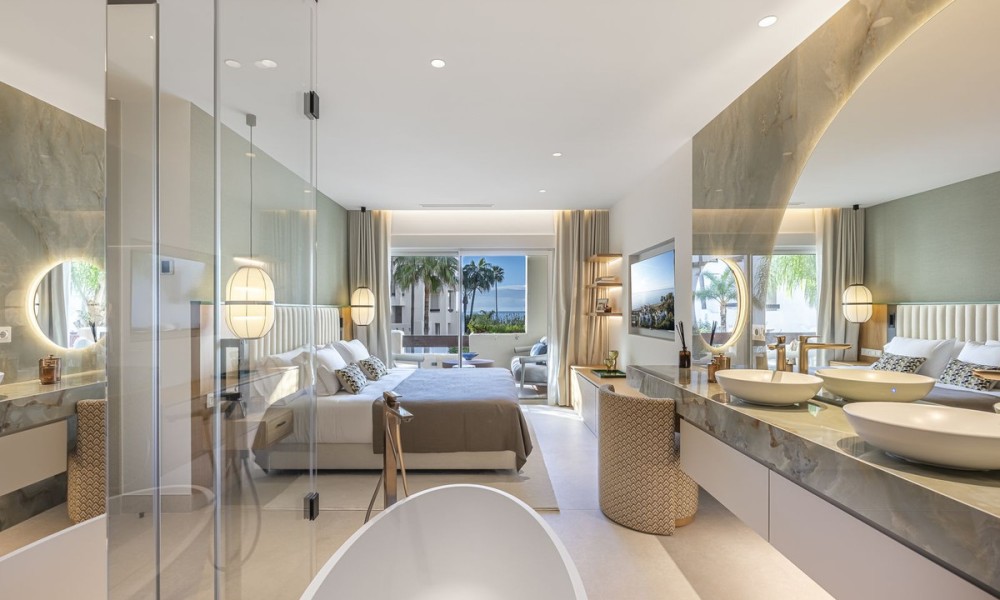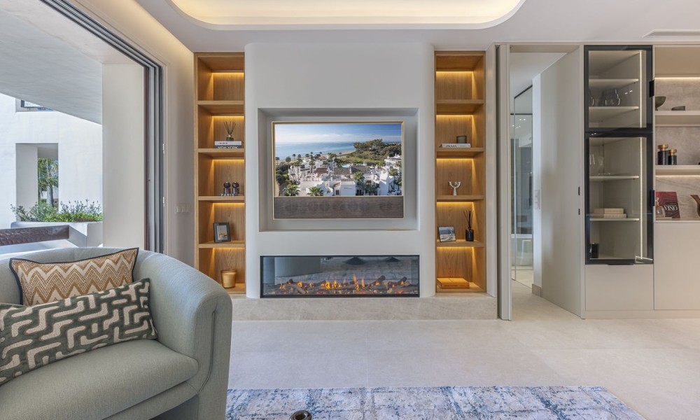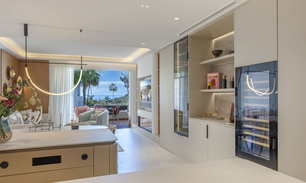 Located on the coastline between Marbella and Estepona, this property provides direct access to the beach and local maritime amenities. The apartment has been fully refurbished with contemporary finishes and high-quality materials. The architectural design focuses on a modern aesthetic, utilizing premium German appliances and bespoke cabinetry to create a functional and updated environment.The main living area uses an open-plan configuration to connect the kitchen and lounge. This space includes an electric fireplace, a Bang & Olufsen sound system, and specialized kitchen equipment such as a Thermomix, a wine cabinet, and an invisible hob. Domestic tasks are supported by a hidden laundry area and a separate storage room, ensuring the living space remains organized.The sleeping quarters are designed with integrated storage, including a walk-in closet and custom wardrobes. The bathrooms are fitted with Japanese toilets, and underfloor heating is installed across the entire floor plan to maintain a consistent temperature.