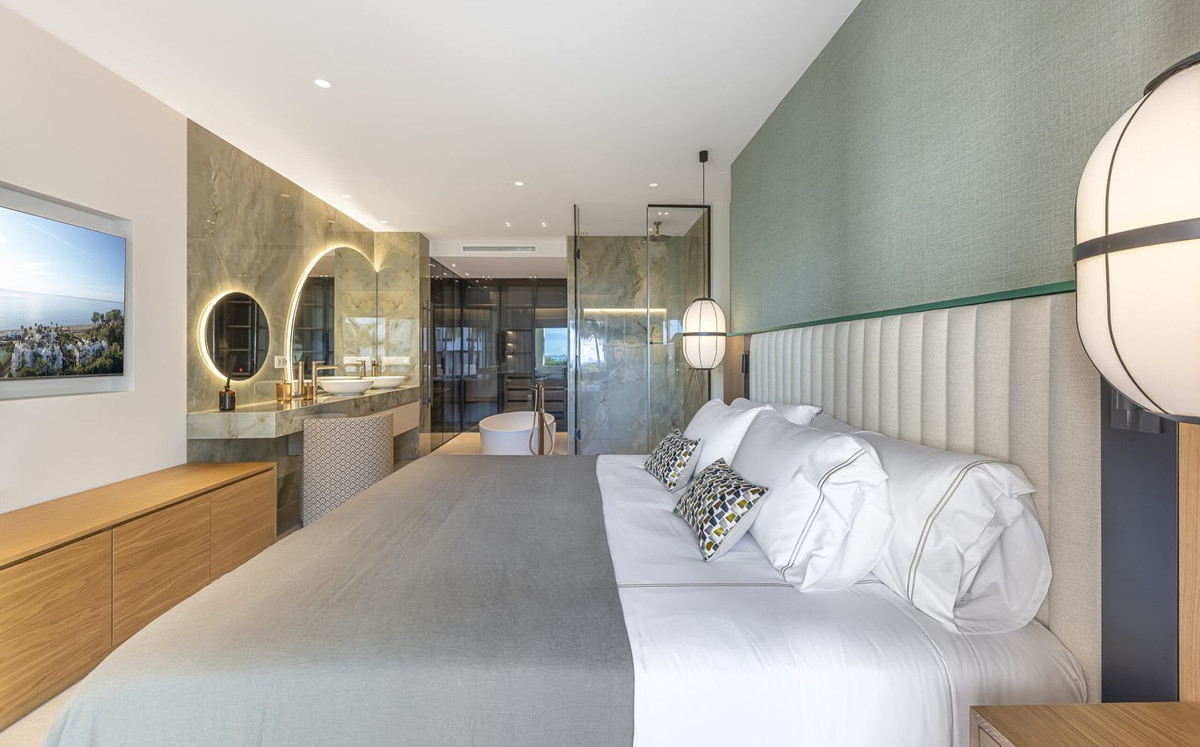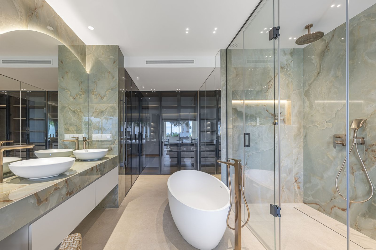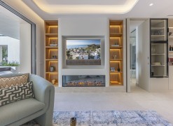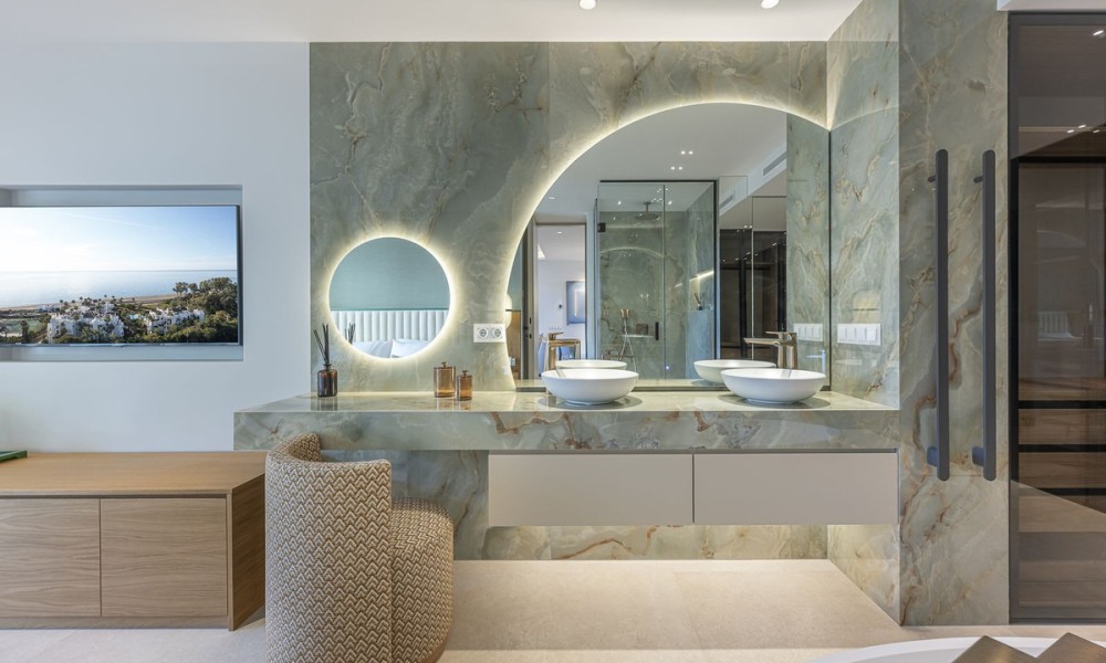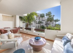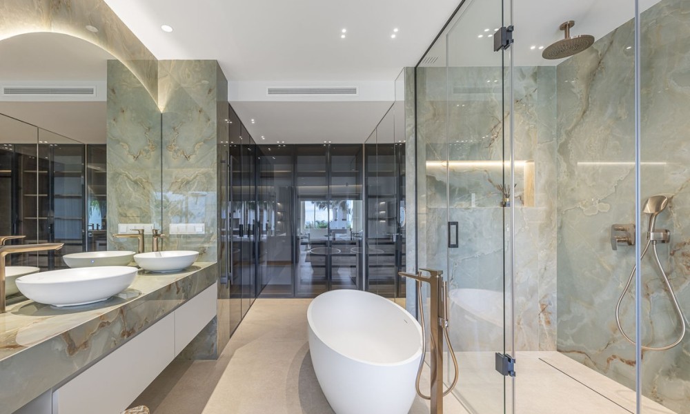 Located on the coastline between Marbella and Estepona, this property provides direct access to the beach and local maritime amenities. The apartment has been fully refurbished with contemporary finishes and high-quality materials. The architectural design focuses on a modern aesthetic, utilizing premium German appliances and bespoke cabinetry to create a functional and updated environment.The main living area uses an open-plan configuration to connect the kitchen and lounge. This space includes an electric fireplace, a Bang & Olufsen sound system, and specialized kitchen equipment such as a Thermomix, a wine cabinet, and an invisible hob. Domestic tasks are supported by a hidden laundry area and a separate storage room, ensuring the living space remains organized.The sleeping quarters are designed with integrated storage, including a walk-in closet and custom wardrobes. The bathrooms are fitted with Japanese toilets, and underfloor heating is installed across the entire floor plan to maintain a consistent temperature.