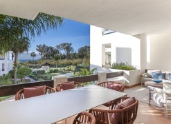 These features are complemented by contemporary furniture and high-standard flooring throughout the interior.The living area opens directly onto a terrace that provides views of the sea and the landscape. This outdoor space is designed for dining and seating, taking advantage of the property’s orientation and the local climate. The transition between the interior and the terrace is level, facilitating regular use of the outdoor area.The gated community includes managed tropical gardens and a swimming pool with a snack bar. Security personnel are on-site twenty-four hours a day to monitor the premises. Its location allows for direct walking access to the shore and is within a short distance of various coastal facilities and services.