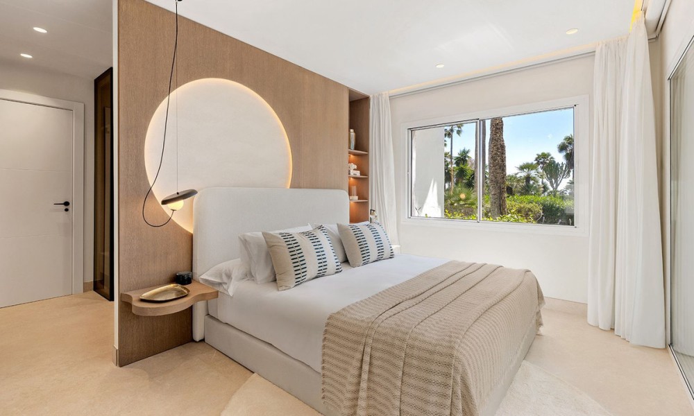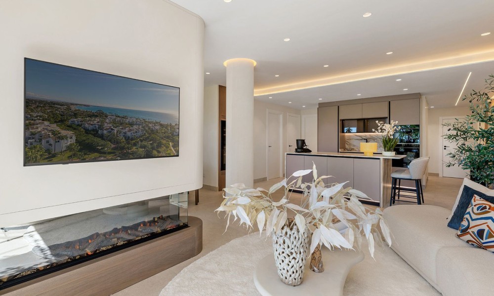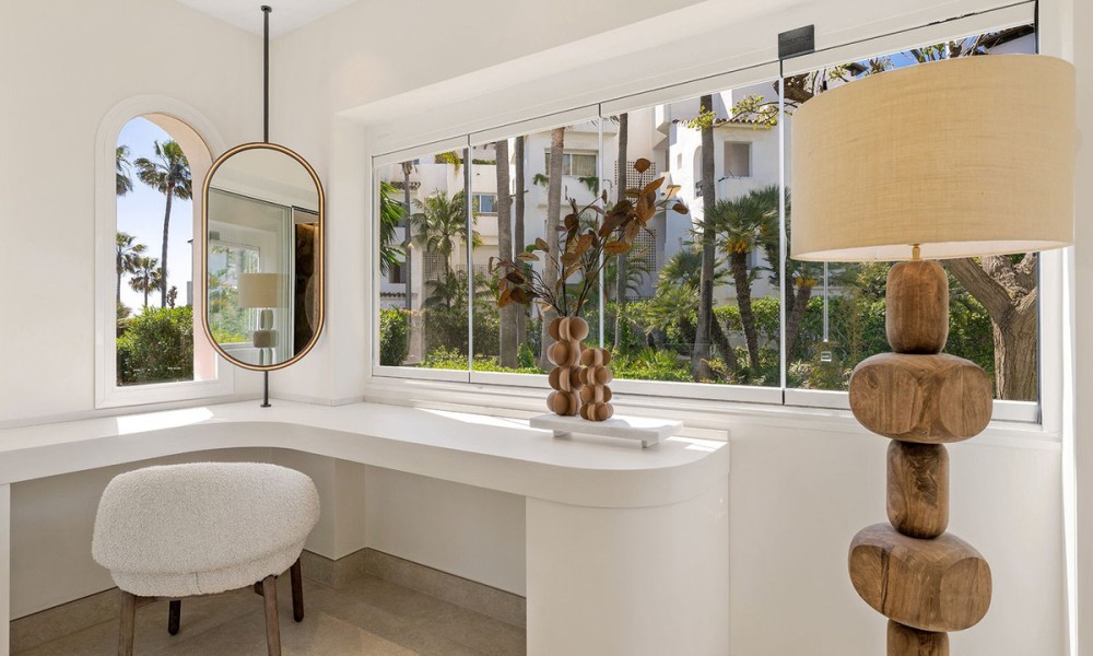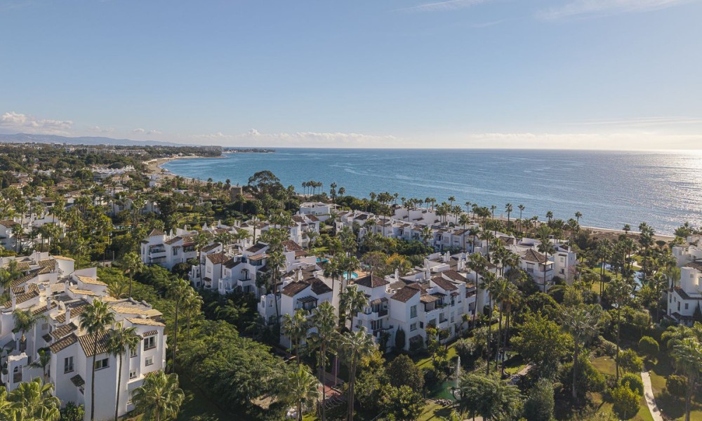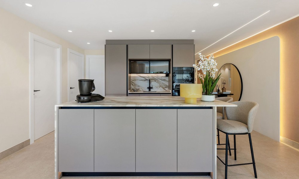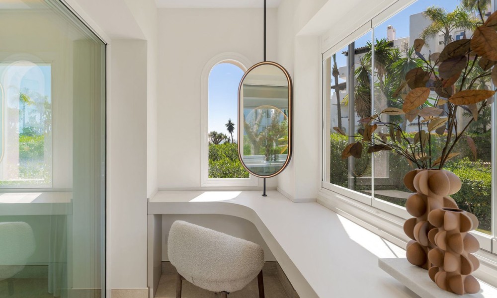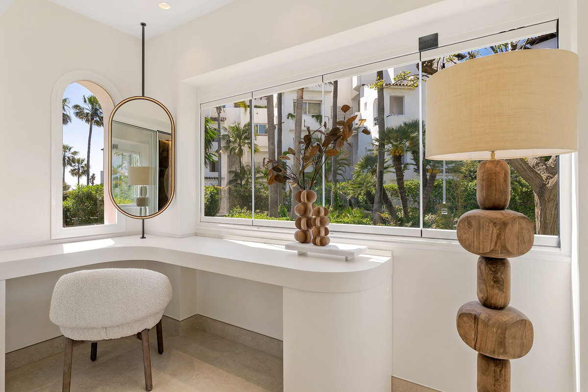 Underfloor heating is installed across the interior to manage the ambient temperature effectively.The three bedrooms are designed for utility and comfort, featuring contemporary bathrooms with high-end fixtures. The primary bedroom includes a walk-in closet for organized storage. Each room follows the same design principles of the main living areas, focusing on clean lines and quality finishes.Located within a secure complex, the property is set among landscaped gardens and communal pools. The community provides direct access to the beach and the coastal promenade, facilitating pedestrian access to the Mediterranean shore. Positioned on the New Golden Mile, the location allows for short commutes to regional golf courses and local restaurants, combining a private residential setting with proximity to established coastal infrastructure.