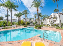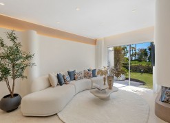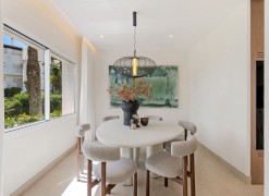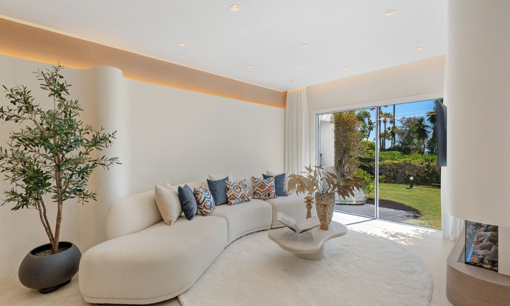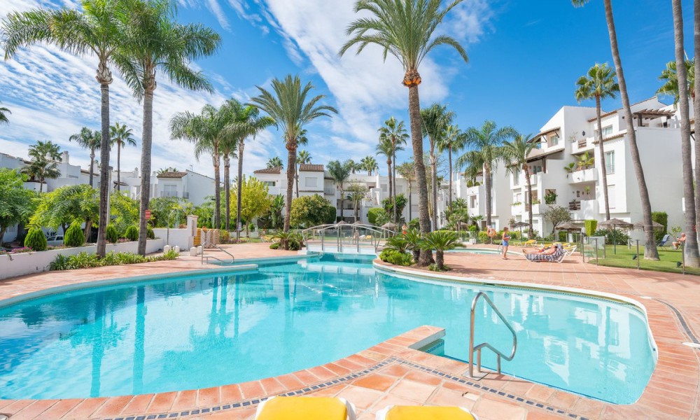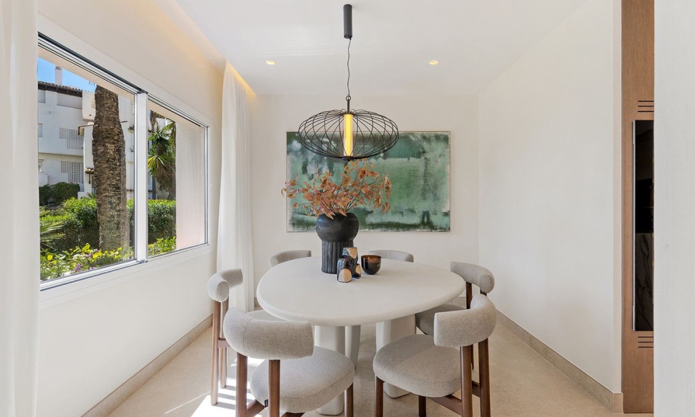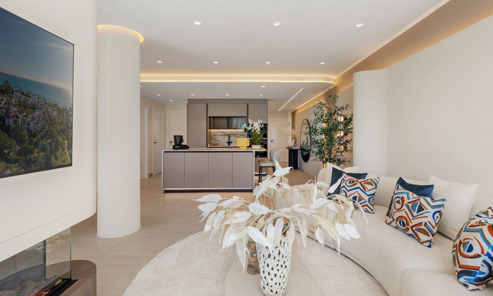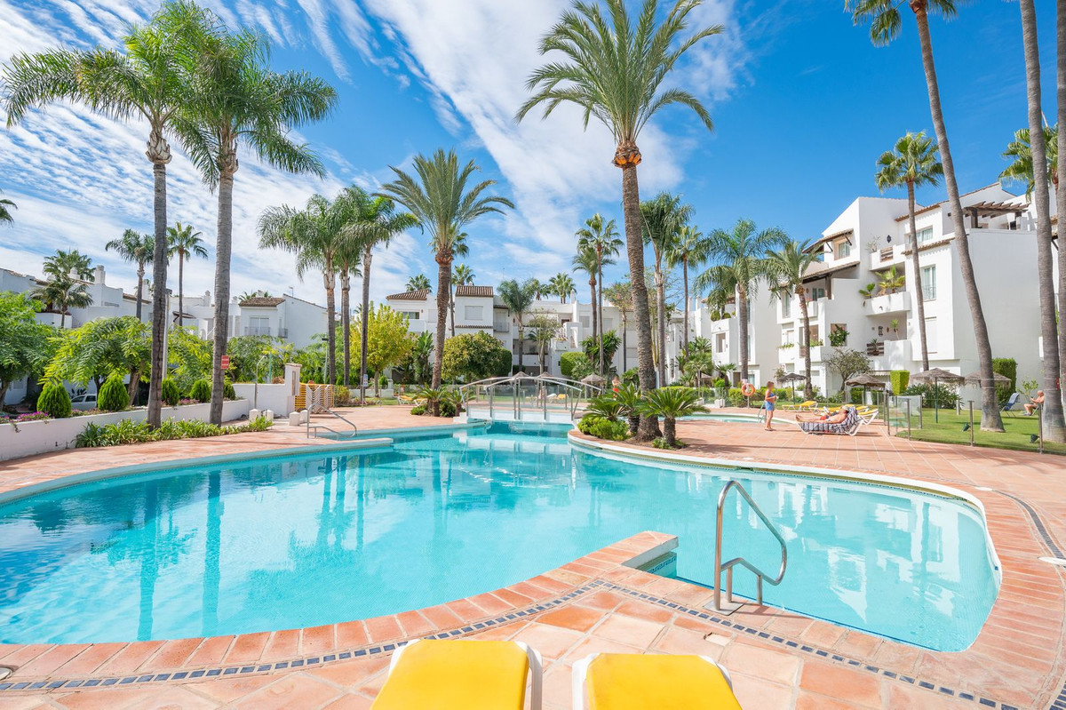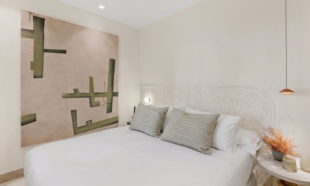 Underfloor heating is installed across the interior to manage the ambient temperature effectively.The three bedrooms are designed for utility and comfort, featuring contemporary bathrooms with high-end fixtures. The primary bedroom includes a walk-in closet for organized storage. Each room follows the same design principles of the main living areas, focusing on clean lines and quality finishes.Located within a secure complex, the property is set among landscaped gardens and communal pools. The community provides direct access to the beach and the coastal promenade, facilitating pedestrian access to the Mediterranean shore. Positioned on the New Golden Mile, the location allows for short commutes to regional golf courses and local restaurants, combining a private residential setting with proximity to established coastal infrastructure.
