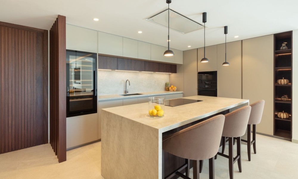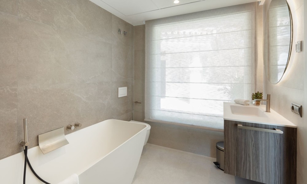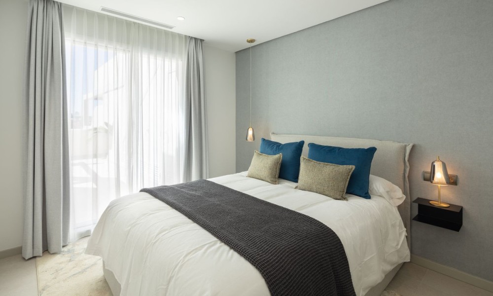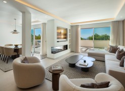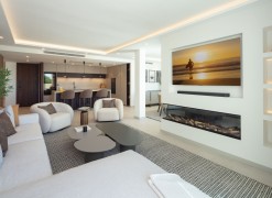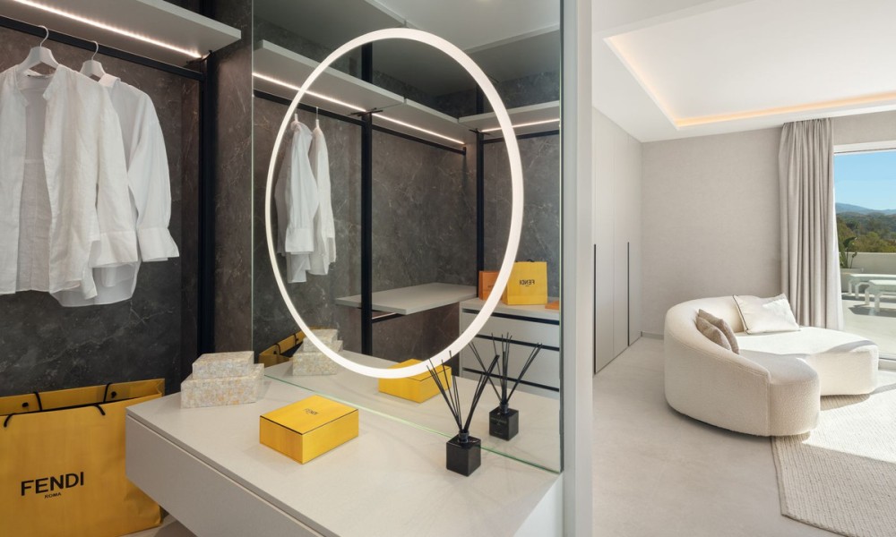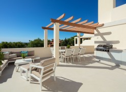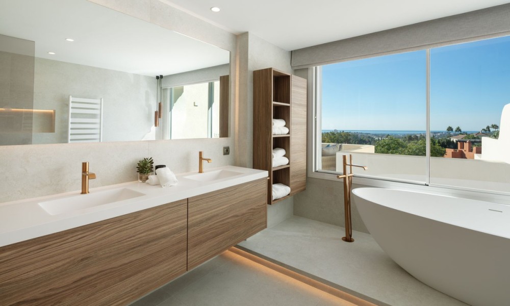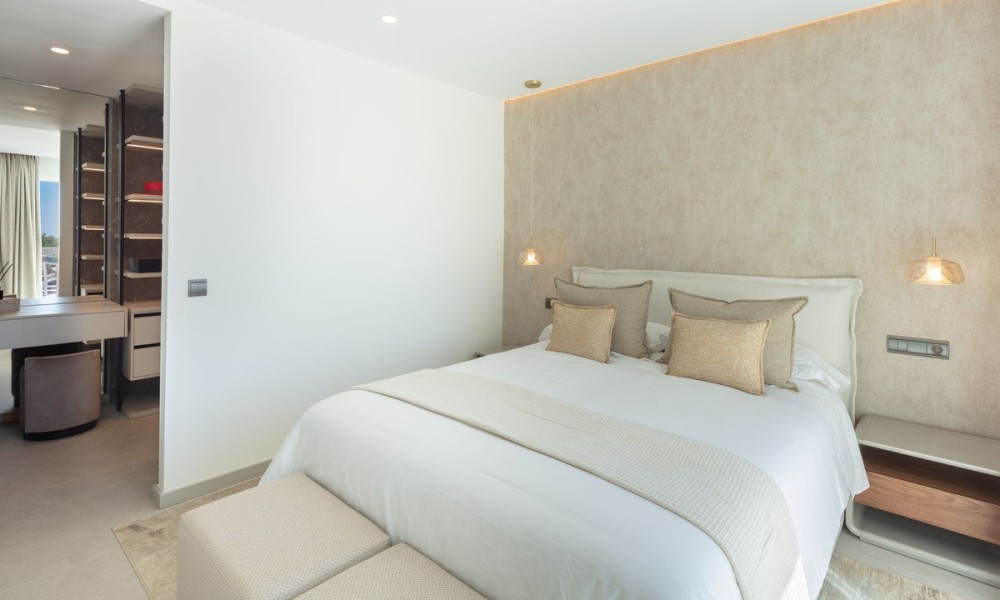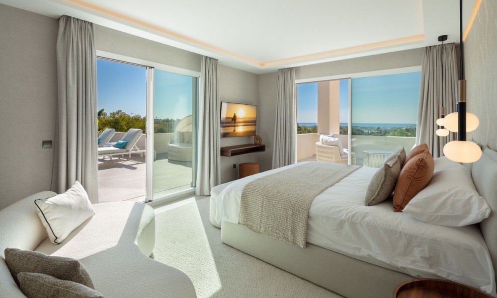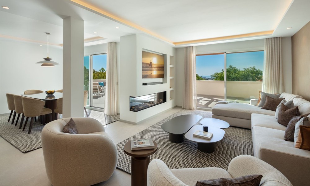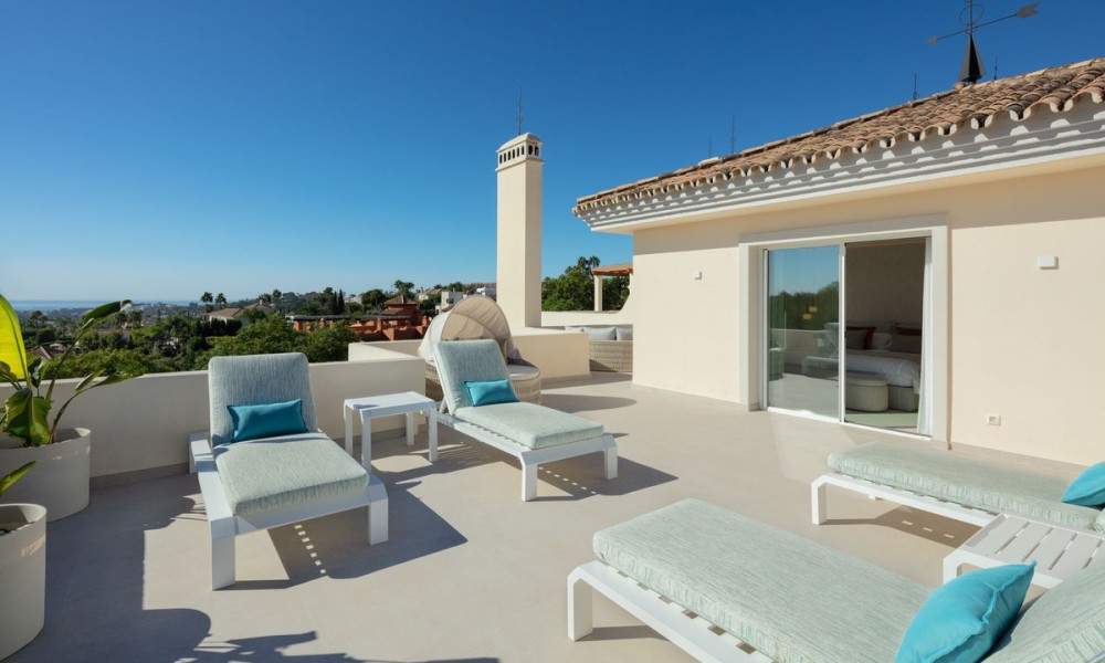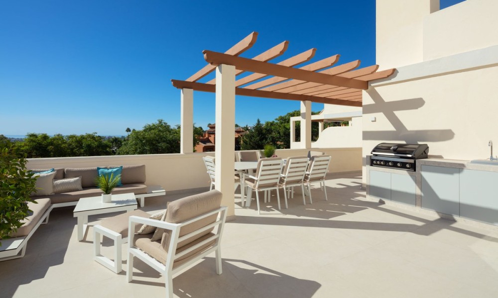 Luxury penthouse duplex with sea and mountain views in Nueva Andalucia, offering unparalleled privacy and security with private lift access and gated stairs. Revel in the spectacular views of the sea, lake, and La Concha mountain from spacious outdoor terraces. Modern design meets comfort with a fully-equipped kitchen, wine cooler, and elegant living spaces opening onto an expansive terrace with an outdoor kitchen and BBQ. Features two elegant en-suite bedrooms, a lavish primary suite with a walk-in closet, and a bathroom with sea views.