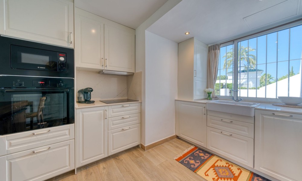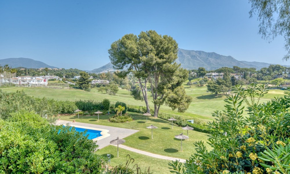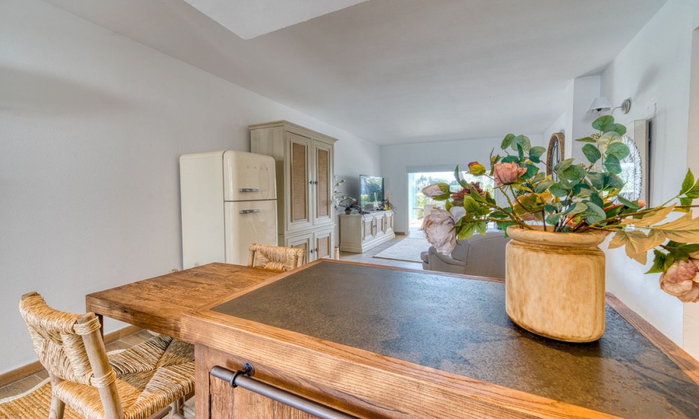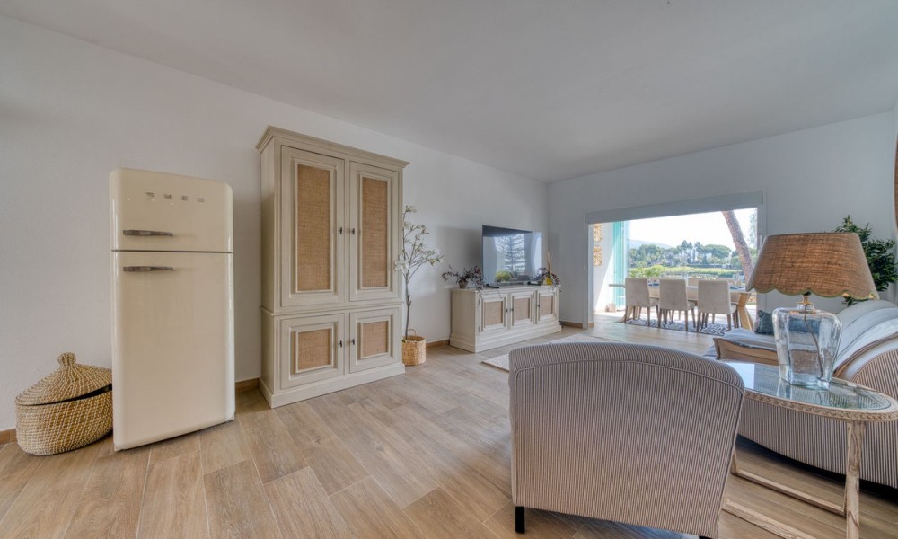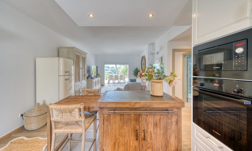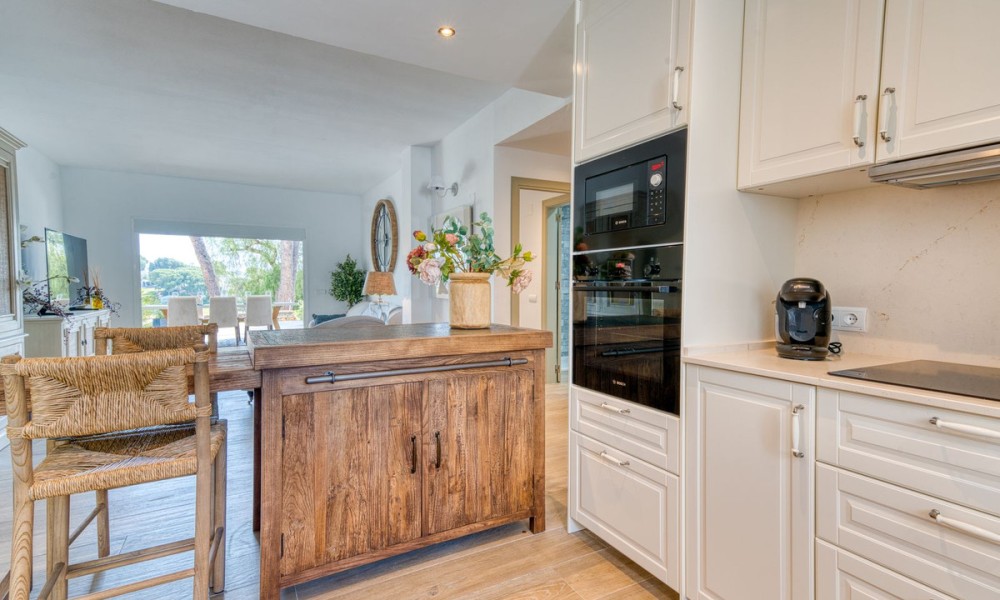 Set within one of Aloha’s most sought-after gated communities in Nueva Andalucía, this beautifully reimagined garden apartment combines elegant contemporary design with exceptional outdoor living, all within a short stroll of local amenities and just minutes from Marbella’s finest golf courses, restaurants and Puerto Banús.Enjoying an enviable frontline golf position, the property captures sweeping views across Aloha Golf Club towards the mountains and the Mediterranean Sea beyond, creating a tranquil and highly desirable setting.The apartment has been comprehensively refurbished to a high standard throughout, offering stylish turnkey living with carefully selected finishes and quality furnishings imported from the UK. The open-plan lounge and dining area is bright and welcoming, flowing seamlessly onto the terrace and immaculate communal gardens with direct access to the swimming pool.At the heart of the home is a superb bespoke kitchen featuring quartz worktops, a freestanding island with extendable seating for four, a Butler sink, large pantry storage and a full suite of integrated Bosch appliances including oven, microwave, dishwasher, hob and washing machine.