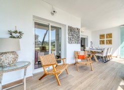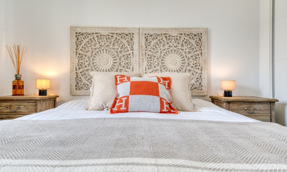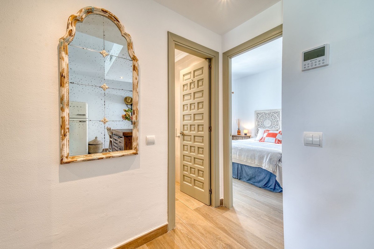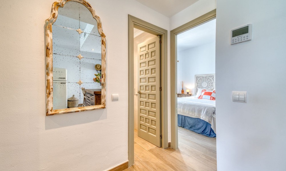 A statement SMEG fridge/freezer completes the space.There are two generous double bedrooms, including a refined principal suite with elegant en-suite bathroom finished with premium Porcelanosa wall tiles, a marble vanity unit with double sinks, underfloor heating and heated towel rails. A separate guest bathroom has also been beautifully upgraded to the same exacting standard.Further features include wide plank wood-effect Porcelanosa flooring throughout the interior and extending onto the terraces, new hot and cold air-conditioning, a mains gas boiler, glass curtains spanning the full width of the rear terrace, external taps to both front and rear terraces, and secure covered communal parking bays.Outside, the private terrace has been thoughtfully enhanced to maximise the panoramic golf, mountain and sea views the perfect setting for al fresco dining, entertaining or simply enjoying the Marbella lifestyle year-round.A stylish, fully furnished home in a prime Golf Valley location, offering quality, comfort and outstanding views this is a must-see property for buyers seeking a turnkey residence or luxury holiday retreat in Nueva Andalucía.