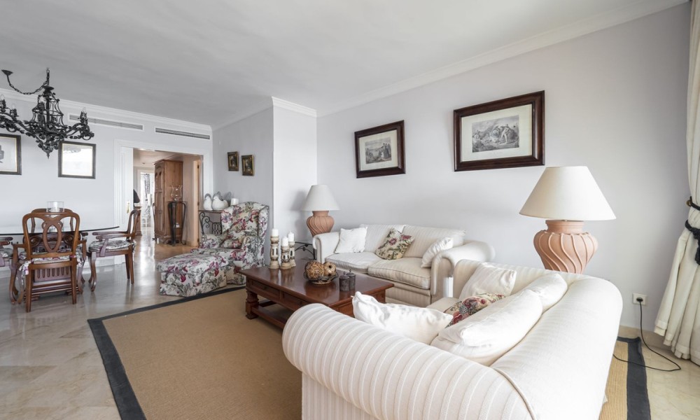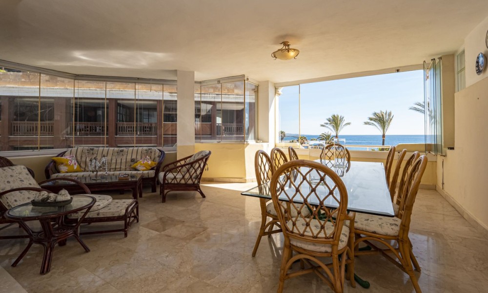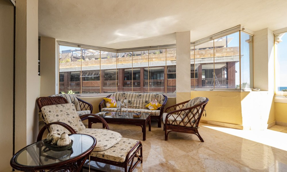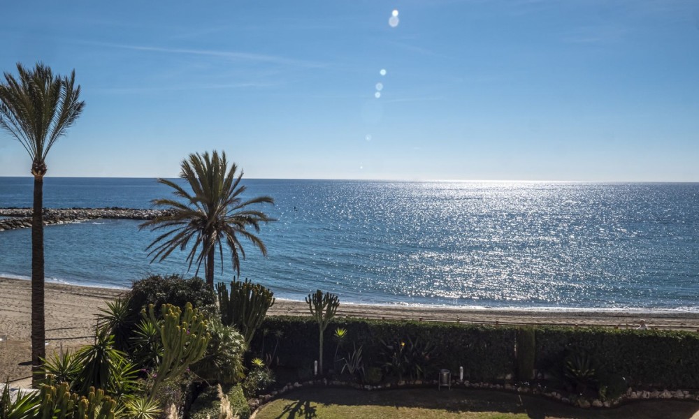 Front line beach apartment located next to Puerto Banus Marina. This second floor facing south to east, with direct views to the beach and sea, walking distance to Puerto Banus. Living and dining area, fitted kitchen, spacious master bedroom en suite, one guest bedroom and bathroom.