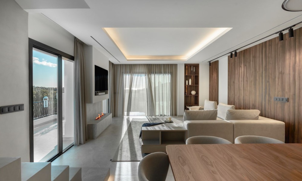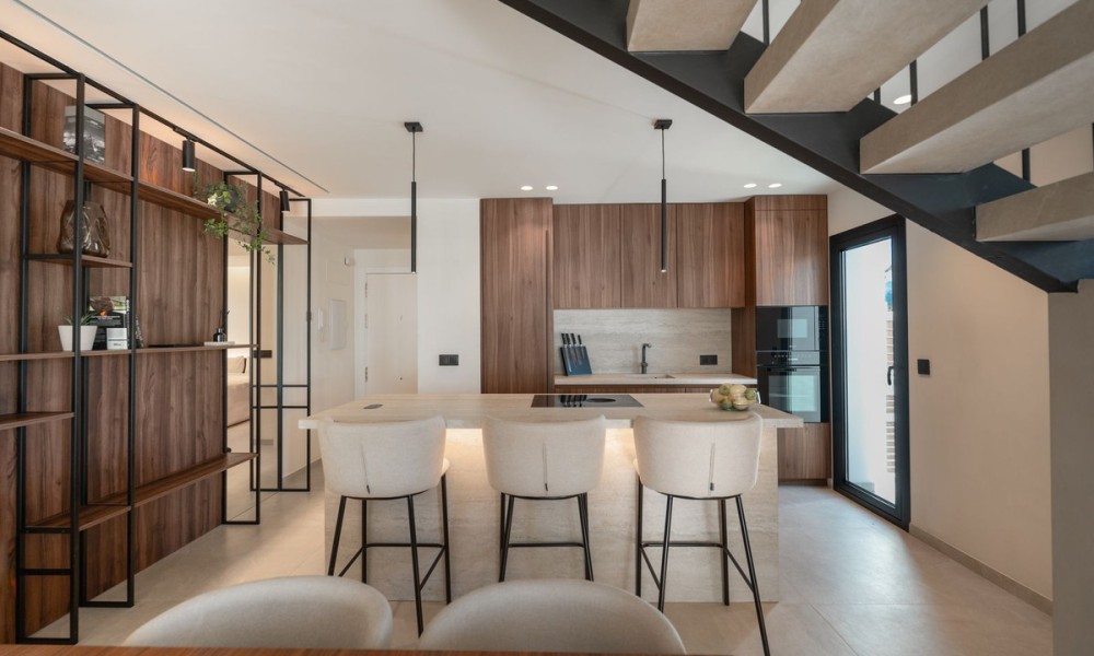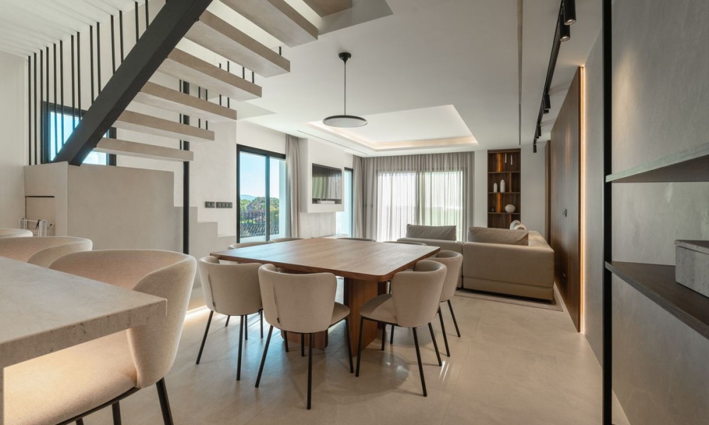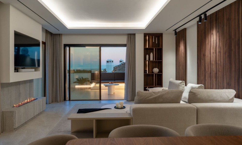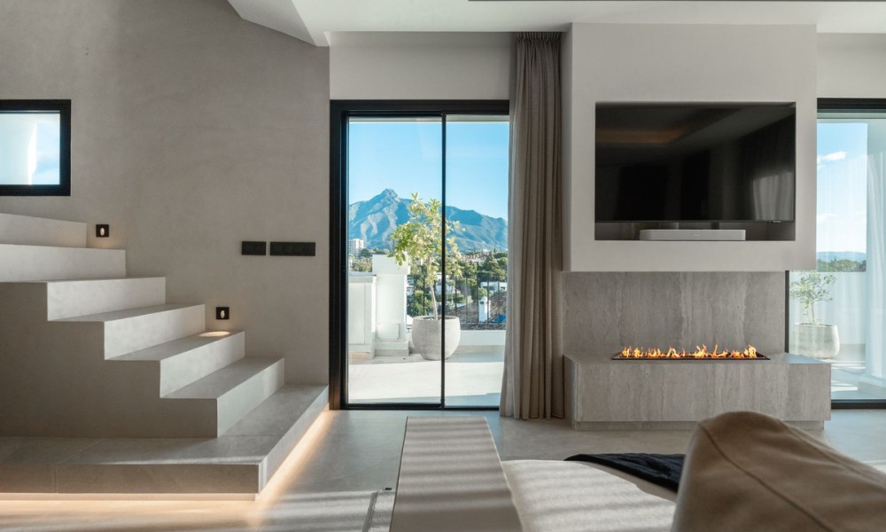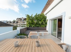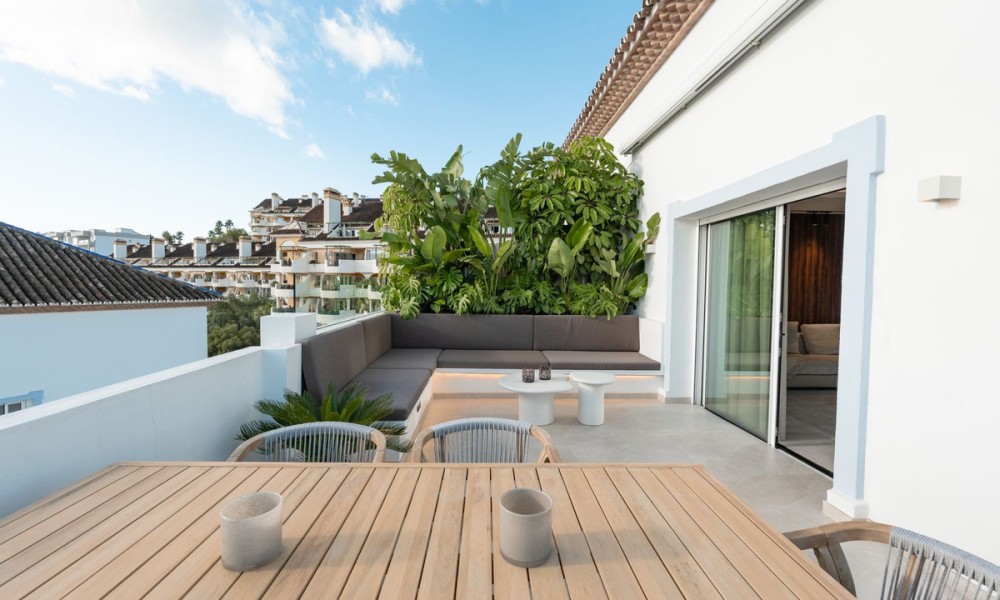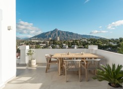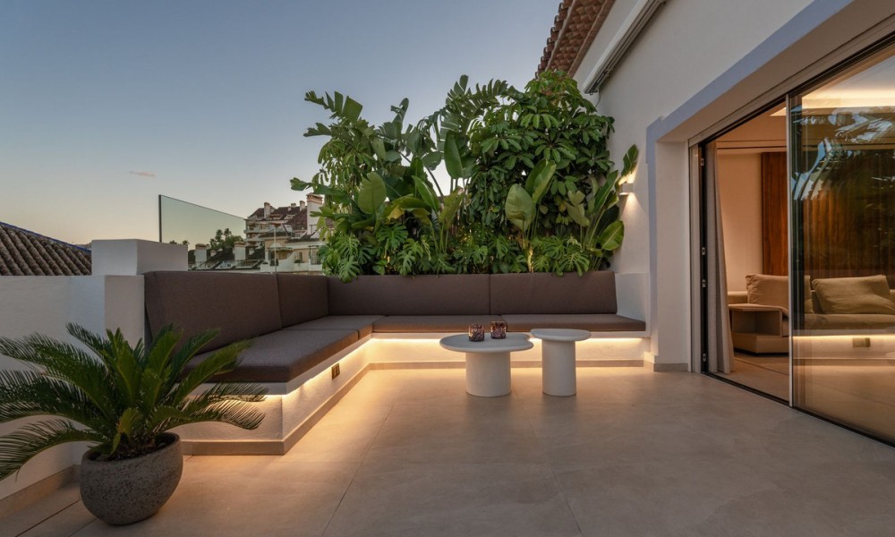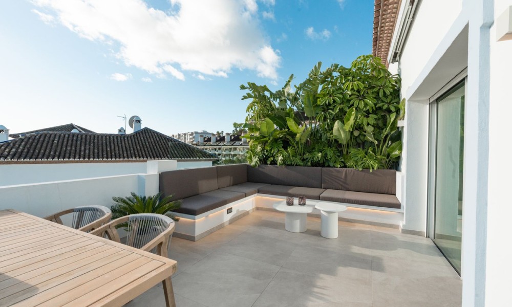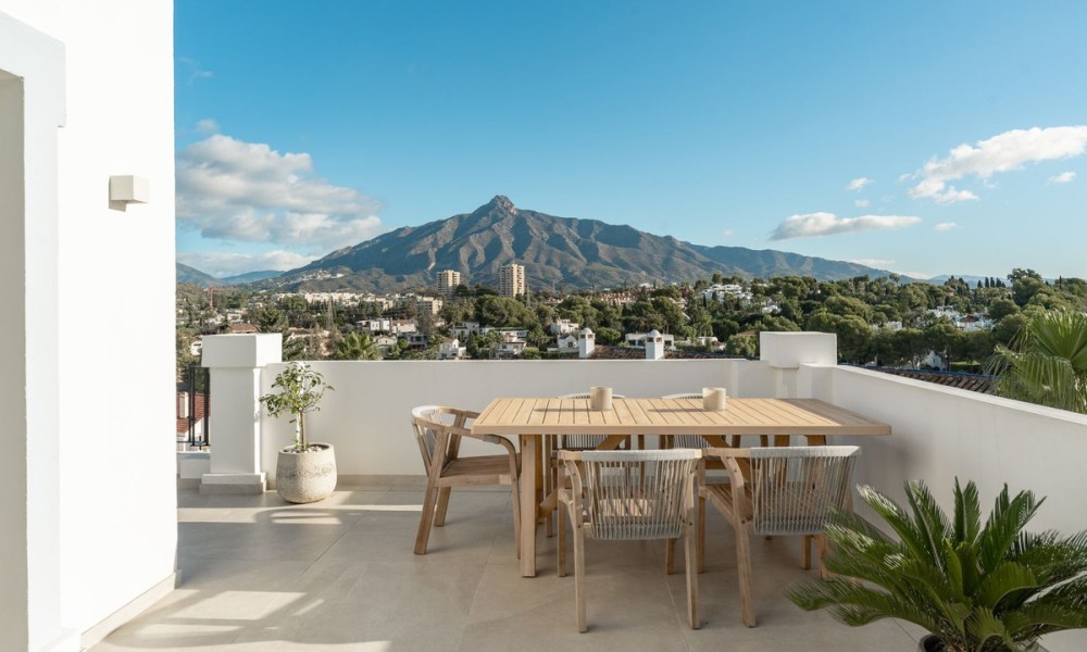 Stunning Fully Refurbished Duplex Penthouse | Nueva Andalucía, MarbellaThis beautifully renovated duplex penthouse is located within a highly sought-after gated community in Nueva Andalucía, just moments from Puerto Banús. Designed with style and sophistication, the property combines luxurious interiors with exceptional outdoor living and panoramic views.Offering 160 m² of interior space and a 66 m² terrace, the penthouse enjoys breathtaking views of the mountains and Mediterranean Sea from every angle. The spacious living and dining area is elegantly furnished, featuring bespoke cabinetry and high-quality finishes that create an inviting and contemporary feel.The home includes three bright and spacious bedrooms, each with its own modern en-suite bathroom, ensuring complete privacy and comfort for residents and guests alike.