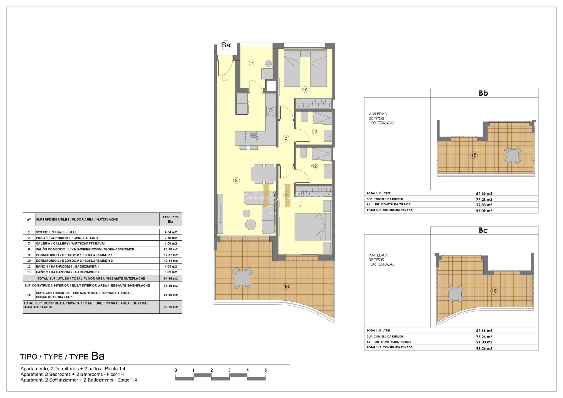 There are apartments with 2 and 3 bedrooms and 2 bathrooms with different typologies depending on the height.