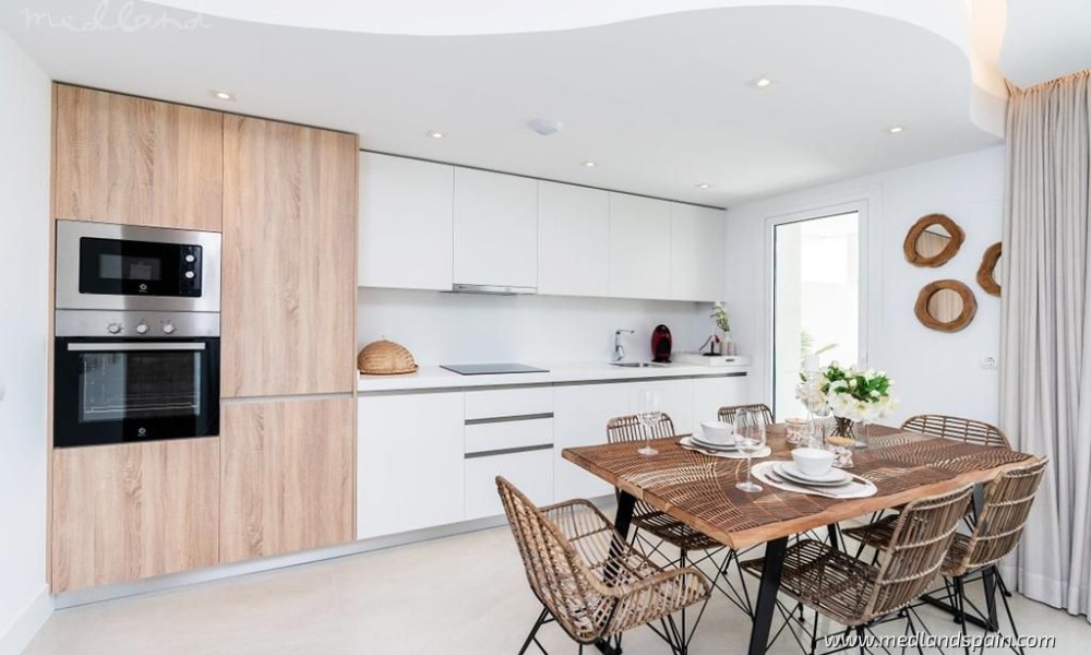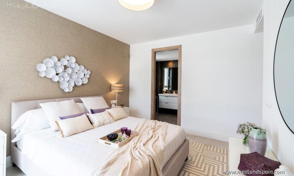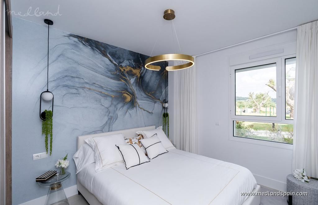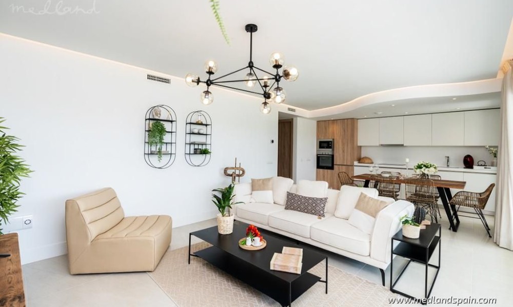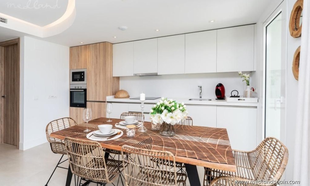 Each apartment has a spacious living room with access to the large open terrace that offers wonderful views of the golf course and the sea. The apartments are built with top quality materials, large windows, kitchens fully equipped with white goods and A/C. All apartments include a parking space and a storage room in the underground parking garage.The residential will have several community pools, garden areas with pedestrian paths, and a large leisure area approx. the size of three football fields.
