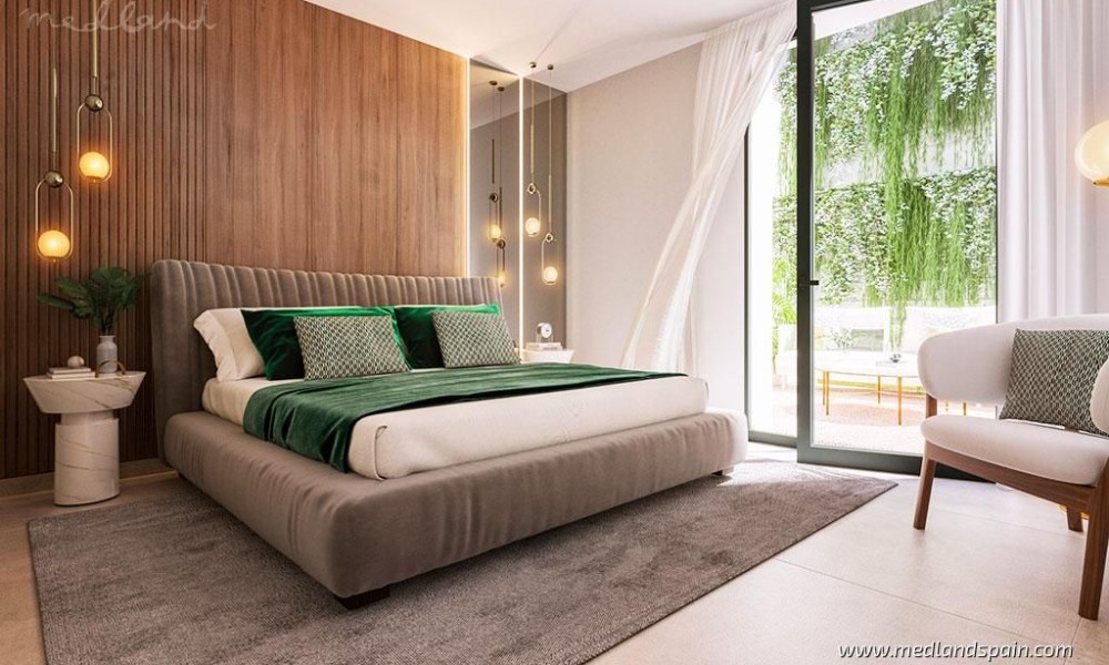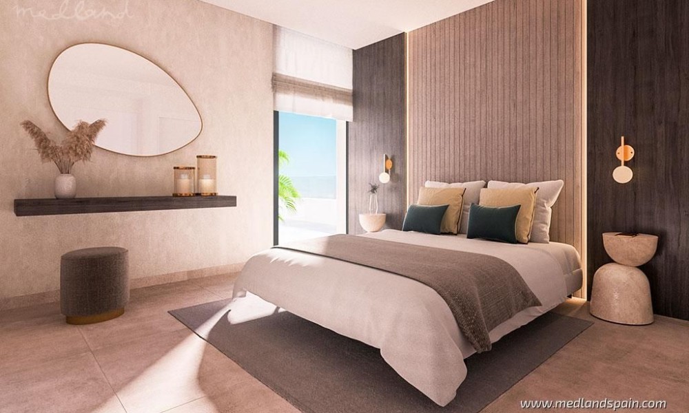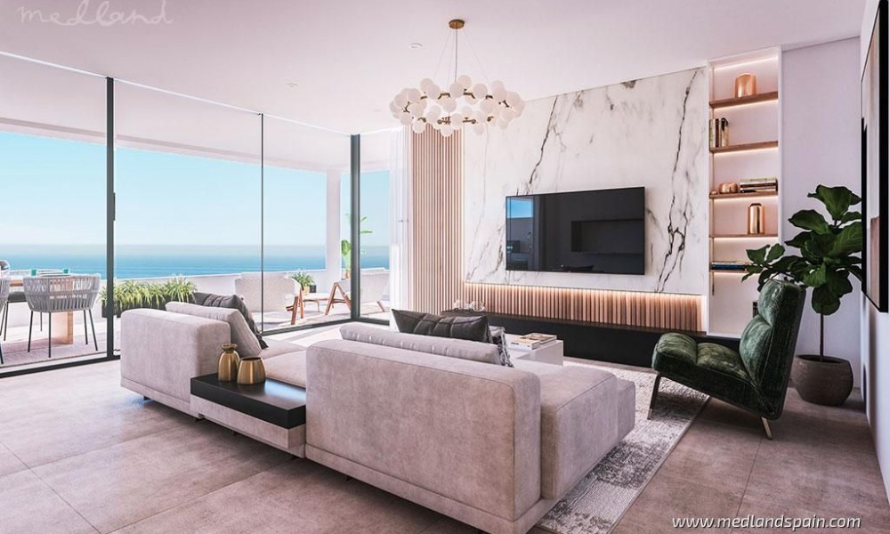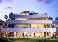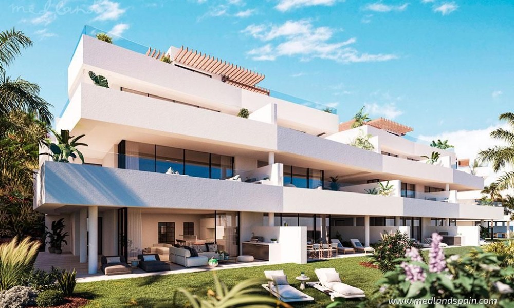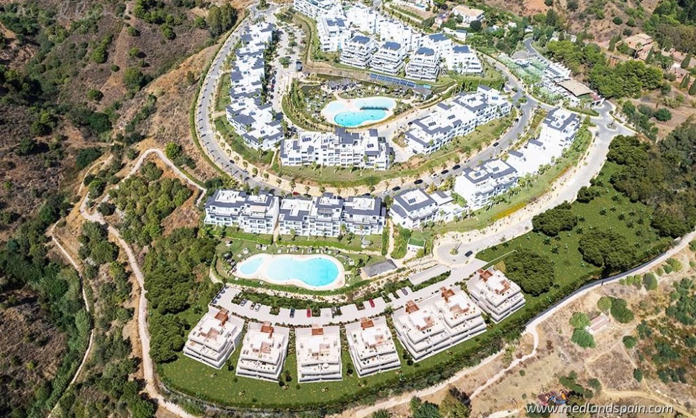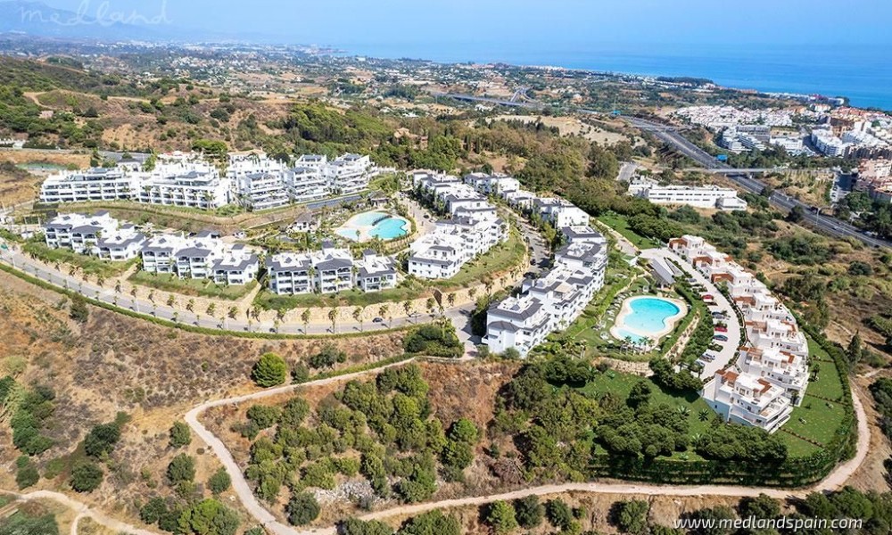 New apartment complex in an exclusive gated resort, only 800m from Estepona. The resort is surrounded by nature, with spectacular panorama views of the Sierre Bermeja mountains, the Mediterranean, Gibraltar, and the coast of Africa. Ideally situated in a peaceful environment, while being close to three major tourist areas of the Costa del Sol, like Estepona, Marbella, and Sotogrande. In addition to their huge selection of daily amenities, there are also a variety of leisure, sports activities, and restaurants. The prestigious La Duquesa Golf Club is only a few minutes’ drive from the resort.The complex comprises apartment blocks of three floors each, with apartments distributed on the ground and middle floors, and penthouses with a solarium. The apartments are available with 2, 3 and 4 bedrooms, and present an open plan lounge, dining and kitchen area, with access to a spacious terrace. The apartments are mostly South facing, offering spectacular panorama views of the surrounding area.