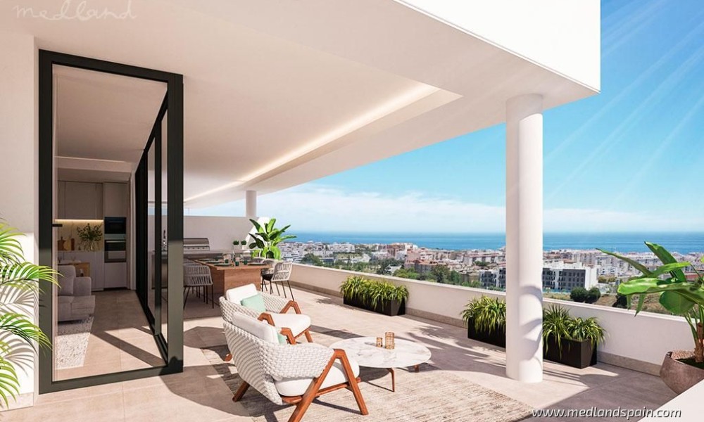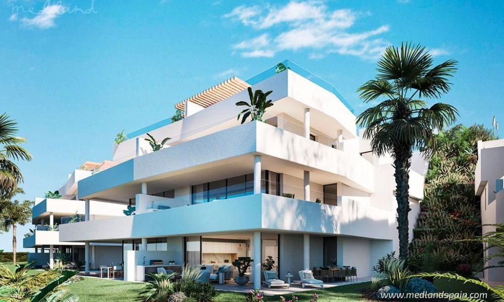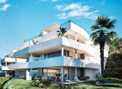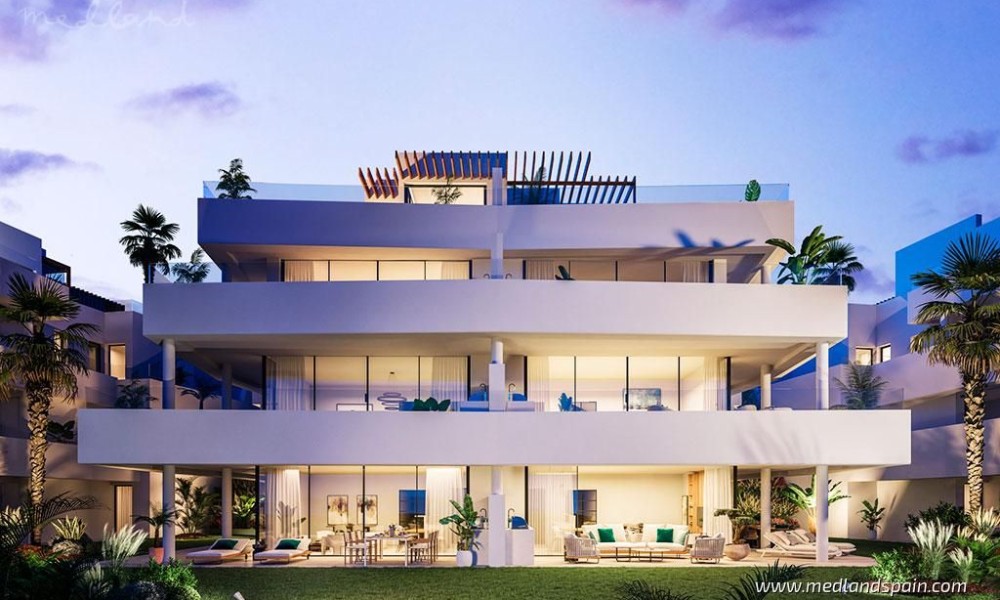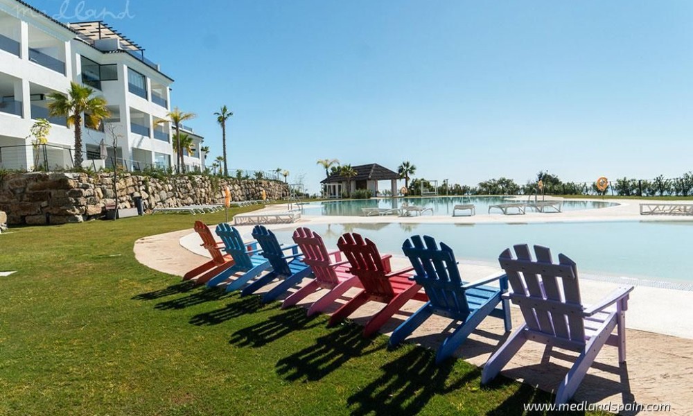New apartment complex in an exclusive gated resort, only 800m from Estepona. The resort is surrounded by nature, with spectacular panorama views of the Sierre Bermeja mountains, the Mediterranean, Gibraltar, and the coast of Africa. Ideally situated in a peaceful environment, while being close to three major tourist areas of the Costa del Sol, like Estepona, Marbella, and Sotogrande. In addition to their huge selection of daily amenities, there are also a variety of leisure, sports activities, and restaurants. The prestigious La Duquesa Golf Club is only a few minutes’ drive from the resort.The complex comprises apartment blocks of three floors each, with apartments distributed on the ground and middle floors, and penthouses with a solarium. The apartments are available with 2, 3 and 4 bedrooms, and present an open plan lounge, dining and kitchen area, with access to a spacious terrace. The apartments are mostly South facing, offering spectacular panorama views of the surrounding area.