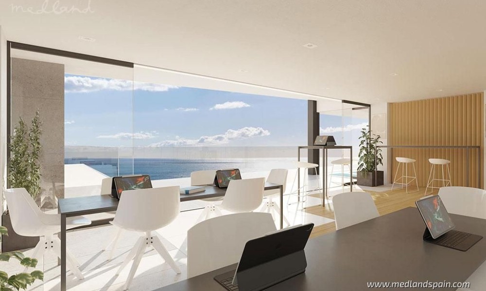 The master bedroom has a private bathroom, spacious dressing room, and access to the terrace. The penthouses include a guest toilet, and all the bedrooms have a private bathroom and dressing room. Built with high-end qualities and brands, the apartments include ducted A/C, Italian designer kitchen equipped with white goods, Smart Home system, video intercom, storage room, and two parking spaces with pre-installation for a charging station for electric cars. There are some customisation options available.This complex presents a large, enclosed area, with exceptional community facilities, both indoors and outdoors. The indoor facilities include a co-working space, a Pilates room, a gym, a sauna, Turkish bath, a massage room, roof terrace, heated pool, and a multi-function room. The Mediterranean climate can be enjoyed in the various outdoor areas, like the aromatic garden areas with a vertical garden, terraces with a bar, BBQ area, and the 110m2 pool with sun-lounging area. There is also an underground garage, with an area to park bicycles.