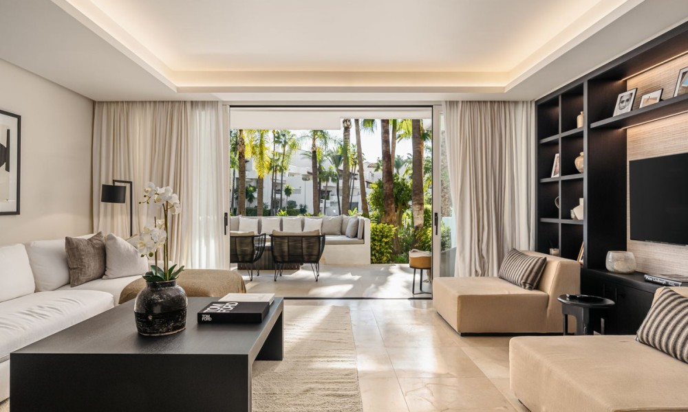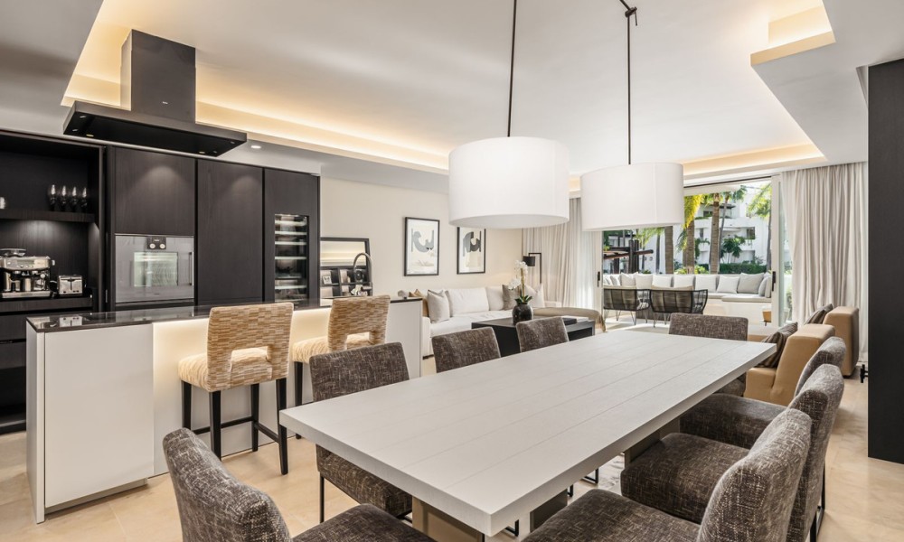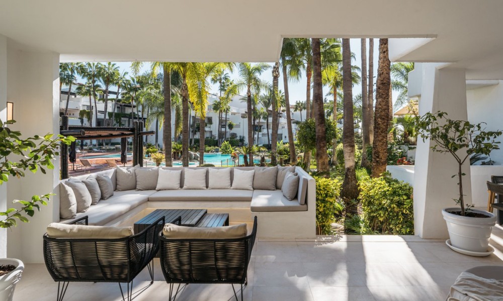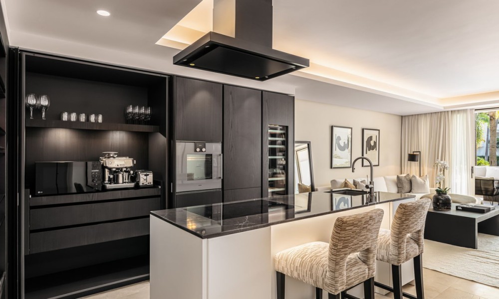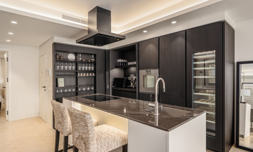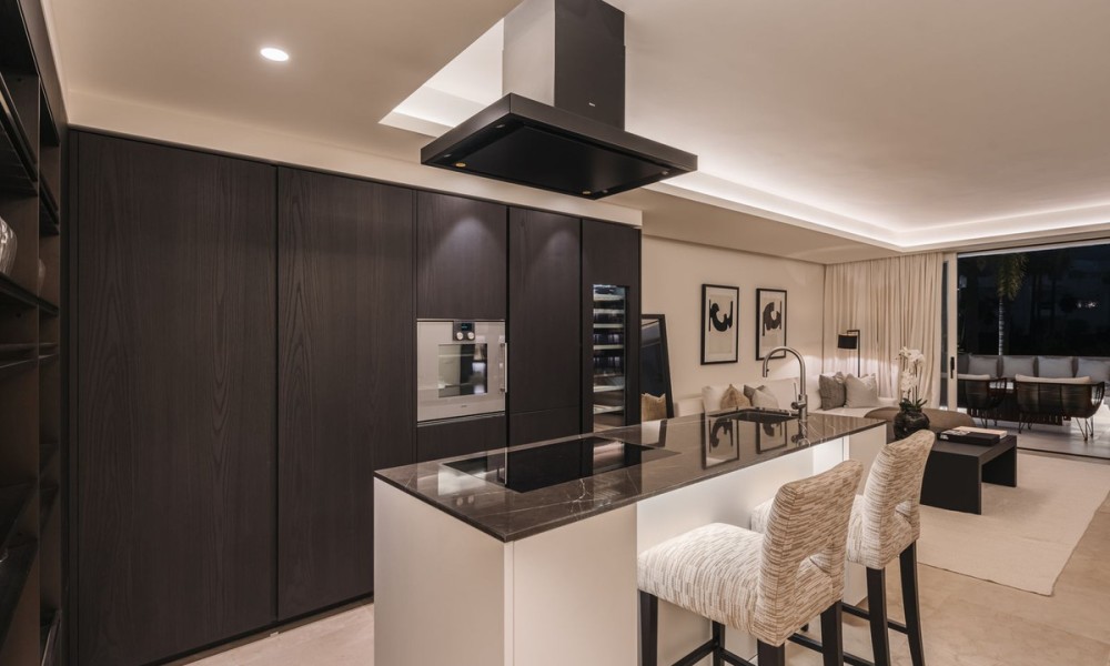 Luxurious three-bedroom apartment offers an exceptional living experience in one of Marbella’s most prestigious areas. Combining timeless elegance with modern comfort, this residence is perfectly suited for those seeking a refined yet welcoming atmosphere. With a southeast-facing orientation, the 188m² property boasts a thoughtfully designed open-plan layout. Upon entering, you are greeted by a state-of-the-art kitchen featuring custom oak cabinetry and premium Gaggenau appliances. The kitchen flows seamlessly into a stylish lounge area, which opens onto a spacious 48m² terrace. This outdoor space is perfect for alfresco dining and relaxation, offering tranquil views of the community pool.Each of the three bedrooms is designed with privacy and comfort in mind, featuring en-suite bathrooms finished with high-quality stone and bespoke wood details. These spaces exude a modern yet timeless aesthetic. Recently renovated in 2023, the apartment blends contemporary amenities with the charm of its original construction, delivering the best of both worlds.Located in an exclusive neighborhood along Marbella’s Golden Mile, this property provides unparalleled access to pristine beaches, world-class dining, and upscale recreational facilities.