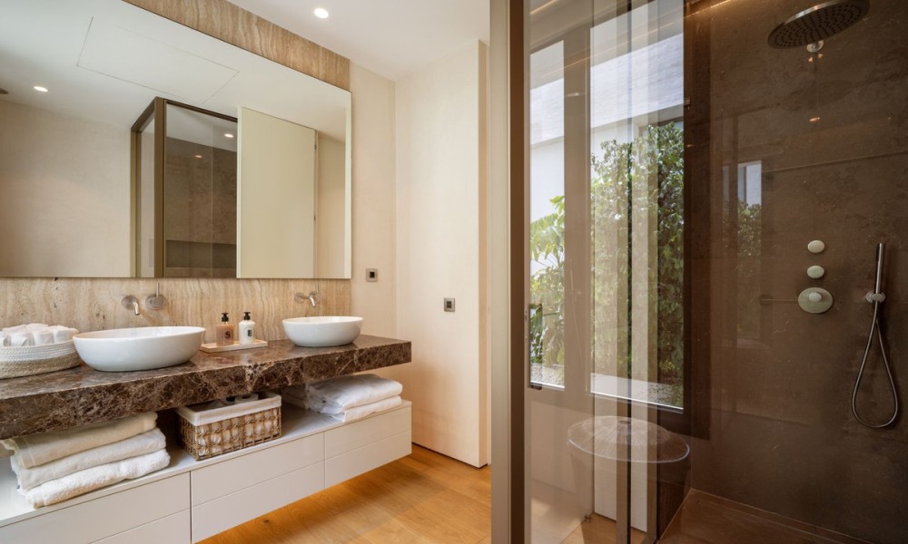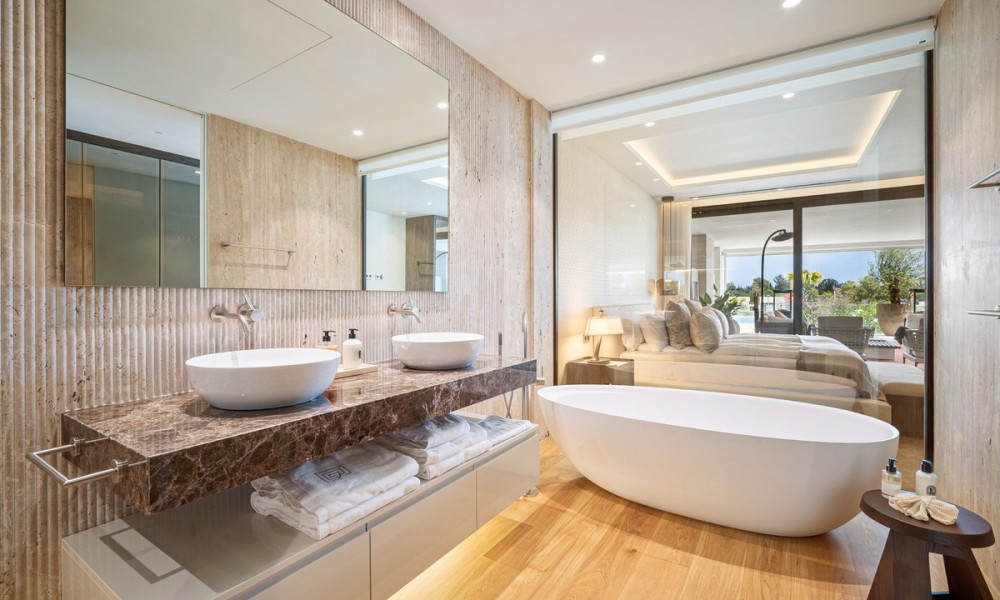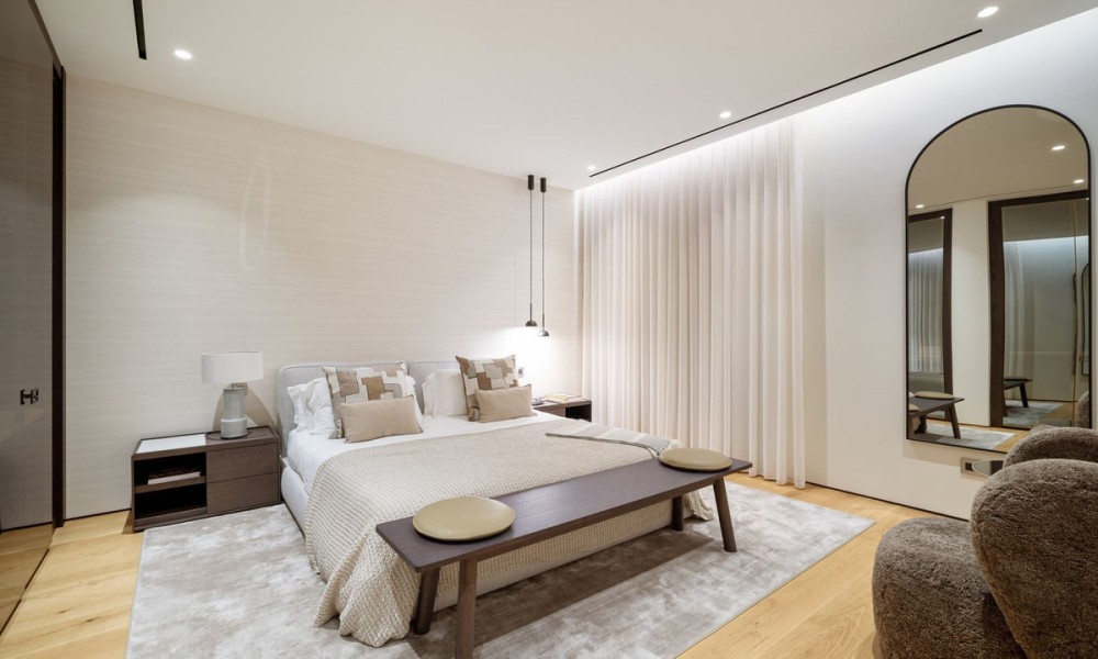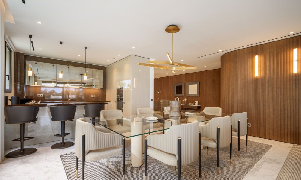 This impeccably crafted duplex ground floor residence is a statement in modern Mediterranean luxury, finished to the highest standards. Designed in collaboration with GC Studio and FENDI CASA, the interiors blend natural materials such as Travertine marble, Carrara stone, onyx, premium leather, and custom wood panelling. Every detail has been thoughtfully curated, with signature pieces by Gallotti & Radice and Giorgetti enhancing the home’s elegant, contemporary character.The home spans two levels, offering five en-suite bedrooms and a fluid layout designed for privacy and effortless living. A bright, open-concept living area seamlessly connects to the sleek, fully fitted kitchen and flows onto a spacious terrace by Minotti. Large-format glass windows invite in natural light and panoramic views, creating a warm, expansive ambiance.Three generously sized en-suite bedrooms are located on the main floor, all featuring custom wardrobes, smart home automation, and high-end finishes. The master suite enjoys direct access to the terrace and offers breathtaking views of La Concha and the Mediterranean.Two additional en-suite bedrooms are located on the lower level, providing privacy for guests or staff. This level also includes a separate entrance directly from the garage, enhancing accessibility and independence.The lower level features a large entertainment lounge fitted with a Bang & Olufsen home cinema system, custom cabinetry, and bespoke marble furnishings. It’s a sophisticated space designed for hosting or relaxing in style.The property is part of the exclusive Marbella development, which provides access to a full suite of resort-level amenities. These include a luxurious spa, heated indoor pool, and a state-of-the-art wellness centre offering yoga, Pilates, boxing, golf simulation, and The expansive private terrace features a fully equipped outdoor kitchen, heated lounge area, and stylish dining zone—all framed by serene sea and mountain views.