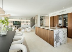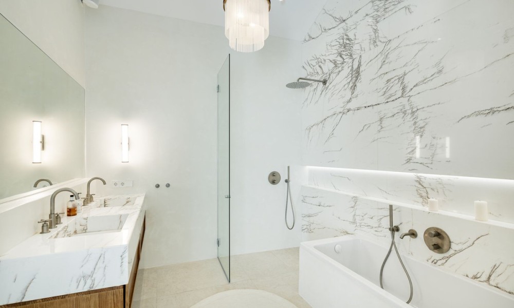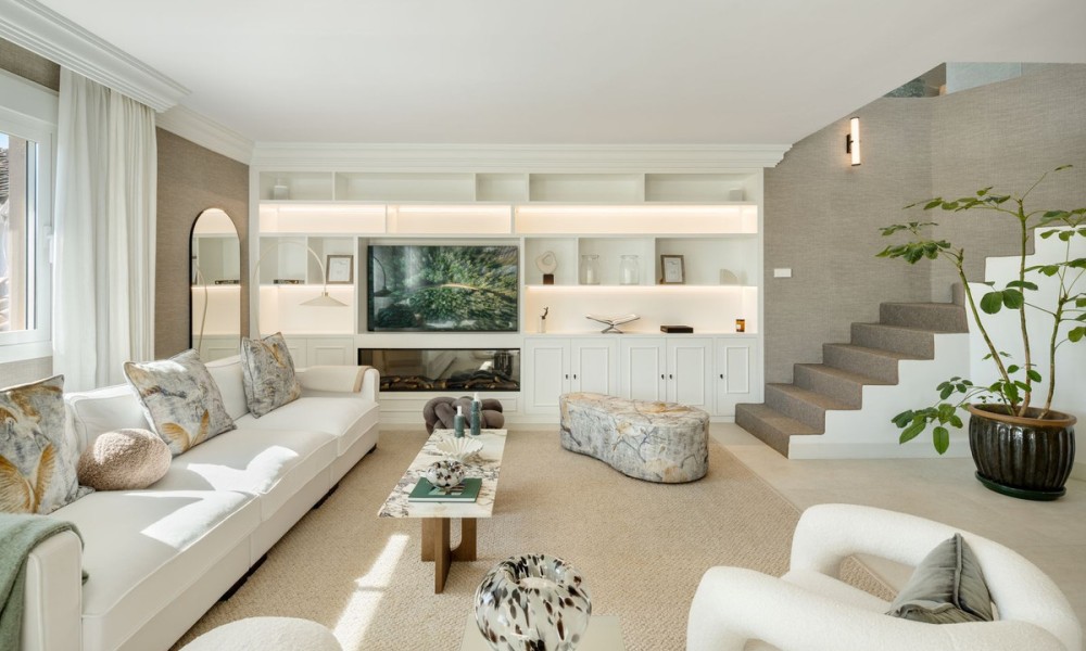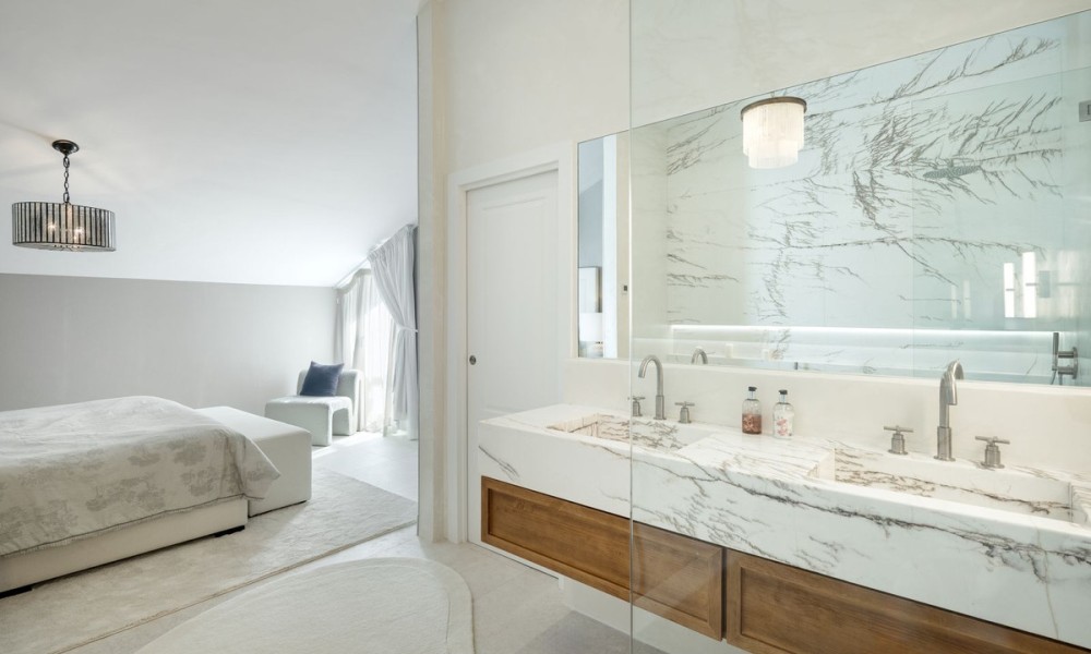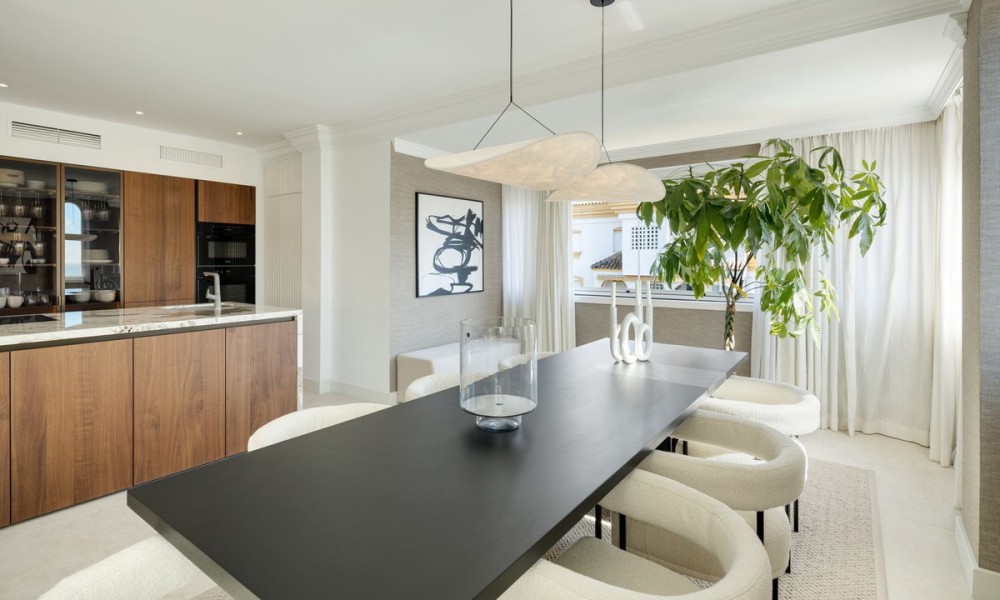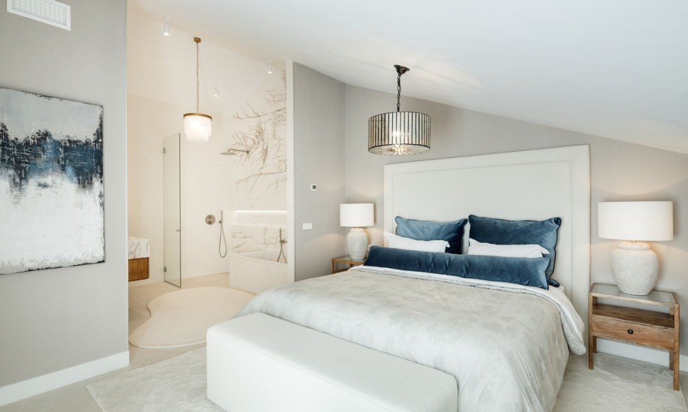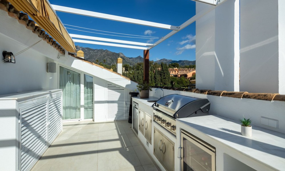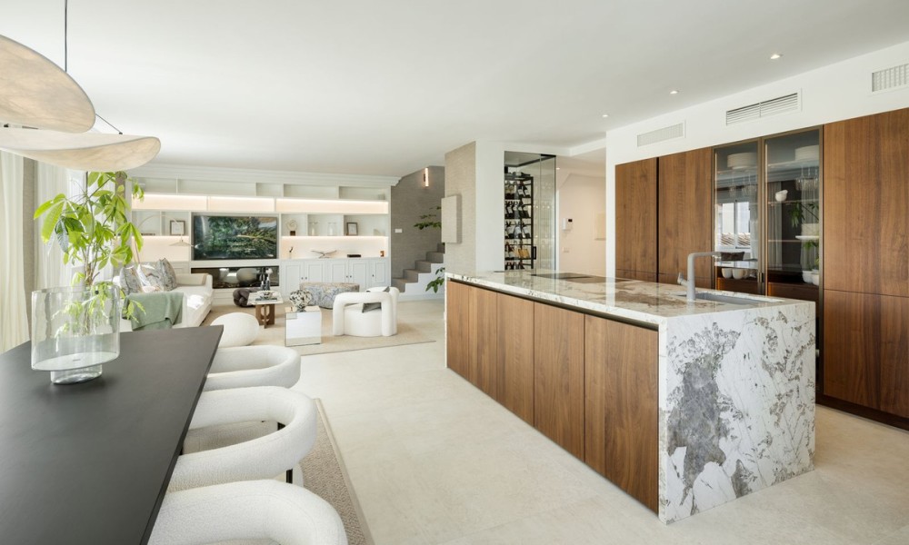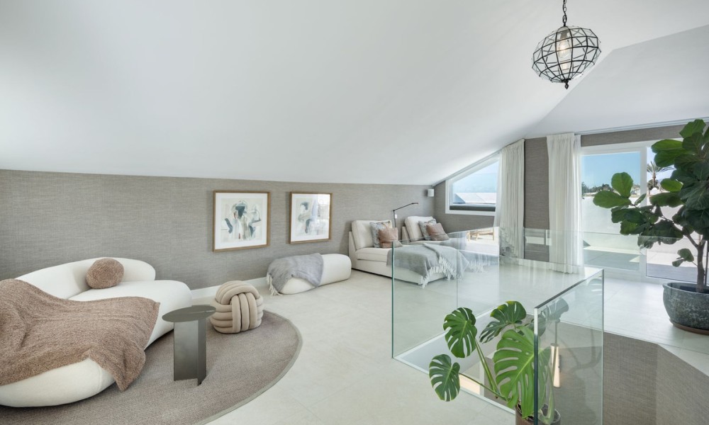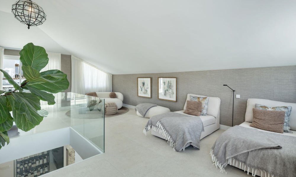 This exceptional duplex penthouse embodies modern sophistication with clean architectural lines, luxurious finishes, and open-concept interiors. Every element is curated for refined coastal living, from the striking marble kitchen island to bespoke wooden cabinetry and designer lighting. The residence sits within an exclusive development in Marbella’s prestigious Golden Mile, one of the most sought-after locations in Southern Europe.Designed with fluidity and natural light in mind, the open-plan layout seamlessly integrates the kitchen, dining, and living areas into one expansive space. Large windows and glass doors lead directly to generous terraces, enhancing the sense of indoor-outdoor living and offering unobstructed views toward the Mediterranean Sea and surrounding mountains.The home offers five elegant bedrooms and four and a half bathrooms. The master suite stands out with a custom walk-in wardrobe and a luxurious en-suite bathroom, offering privacy, comfort, and stunning views. Each bedroom is thoughtfully designed to balance relaxation and contemporary style.The upper-level terrace is an entertainment haven, featuring an intimate lounge area perfect for sunset cocktails or relaxed evenings under the stars. A fully integrated outdoor kitchenette and BBQ area enhances alfresco dining, while the spacious indoor areas are ideal for gatherings both casual and formal.A private jacuzzi on the terrace offers a serene space to unwind while enjoying panoramic views. The setting, surrounded by Marbella’s most luxurious resorts and wellness clubs, ensures access to world-class spa experiences, fitness centres, and beachside amenities just moments away.
