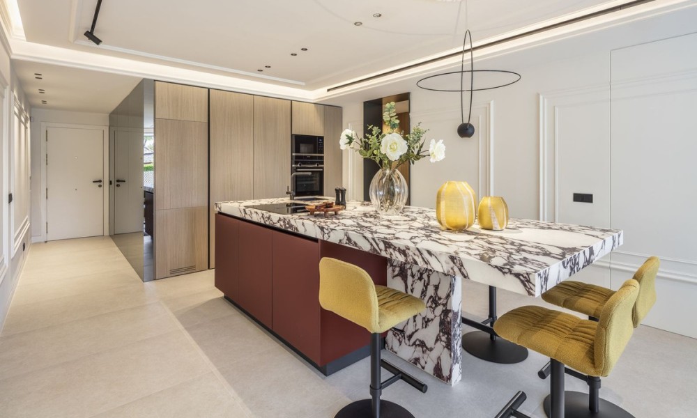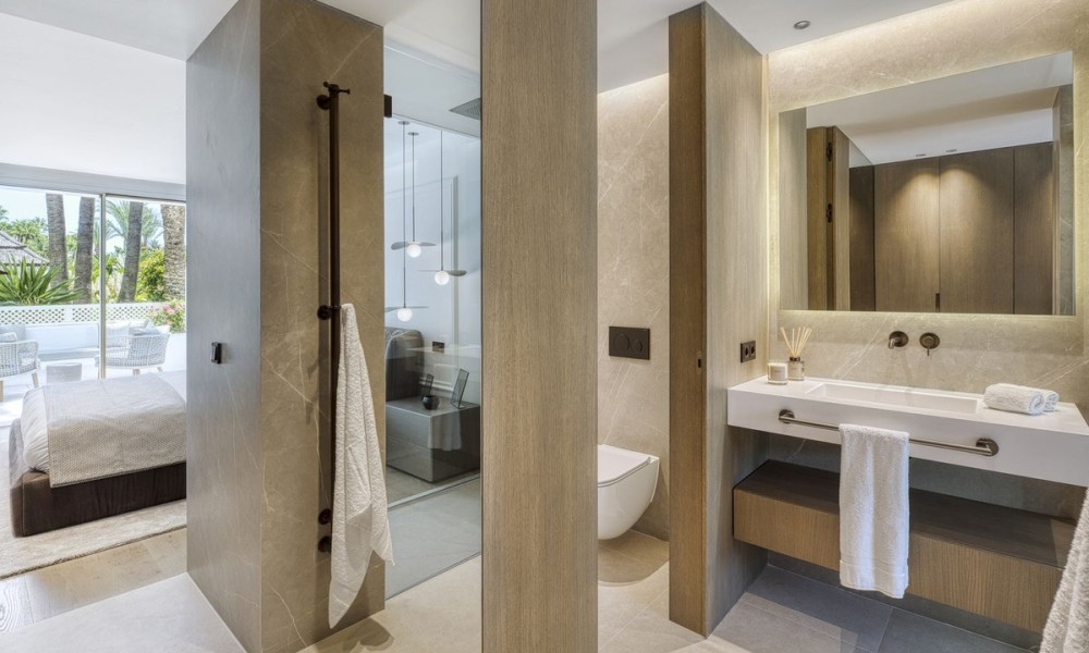 Meticulously refurbished by INHABIT Architects, this ground-floor apartment blends timeless elegance with contemporary design. Crafted using high-end materials such as large-format tiles from Porcelanosa and bespoke wooden carpentry, the interiors exude refined comfort. The layout and finishes are elevated by a calm, neutral colour palette and curated furnishings, all chosen to reflect effortless sophistication.The open-plan layout seamlessly connects the living room, dining space, and bespoke kitchen. Floor-to-ceiling aluminium windows by Cortizo flood the home with natural light and provide direct access to the private terrace, enhancing the sense of indoor-outdoor harmony. The living area is styled with impeccable taste, offering a serene environment for relaxation or entertaining.The property features three beautifully appointed bedrooms, all with top-quality wooden flooring, bespoke wardrobes, and individual air conditioning. The master suite is the standout, offering direct access to the terrace, a luxurious en-suite bathroom with underfloor heating, and high-spec fixtures that elevate the daily experience.Designed for comfort and privacy, the guest bedrooms each follow a distinct design concept, maintaining elegance while offering individual character. Though compact, the apartment’s layout ensures all bedrooms are generously spaced and functionally positioned.The apartment’s private terrace serves as an ideal setting for hosting guests or enjoying alfresco dining. Overlooking the tranquil resort gardens, it is perfectly oriented to receive sunlight throughout the day. The space is designed to transition easily between day lounging and evening gatherings.