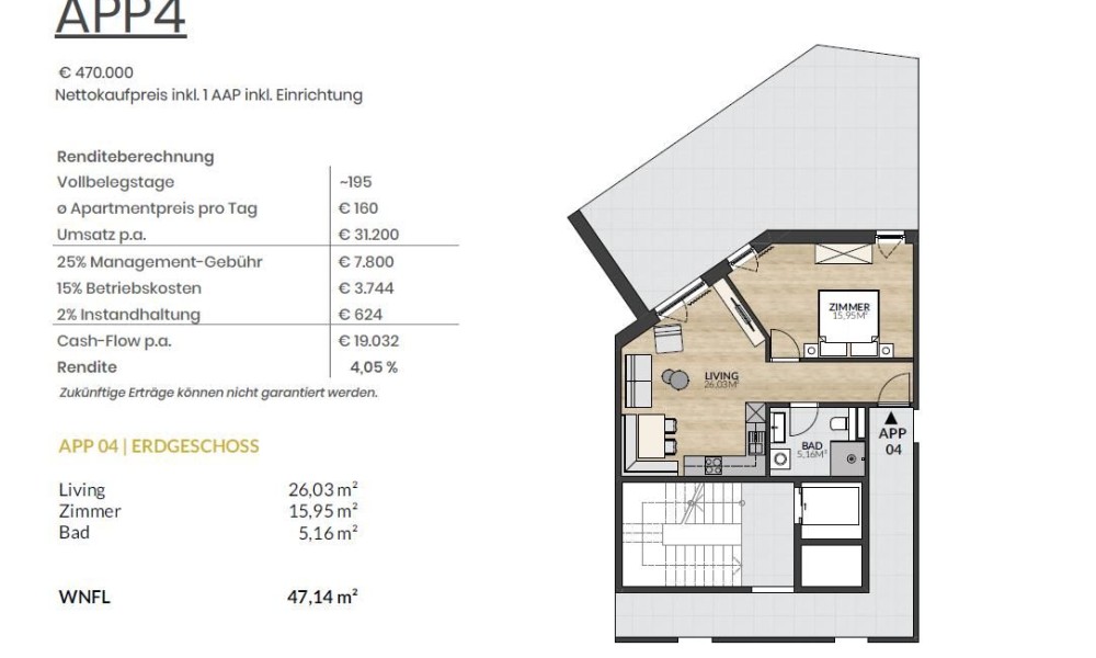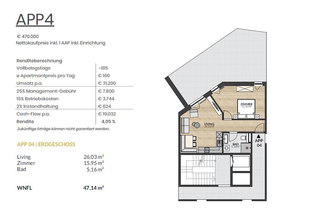 – Fiss – Amsterdam – 922 km – 9.4 hours by carFlat 04 is located on the ground floor and has a living space of 44.61 m². The well thought-out room layout offers maximum living comfort: