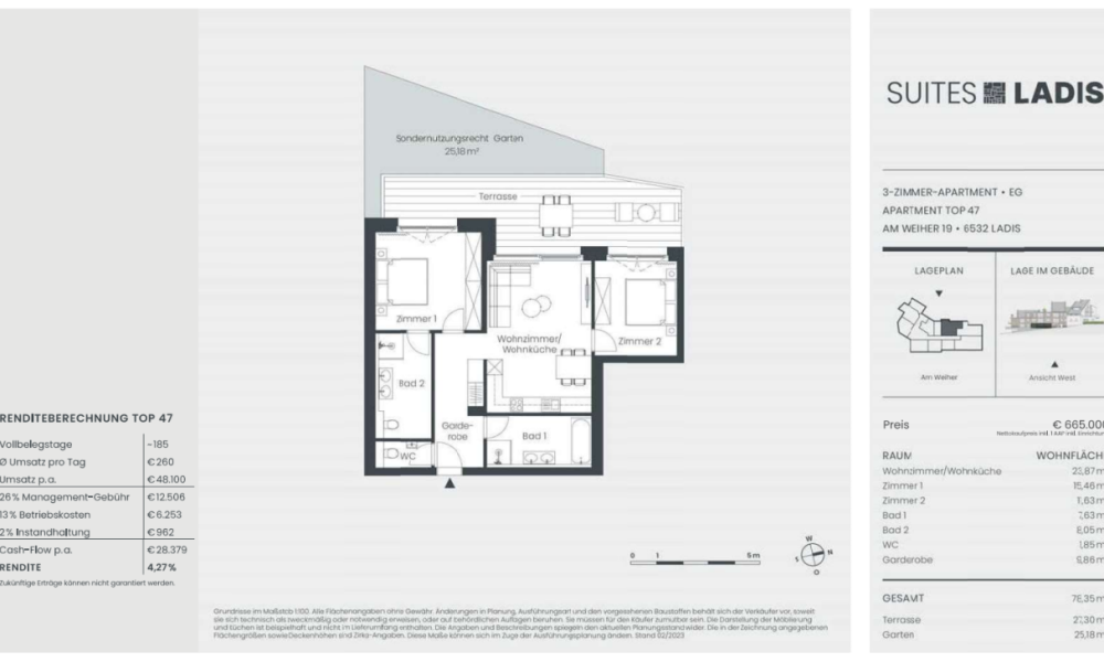 The SUITES LADIS on the Serfaus-Fiss-Ladis sun terrace combine the highest standards of quality and comfort with Tyrol’s unique nature and close ties to its homeland to create an investment with impressive prospects of success. 60 exclusive SUITES, spread over 5 floors, are available for sale. The SUITES LADIS are fully equipped and impress with their exclusive design and outstanding quality down to the smallest detail.in this case we present you a 3-room suite with 78,35m² and a beautiful 27,30m² terrace with 25,18m² garden.do not hesitate to contact us, we are always at your disposal for any questions! the property on offer is a tourist investment, which is rented to changing guests via a renowned operating company. Purchase price net 642.500,00€Furnishings net 50.000,00€TGAAP net 30.000,00€______________________________________Total price net 722.500,00€Additional purchase costs:According to supplement and in particular3,5 % land transfer tax1,1 % land register entry fee3% plus VAT. Estate agent’s feeCosts for drawing up the purchase contract and trusteeship according to the lawyer’s tariff plus cash expensesWelcome to the sunny side of the Tyrolean holiday world: On a sunny high plateau above the Tyrolean Oberinntal, surrounded by impressive 3,000 metre peaks, the small village of Ladis offers a unique holiday experience.