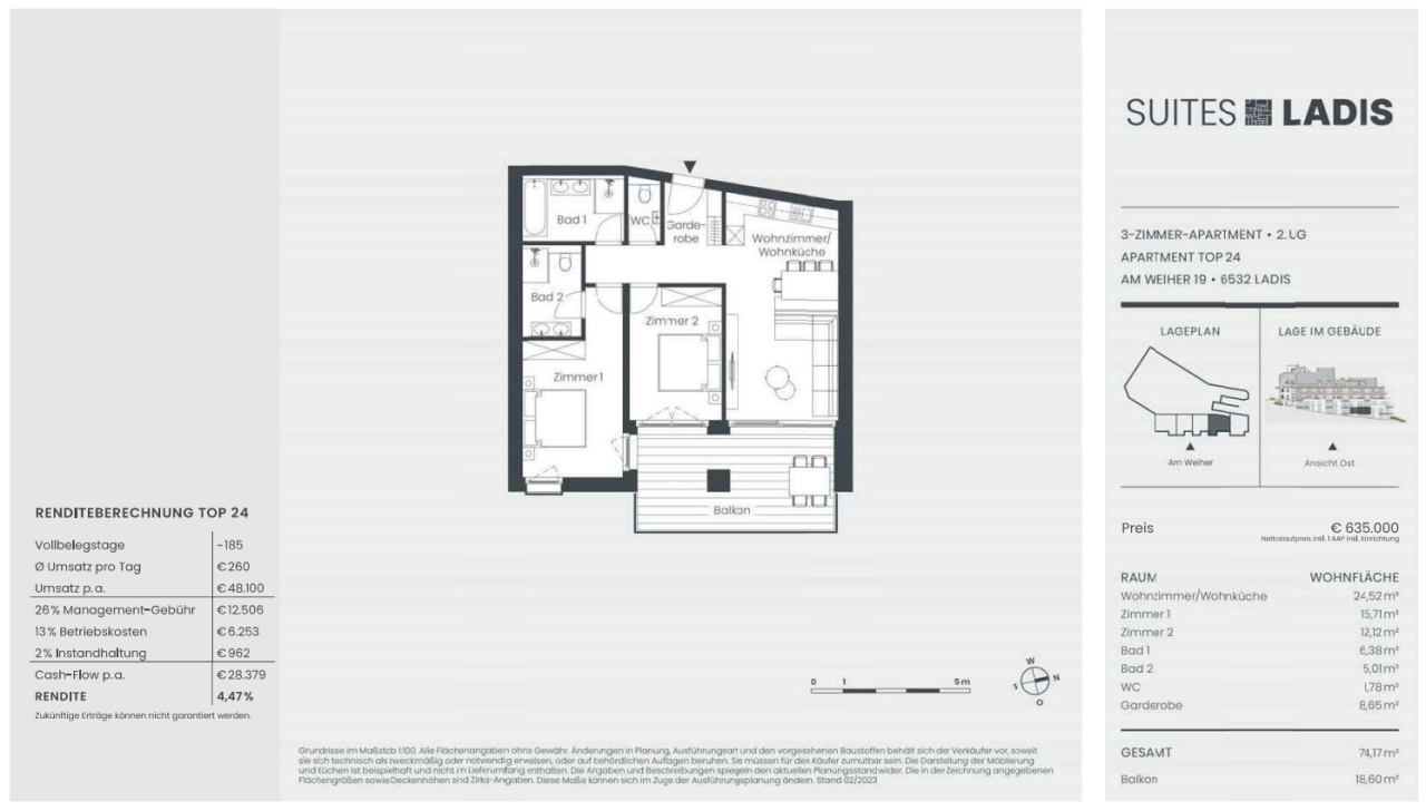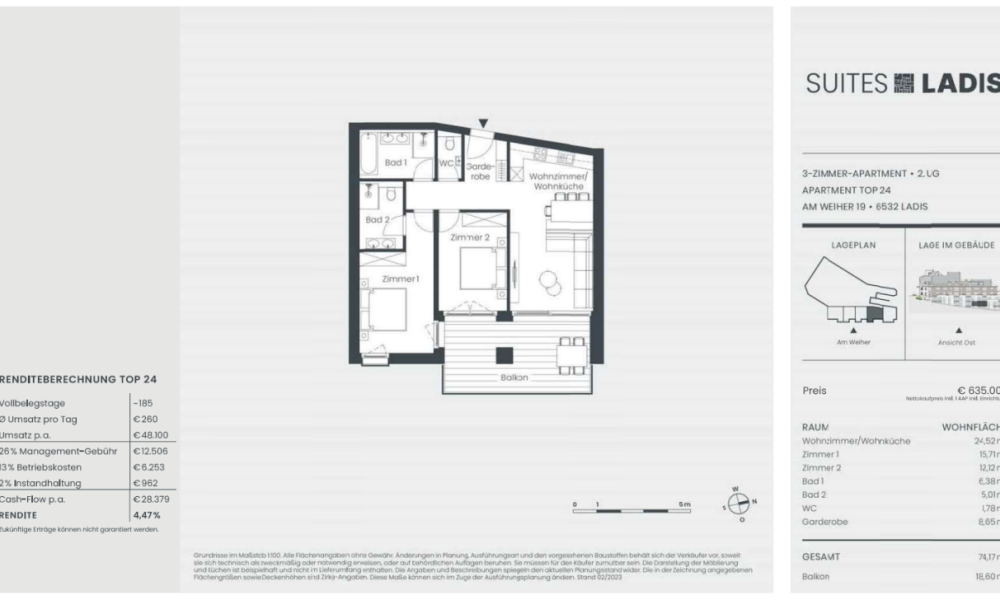 Brokerage costsCosts for drawing up the purchase agreement and mandatory administration according to the lawyer’s rate plus cash costs.Location Welcome to the sunny side of the Tyrolean holiday world: On a sunny high plateau above the Tyrolean Oberinntal, surrounded by impressive 3,000-metre peaks, the small village of Ladis offers a unique holiday experience. The tourist region Serfaus-Fiss-Ladis is a trendsetter in terms of family-friendliness. It is known for its excellent winter scenery with a balanced piste landscape, varied summer highlights amid impressive mountain landscapes – and for more than 2,000 hours of sunshine per year.