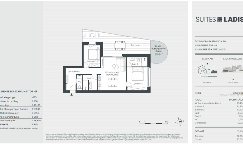 The SUITES LADIS on the Serfaus-Fiss-Ladis sun terrace combine the highest standards of quality and comfort with Tyrol’s unique nature and close ties to its homeland to create an investment with impressive prospects of success. 60 exclusive SUITES, spread over 5 floors, are available for sale. The SUITES LADIS are fully equipped and impress with their exclusive design and outstanding quality down to the smallest detail.in this case we present you the unique 3-room suite with a living space of 77,83m² and a fantastic 33,73m² sun terrace.do not hesitate to contact us, we are always at your disposal for questions! the property on offer is a tourist investment, which is rented to changing guests via a renowned operating company. Net purchase price €645,000.00Net furnishings €40,000.00Net TGAAP €30,000.00______________________________________Total net price €715,000.00Additional purchase costs:According to the supplement and in particular3.5% land transfer tax1.1% land register entry fee3% plus VAT. Estate agent’s feeCosts for drawing up the purchase contract and trusteeship according to the lawyer’s tariff plus cash expensesWelcome to the sunny side of the Tyrolean holiday world: On a sunny high plateau above the Tyrolean Oberinntal, surrounded by impressive 3,000 metre peaks, the small village of Ladis offers a unique holiday experience.