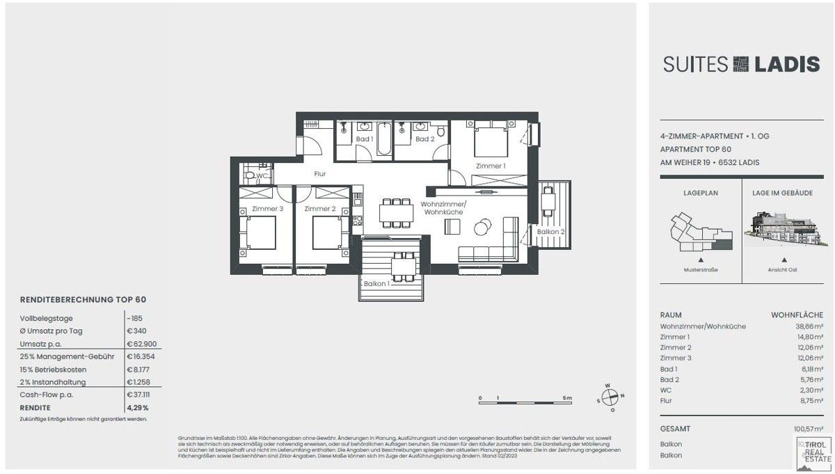 The SUITES LADIS on the Serfaus-Fiss-Ladis sun terrace combine the highest standards of quality and comfort with Tyrol’s unique nature and close ties to its homeland to create an investment with impressive prospects of success. 60 exclusive SUITES, spread over 5 floors, are available for sale. The SUITES LADIS are fully equipped and impress with their exclusive design and outstanding quality down to the smallest detail.in this case we present you the luxurious 4-room suite with a living space of 100.57m² and two fantastic balconies.do not hesitate to contact us, we are always at your disposal for any questions! the property on offer is a tourist investment, which is rented out to changing guests via a renowned operating company.