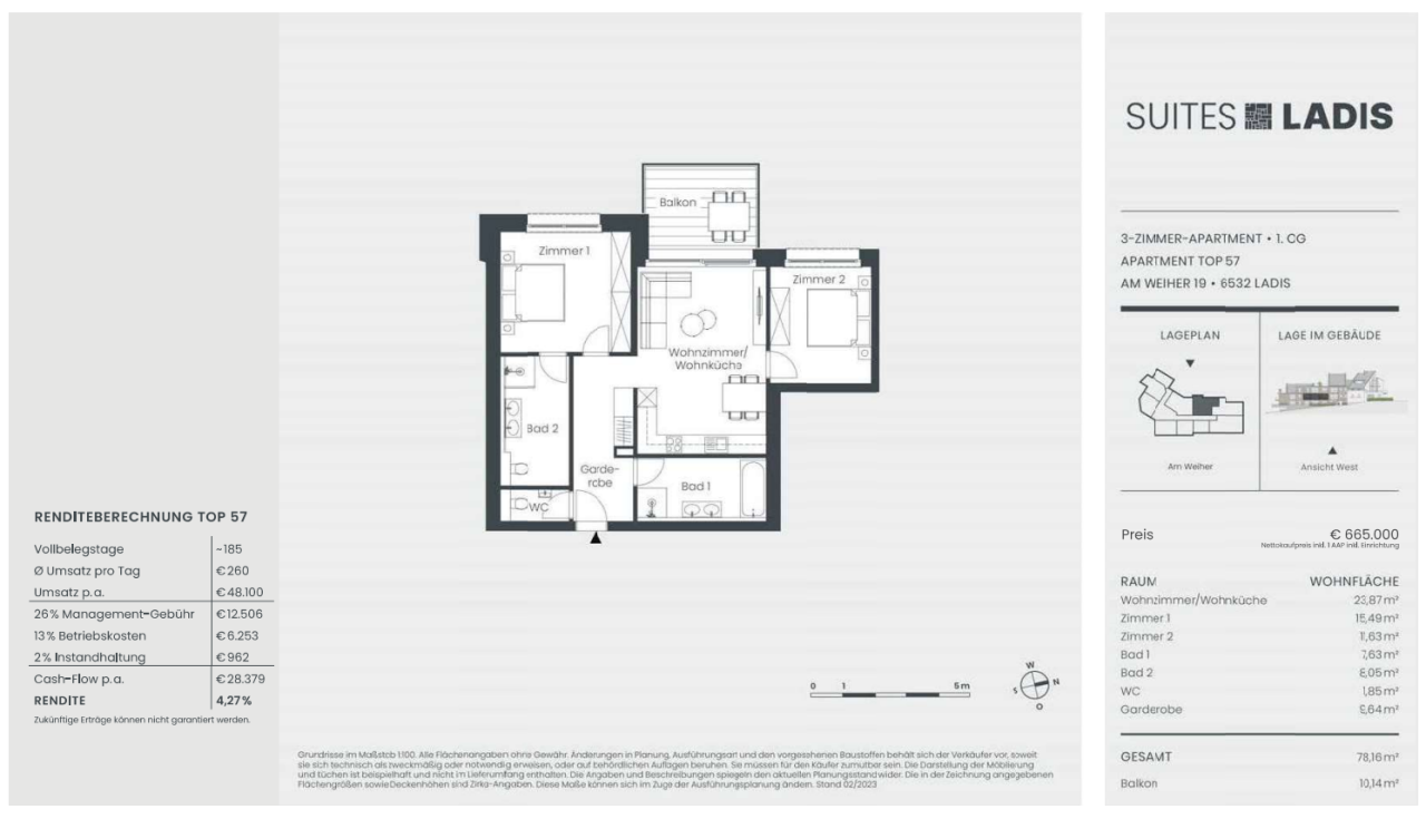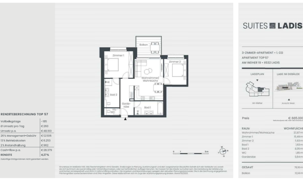 The SUITES LADIS on the Serfaus-Fiss-Ladis sun terrace combine the highest standards of quality and comfort with Tyrol’s unique nature and homeland to create a capital investment with impressive prospects of success. 60 exclusive SUITES, spread over 5 floors, are available for sale. The SUITES LADIS are fully equipped and impress with their exclusive design and outstanding quality down to the smallest detail, and in this case we are presenting the elegant 3-room suite with a living space of 78,16m² and a fantastic 10.14m² balcony. Please do not hesitate to contact us, we will be happy to answer any questions you may have! The property on offer is a tourist investment, which is rented to changing guests via a renowned operating company. Purchase price net 642.500,00€Furnishings net 50.000,00€TGAAP net 30.000,00€______________________________________Total price net 722.500,00€Additional purchase costs:According to the supplement and in particular3,5 % land transfer tax1,1 % land register entry fee3% plus VAT. Estate agent’s feeCosts for drawing up the purchase contract and trusteeship according to the lawyer’s tariff plus cash expensesWelcome to the sunny side of the Tyrolean holiday world: On a sunny high plateau above the Tyrolean Oberinntal, surrounded by impressive 3,000 metre peaks, the small village of Ladis offers a unique holiday experience.