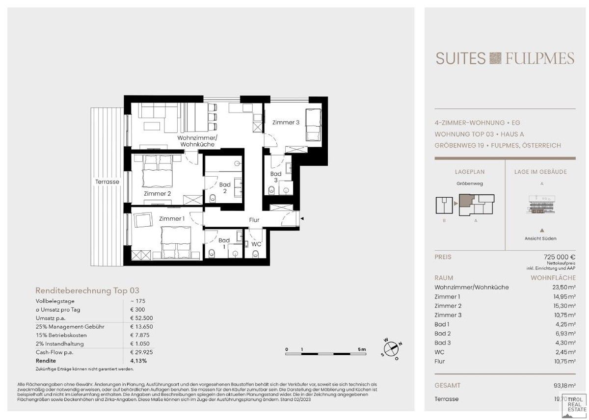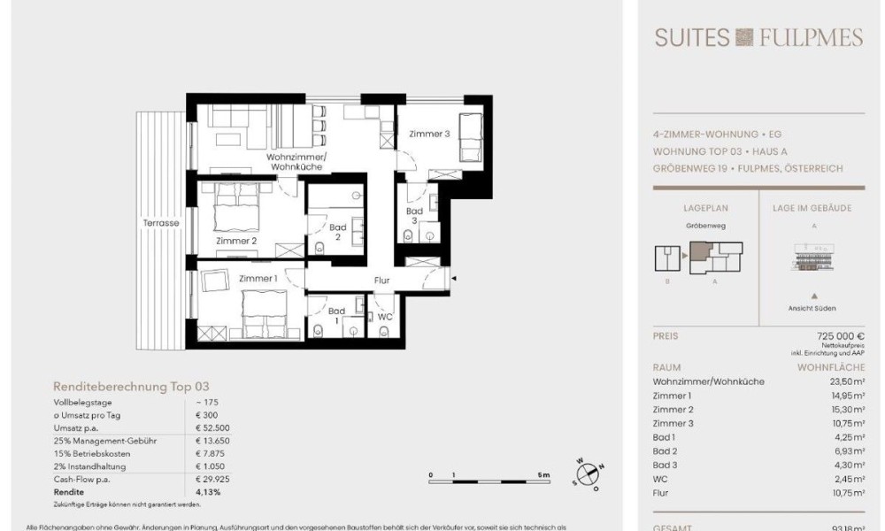A fitness room I ‘Stubai Mountain Gym’ and an exclusive fireplace lodge I ‘Stubai Mountain Fireplace Lodge’ complete the extraordinary offer.The property offered is a tourist investment, which is rented out to changing guests by the renowned operating company ALPS RESORTS (market leader in the DACH region of the Alps).Net purchase price €660,000.00